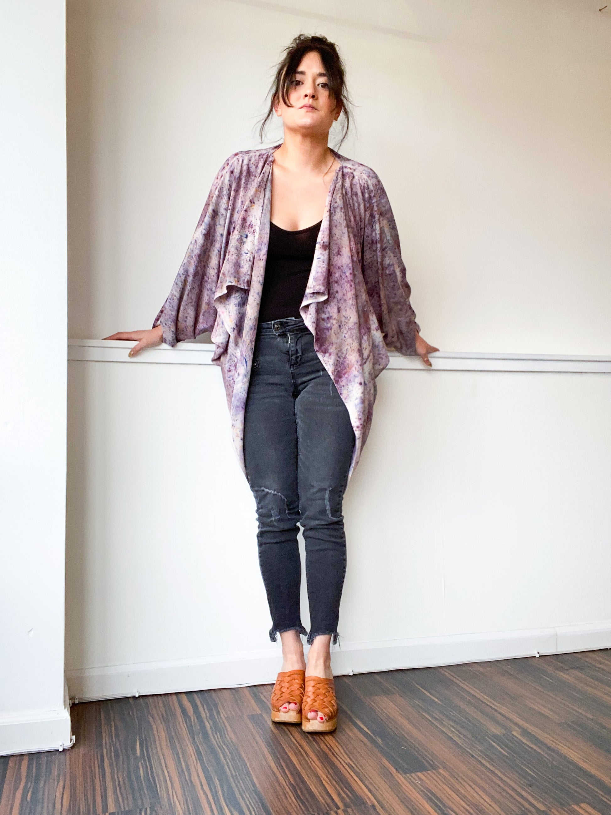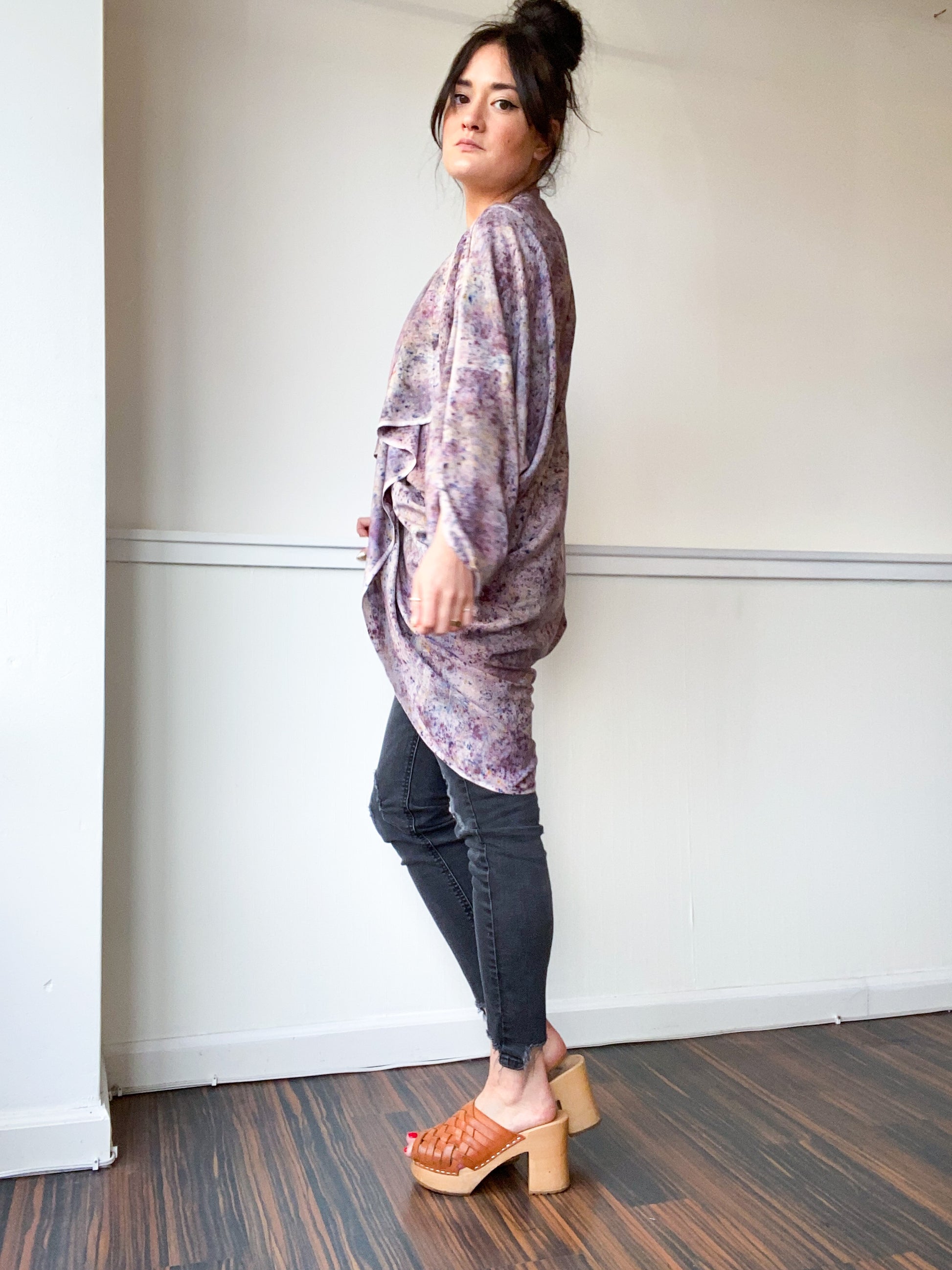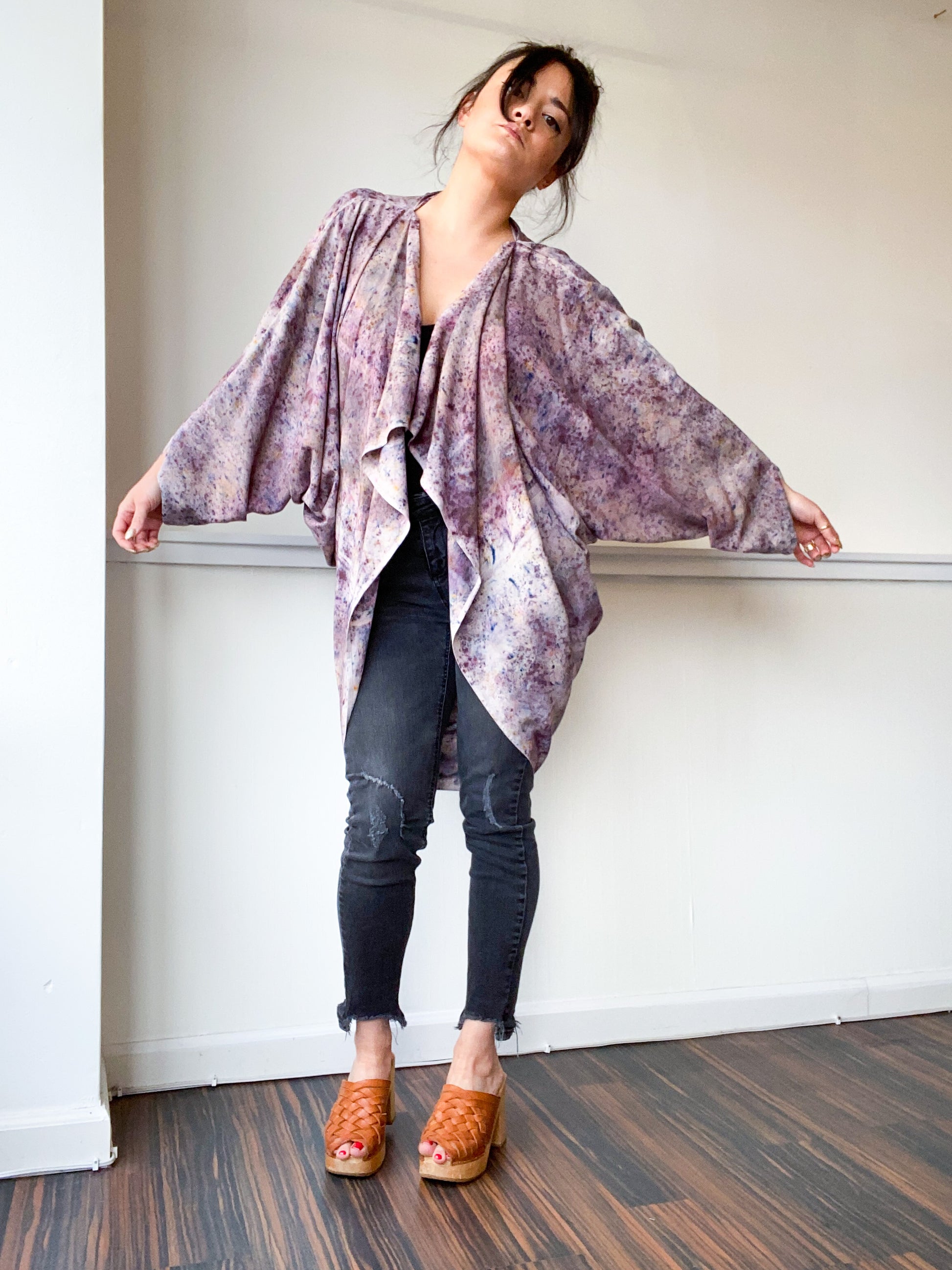 Soft and airy kimono with a flowing waterfall drape in front, oversized dolman sleeves and curved high low hem. Perfect styled as a dressy cardigan over jeans or leggings. The minimalist design created from a full rectangle of fabric drapes beautifully over the shoulders and produces little to no material waste by utilizing on whole piece of fabric without scraps from corners and irregular cuts. Lightweight woven fabric is hand-dyed in a multicolor speckle print using an original technique, capturing each pigment that combines to create the color grey the moment it touches the fabric.