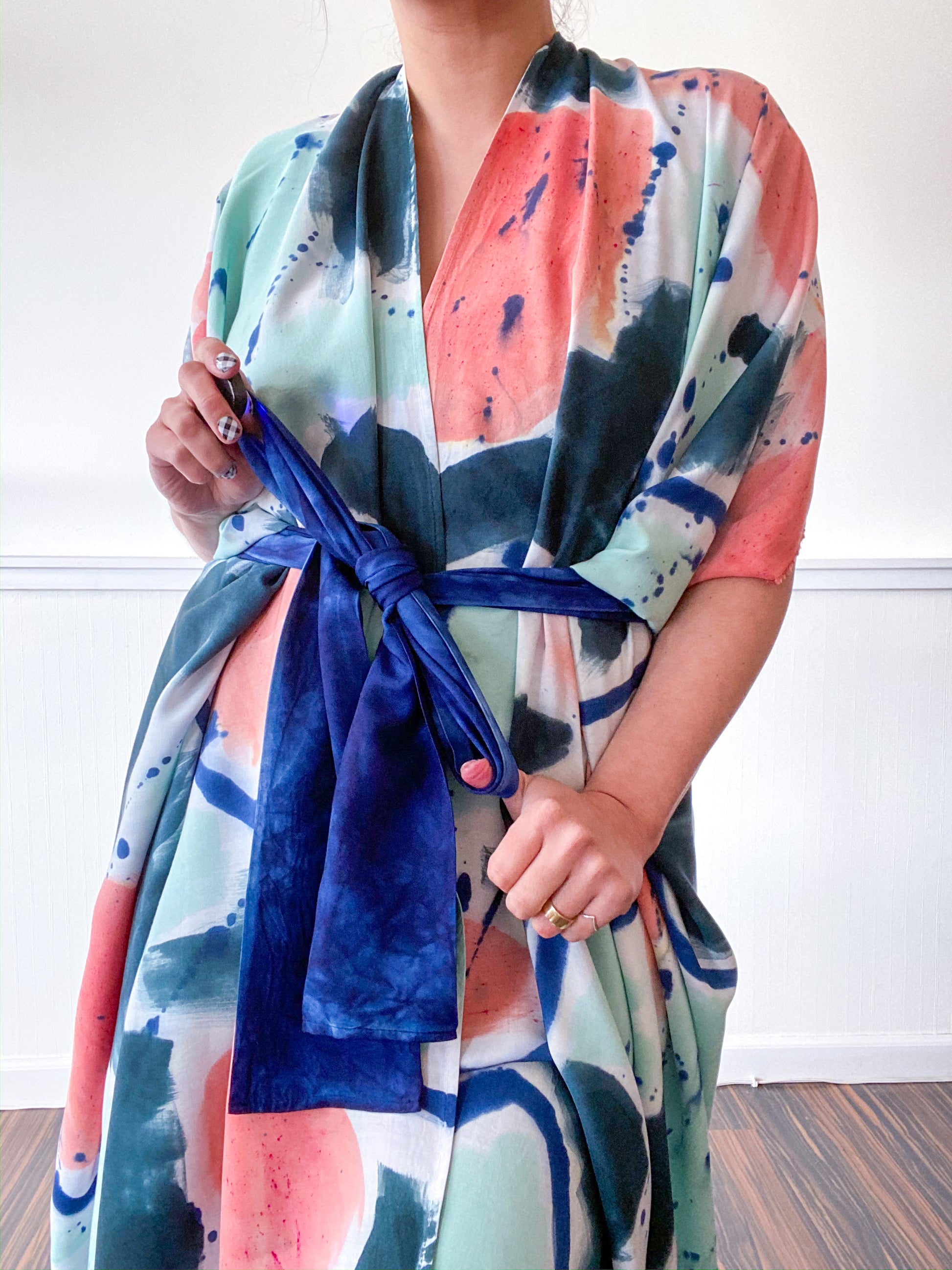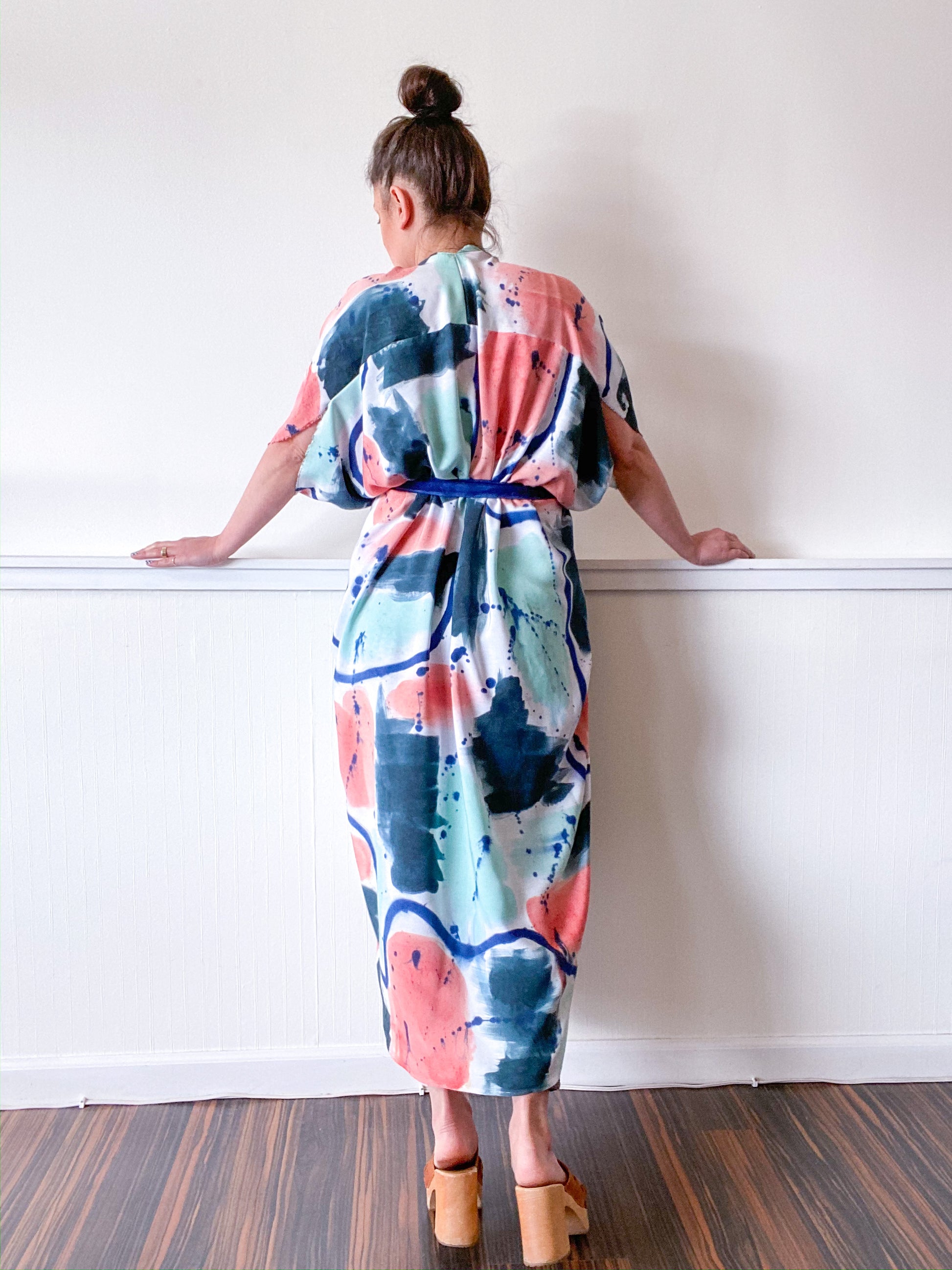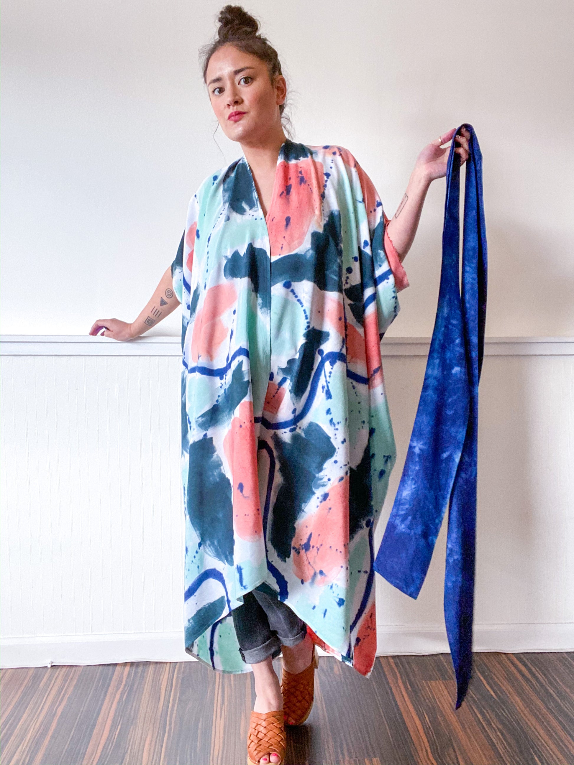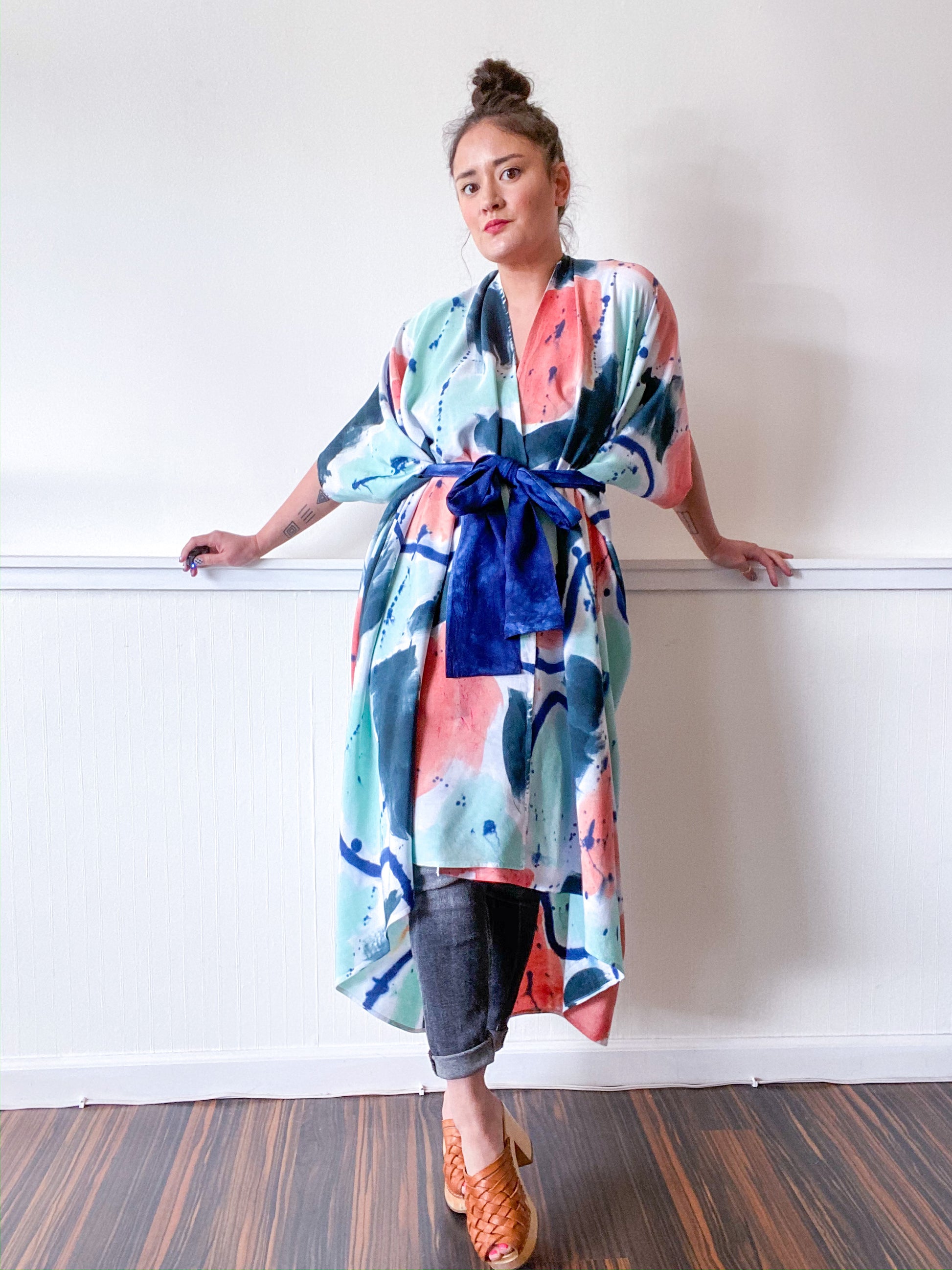 Soft and airy kimono with a flowing silhouette, fringed selvage sleeve detail, curved high low hem and marigold waist tie. Versatile shape can be styled as a wrap dress, lightweight jacket over jeans, or an elegant robe over lingerie. The minimalist design created from a full rectangle of fabric drapes beautifully over the shoulders and produces no material waste by utilizing one whole piece of fabric without scraps from corners and irregular cuts. Lightweight woven fabric is hand painted with an abstract rectangle, line and splatter pattern using algae thickened dyes in teal, indigo, pink and seafoam hues.