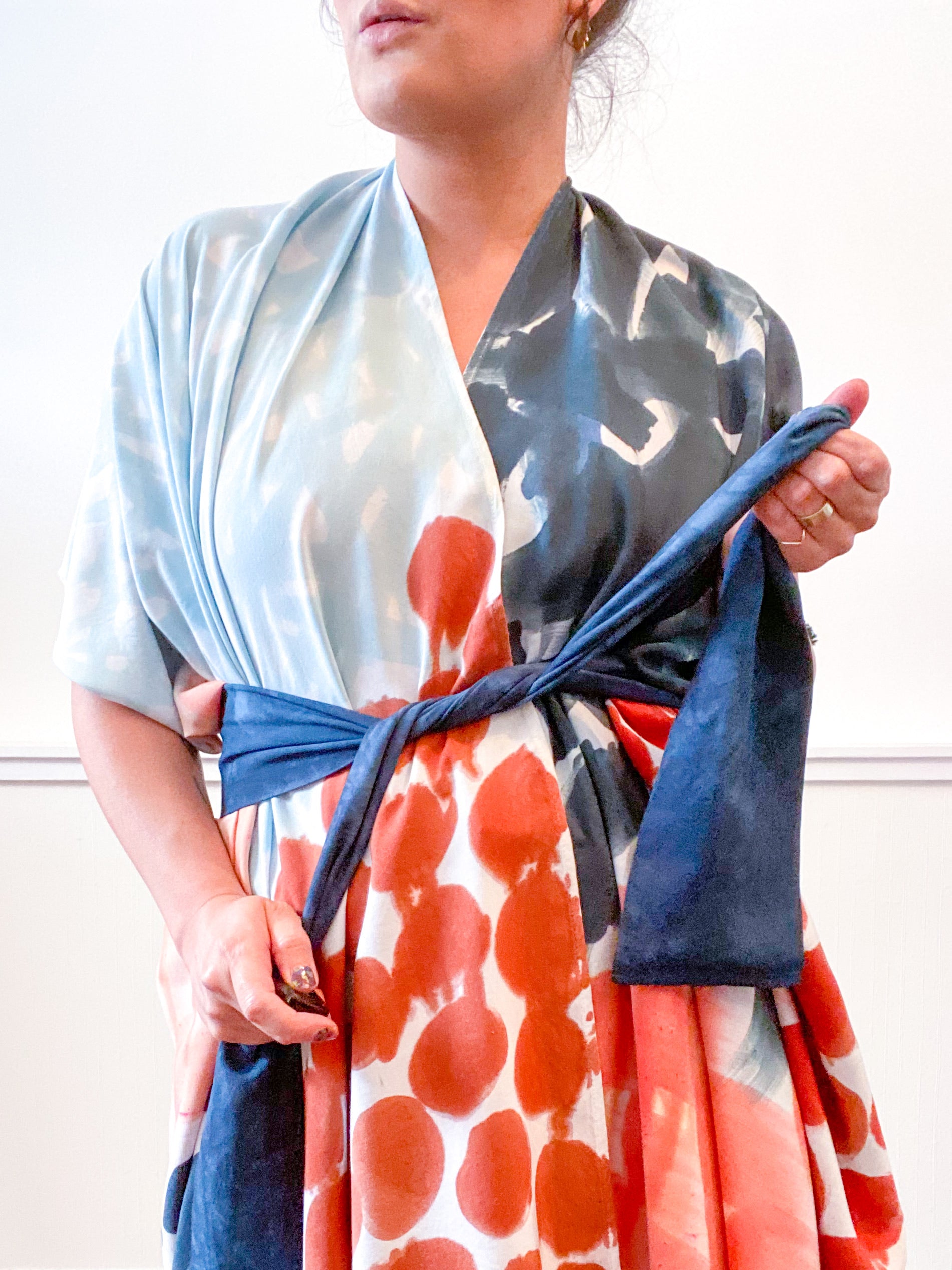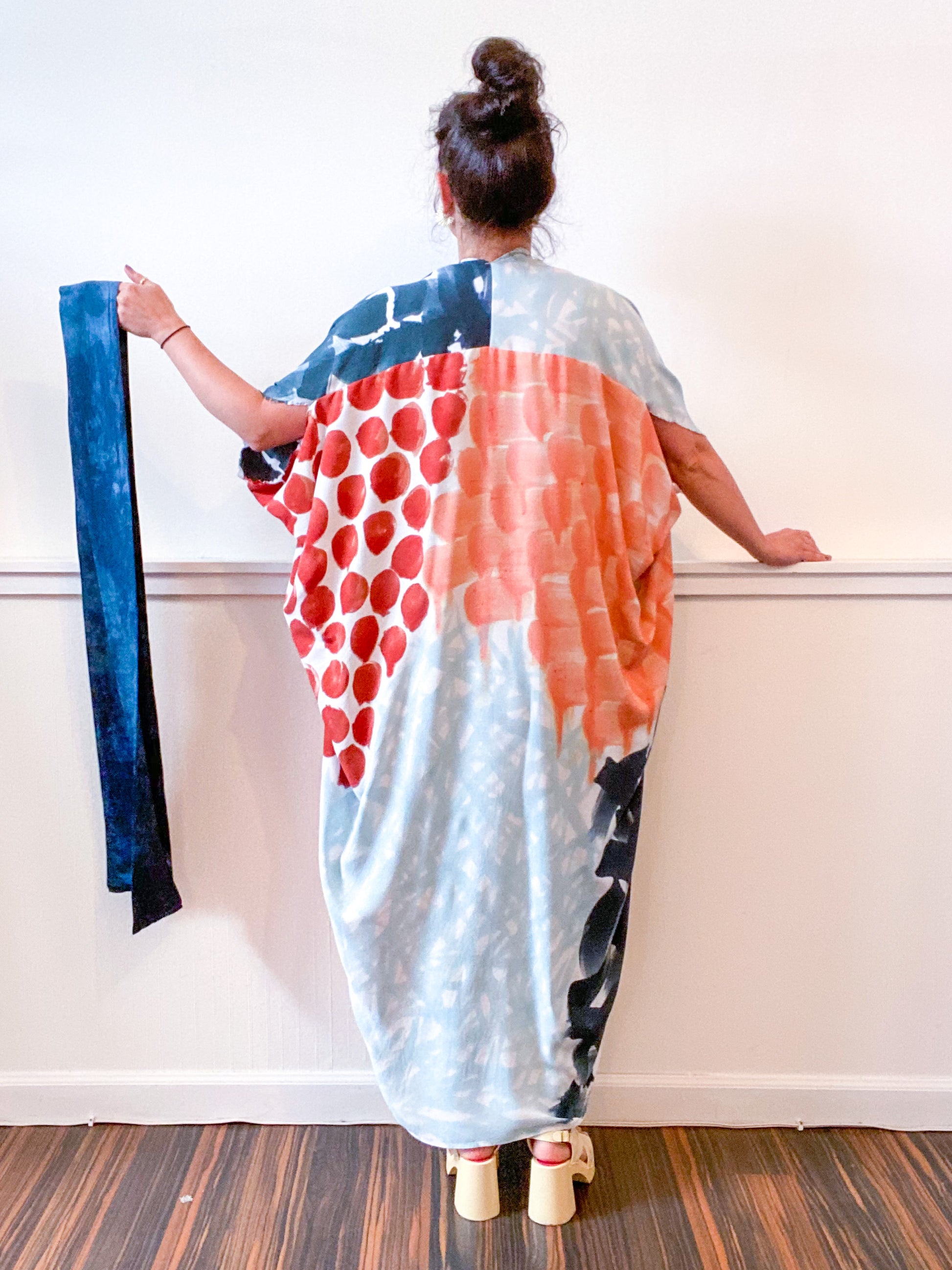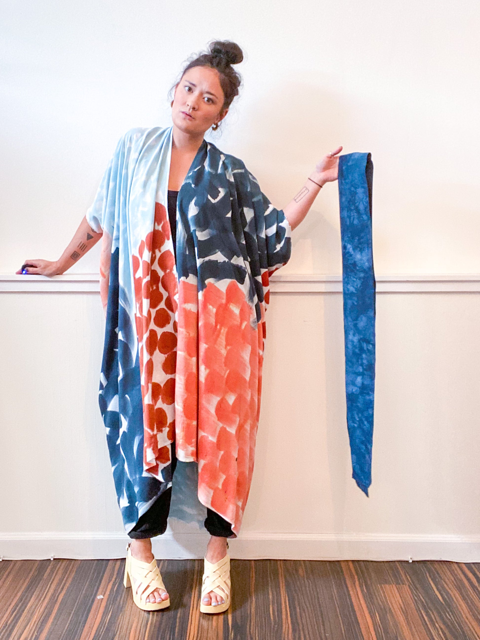 Soft and airy kimono with a flowing silhouette, fringed selvage sleeve detail, curved high low hem and optional waist tie. Versatile shape can be styled as a wrap dress, lightweight jacket over jeans, or an elegant robe over lingerie. The minimalist design created from a full rectangle of fabric drapes beautifully over the shoulders and produces no material waste by utilizing one whole piece of fabric without scraps from corners and irregular cuts. Lightweight woven fabric is hand painted with a multi brushstroke pattern using algae thickened dyes in teal, terracotta, aqua and coral hues.