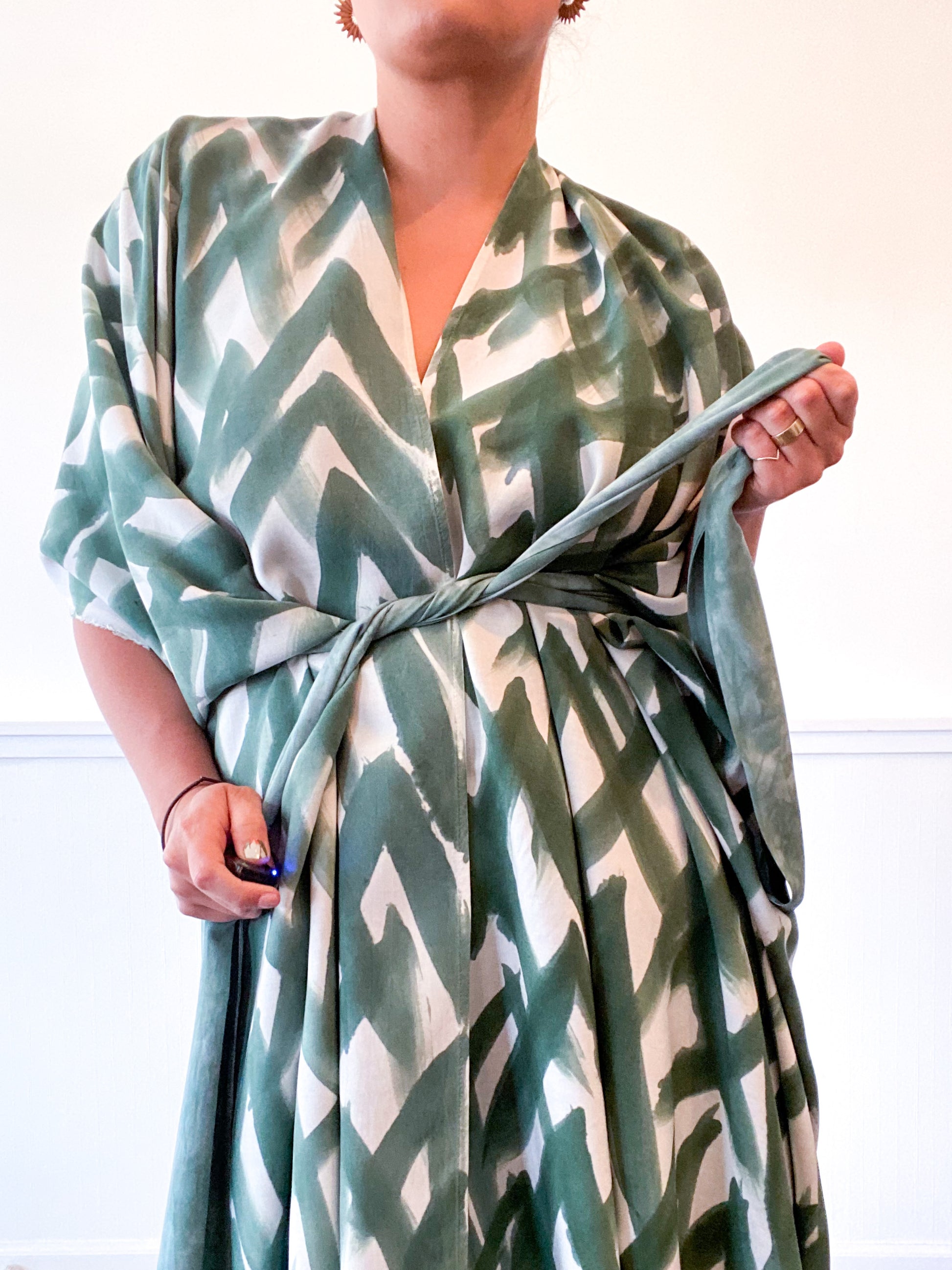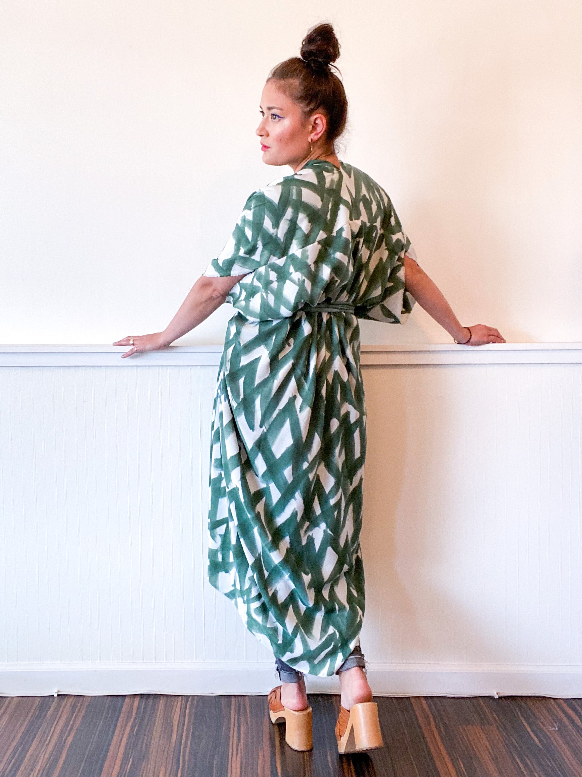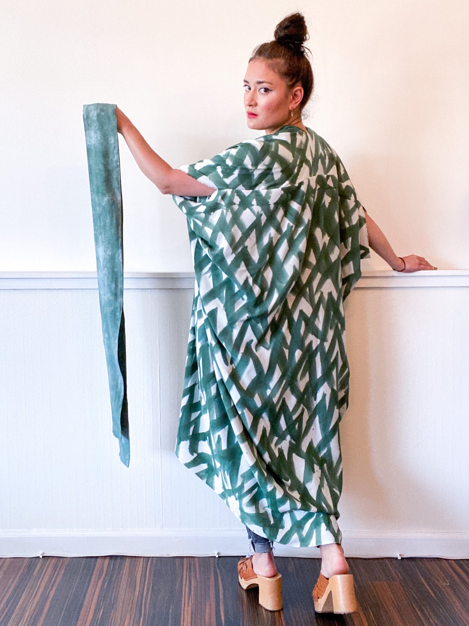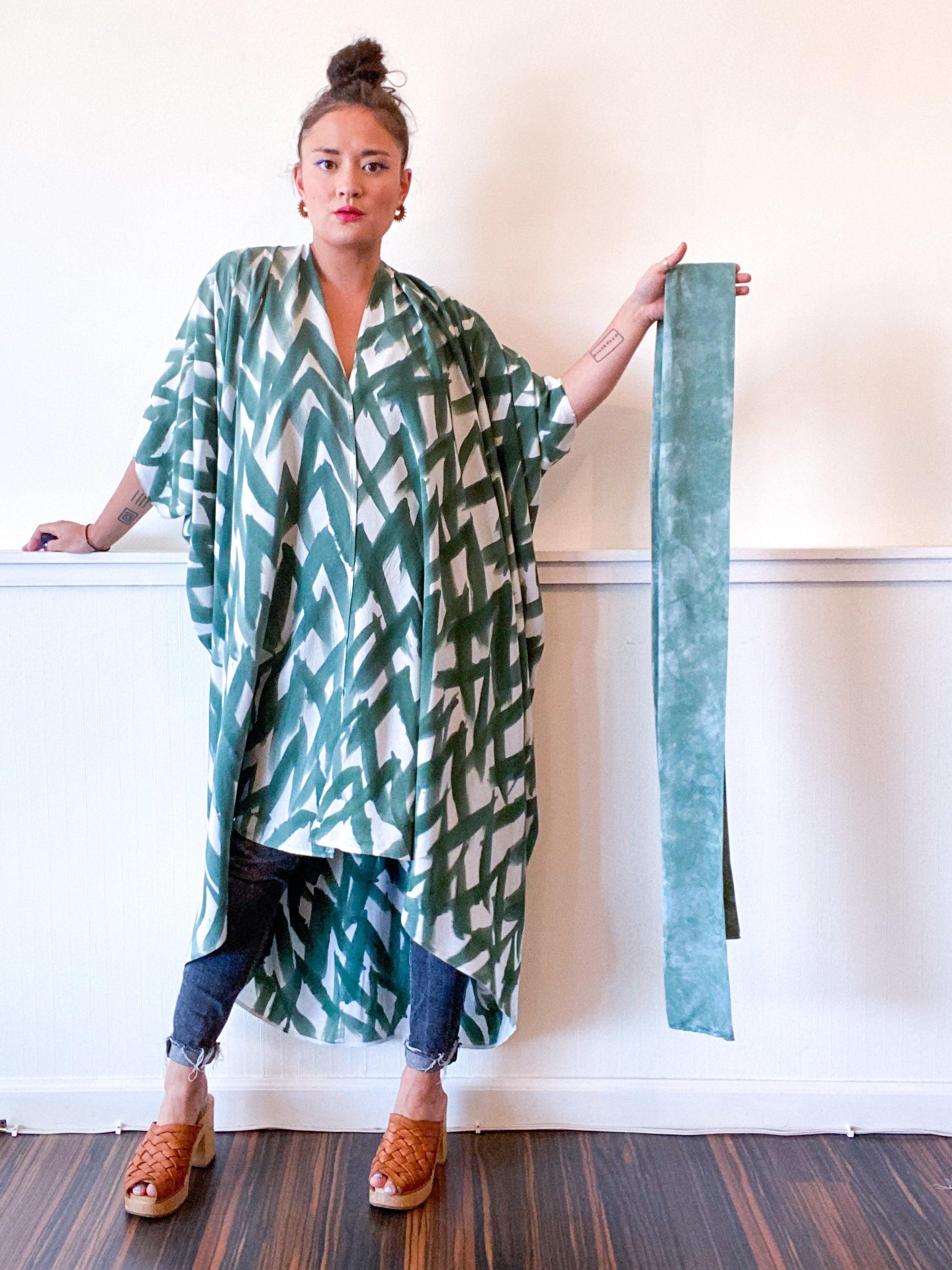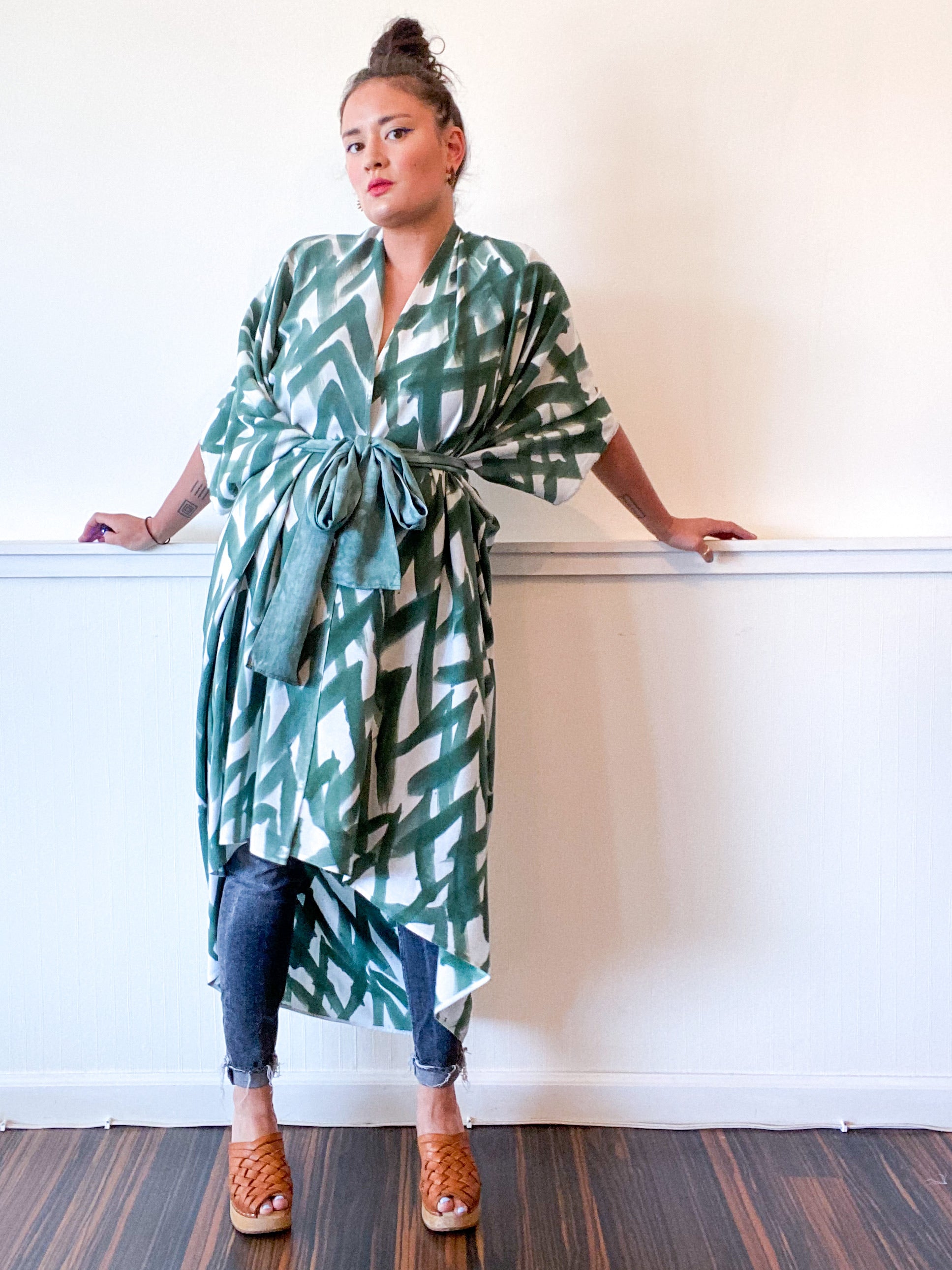 Soft and airy kimono with a flowing silhouette, fringed selvage sleeve detail, curved high low hem and optional waist tie. Versatile shape can be styled as a wrap dress, lightweight jacket over jeans, or an elegant robe over lingerie. The minimalist design created from a full rectangle of fabric drapes beautifully over the shoulders and produces no material waste by utilizing one whole piece of fabric without scraps from corners and irregular cuts. Lightweight woven fabric is hand painted with a brushstroke chevron pattern using algae thickened dyes in a forest green hue.