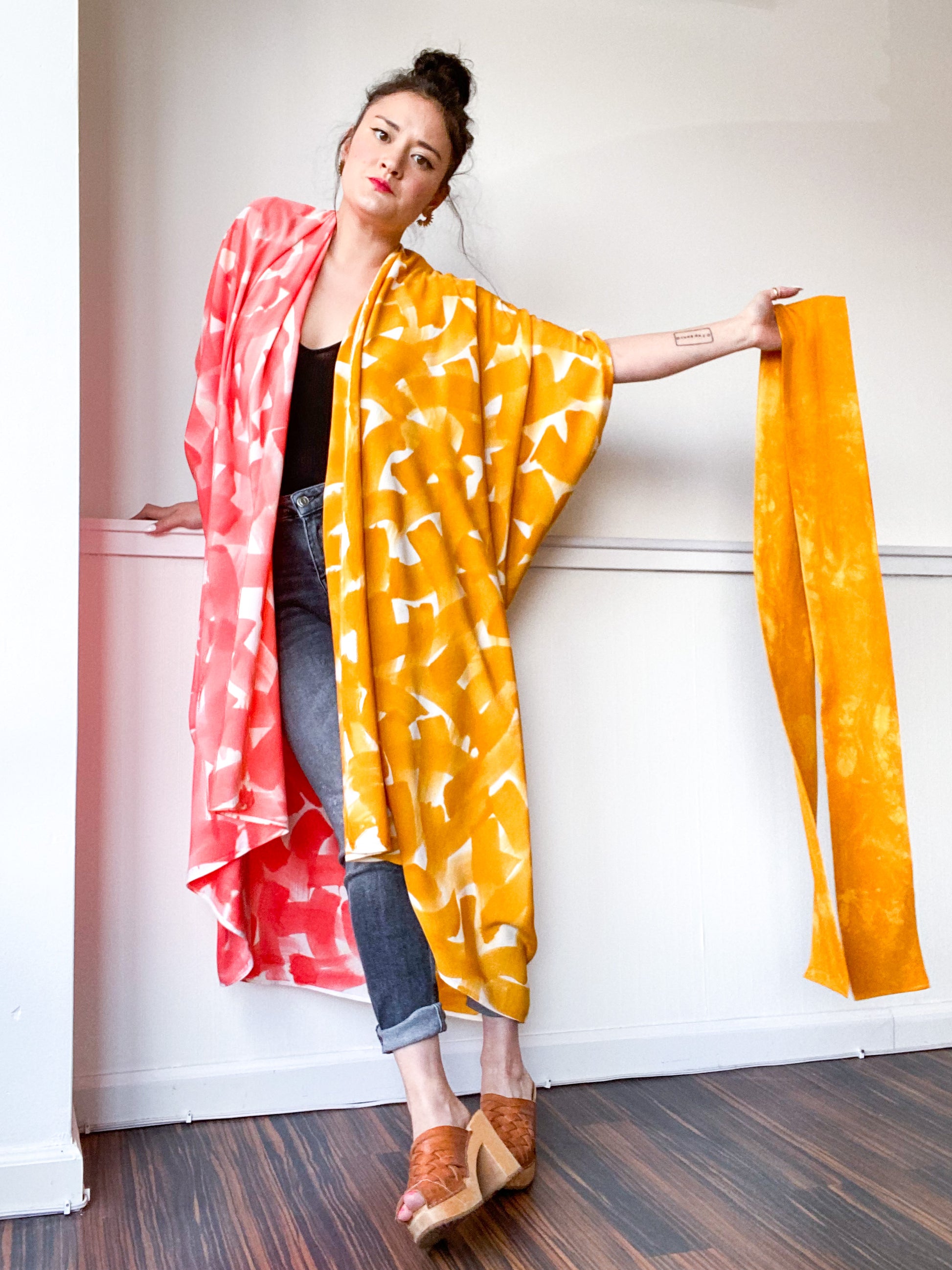 Soft and airy kimono with a flowing silhouette, fringed selvage sleeve detail, curved high low hem and marigold waist tie. Versatile shape can be styled as a wrap dress, lightweight jacket over jeans, or an elegant robe over lingerie. The minimalist design created from a full rectangle of fabric drapes beautifully over the shoulders and produces no material waste by utilizing one whole piece of fabric without scraps from corners and irregular cuts. Lightweight woven fabric is hand painted with two tone brushstroke pattern using algae thickened dyes in marigold and coral pink hues.