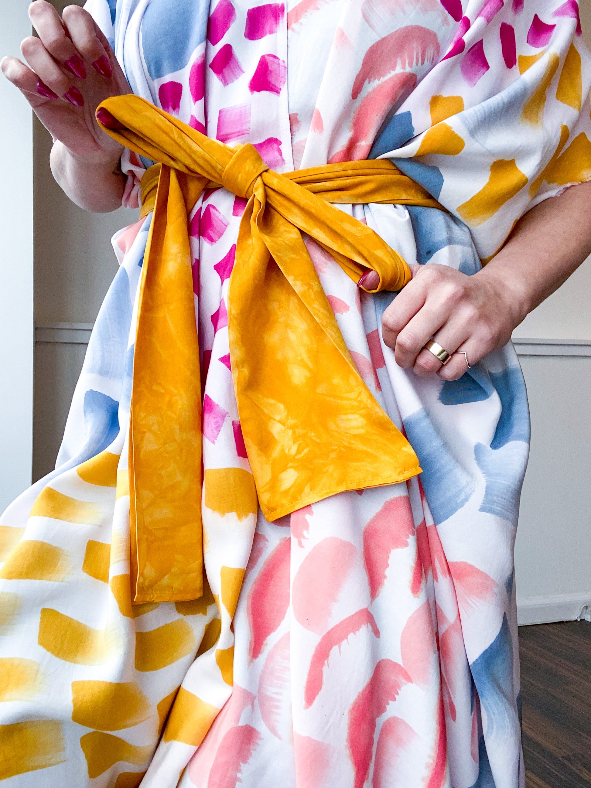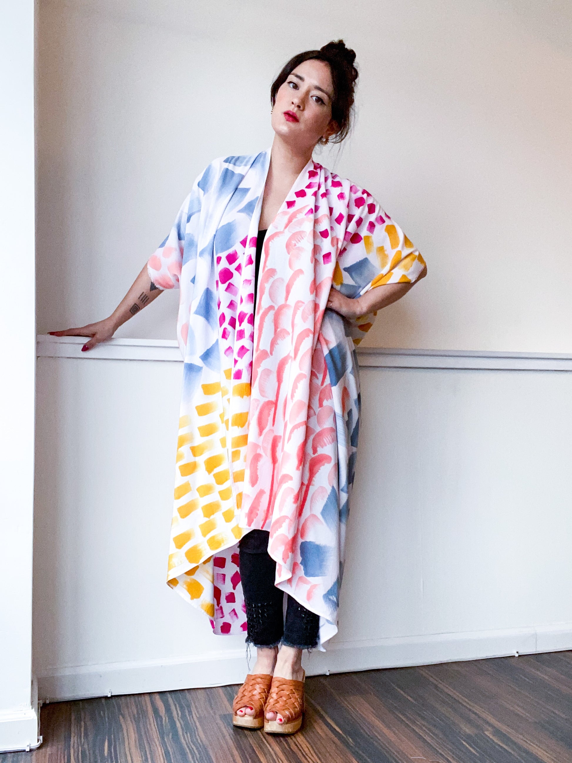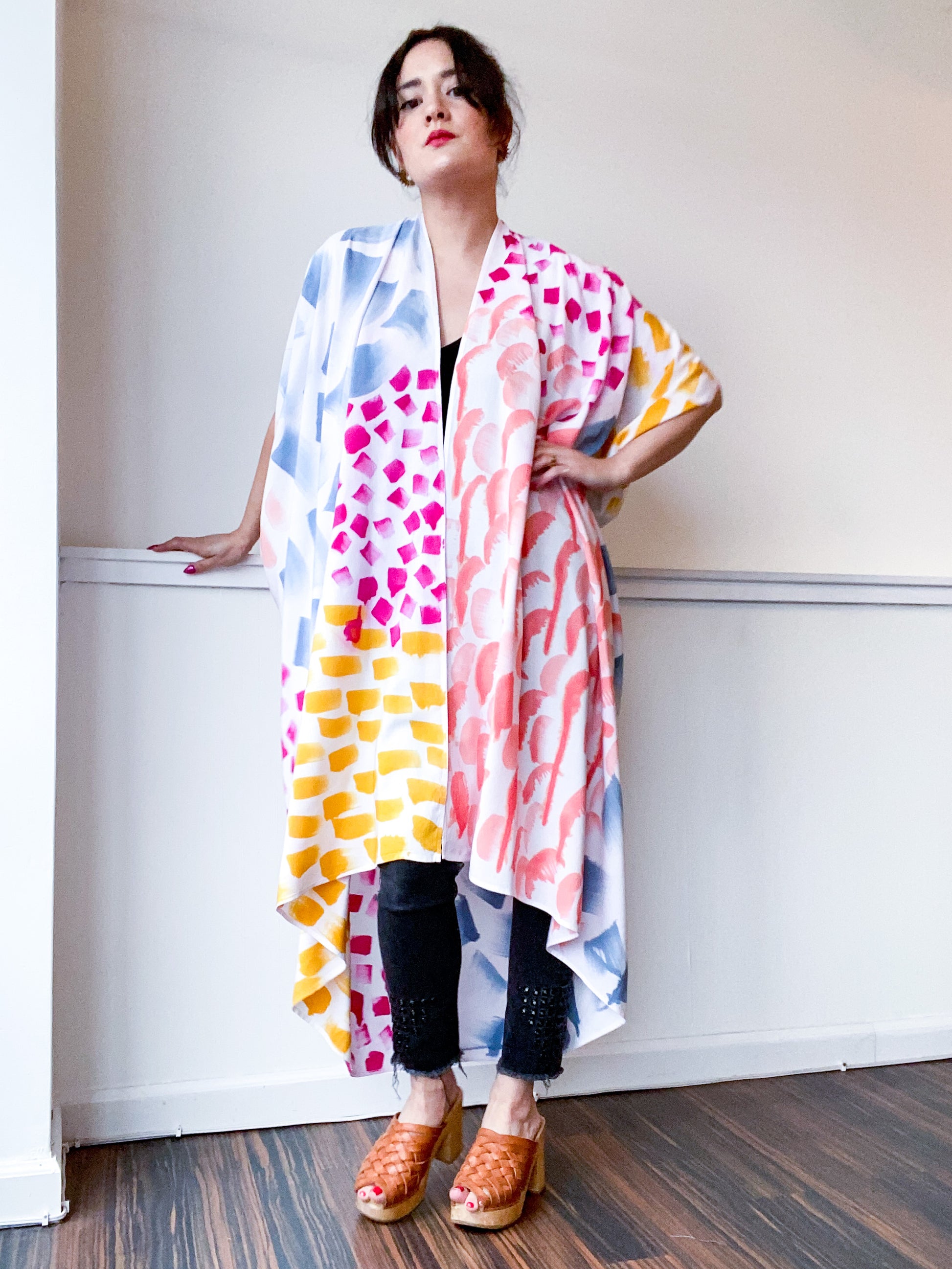 Soft and airy kimono with a flowing silhouette, fringed selvage sleeve detail, curved high low hem and optional waist tie. Versatile shape can be styled as a wrap dress, lightweight jacket over jeans, or an elegant robe over lingerie. The minimalist design created from a full rectangle of fabric drapes beautifully over the shoulders and produces no material waste by utilizing one whole piece of fabric without scraps from corners and irregular cuts. Lightweight woven fabric is hand painted with a multi brushstroke pattern using algae thickened dyes in blue, pink, marigold and coral hues.