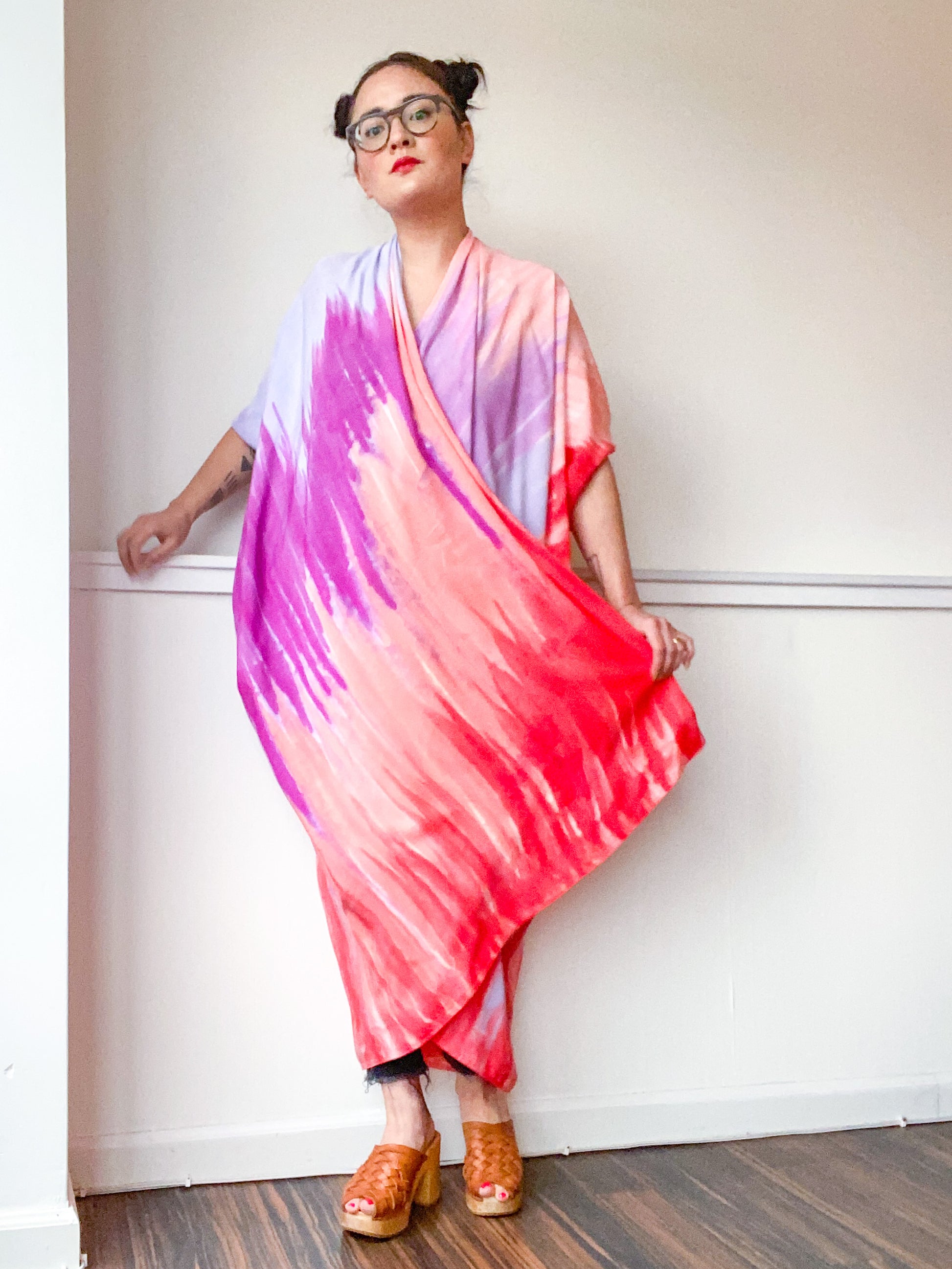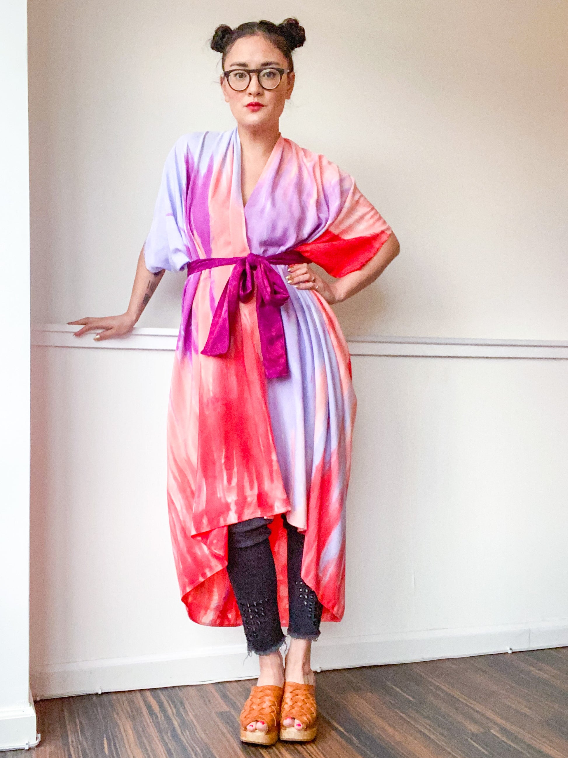 Soft and airy kimono with a flowing silhouette, fringed selvage sleeve detail, curved high low hem and optional waist tie. Versatile shape can be styled as a wrap dress, lightweight jacket over jeans, or an elegant robe over lingerie. The minimalist design created from a full rectangle of fabric drapes beautifully over the shoulders and produces no material waste by utilizing one whole piece of fabric without scraps from corners and irregular cuts. Lightweight woven fabric is hand painted with a vertical brushstroke pattern using algae thickened dyes in coral, wisteria, amethyst and scarlet hues.