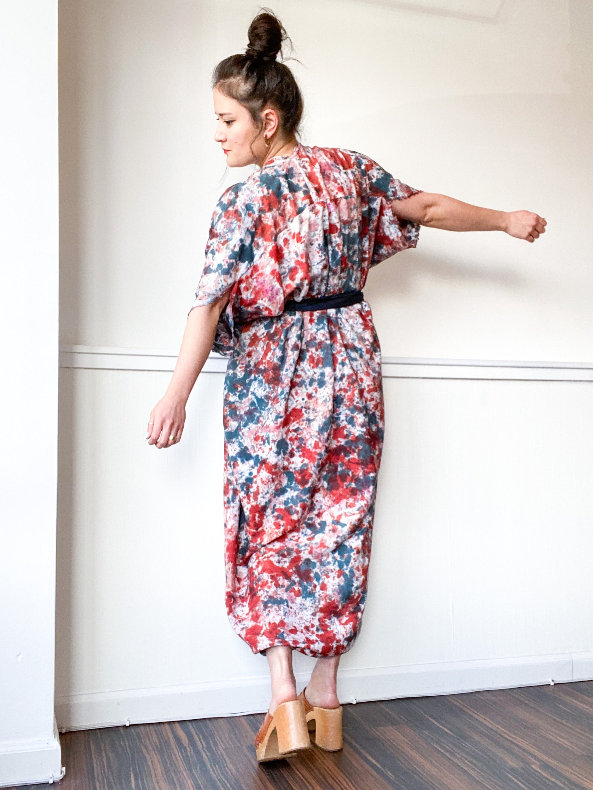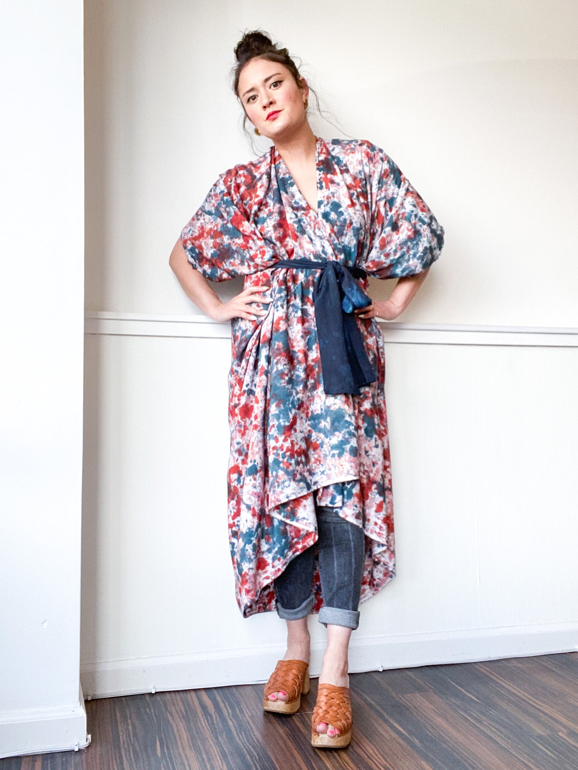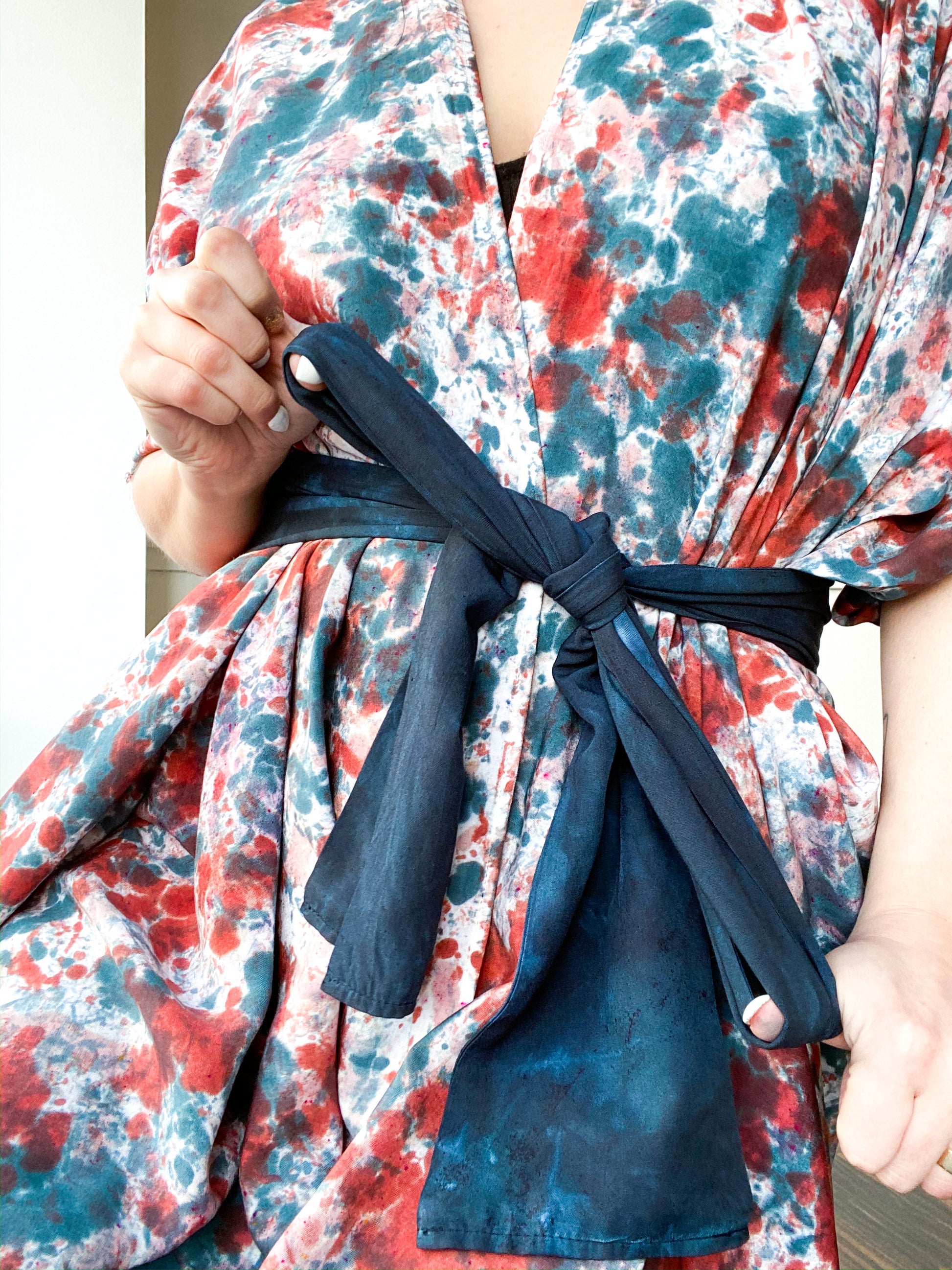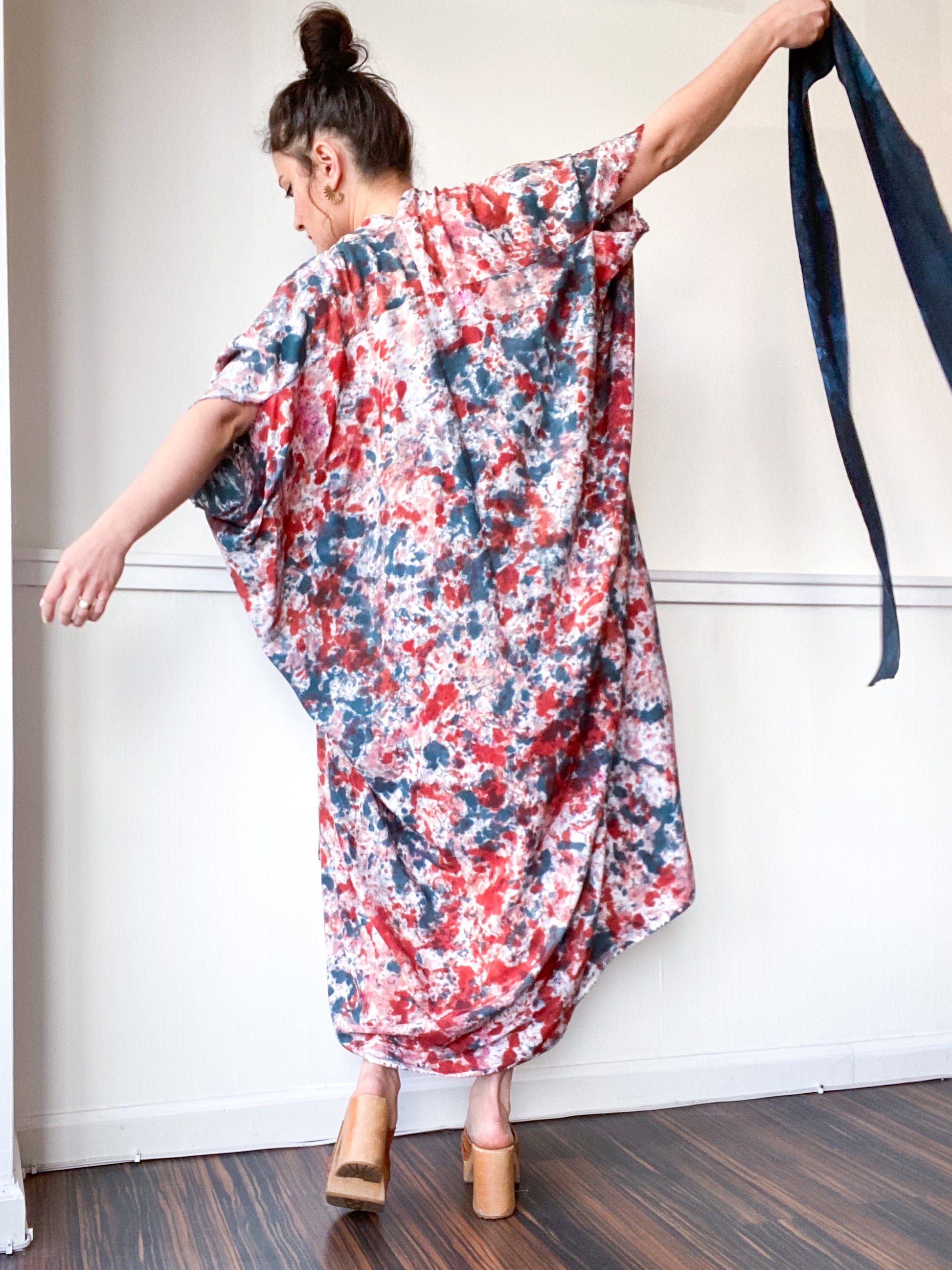 Soft and airy kimono with a flowing silhouette, fringed selvage sleeve detail, curved high low hem and teal waist tie. Versatile shape can be styled as a wrap dress, lightweight jacket over jeans, or an elegant robe over lingerie. The minimalist design created from a full rectangle of fabric drapes beautifully over the shoulders and produces no material waste by utilizing one whole piece of fabric without scraps from corners and irregular cuts. Lightweight woven fabric is hand painted with a random speckle pattern using algae thickened dyes in teal, terracotta and light pink hues.