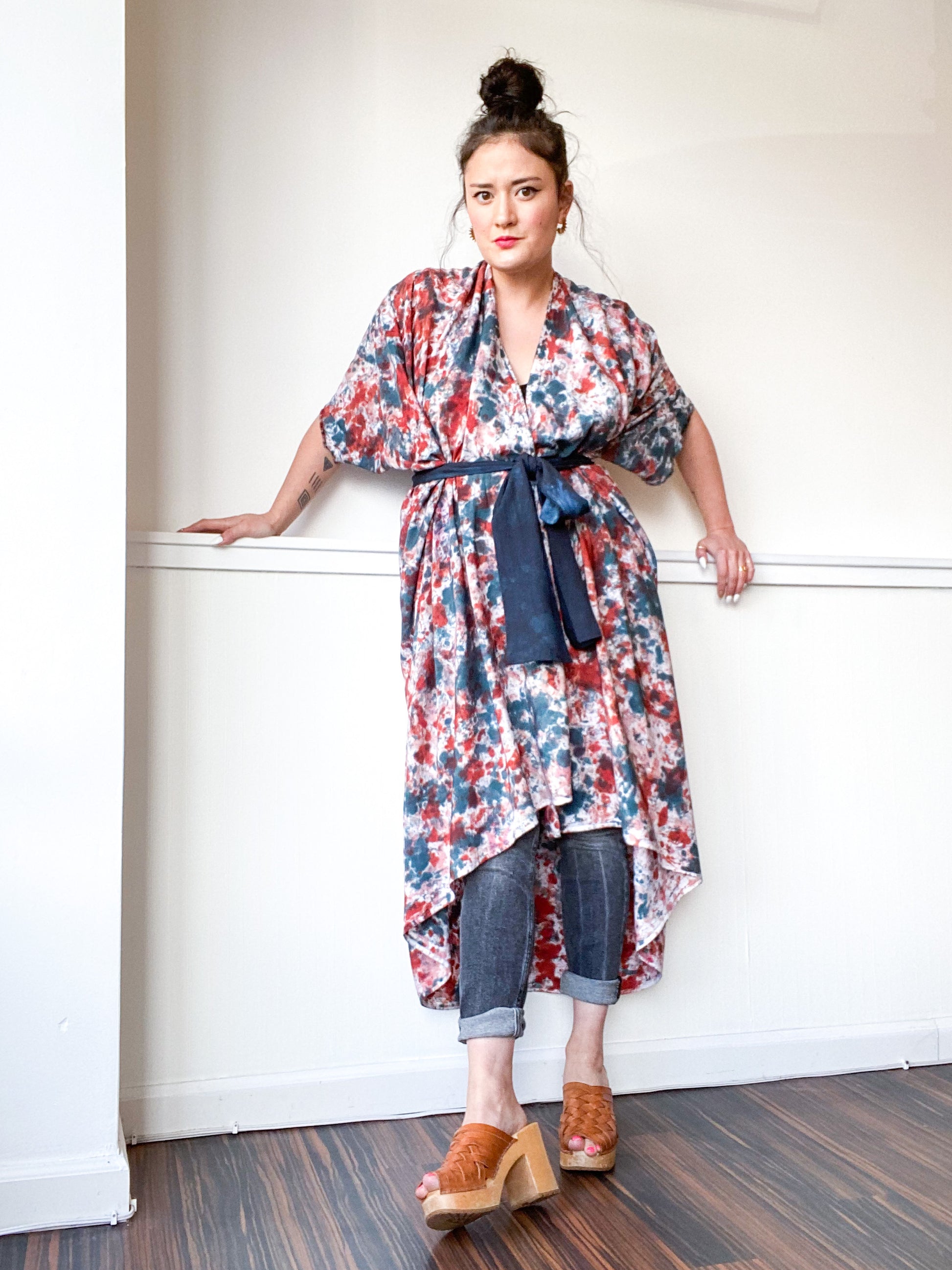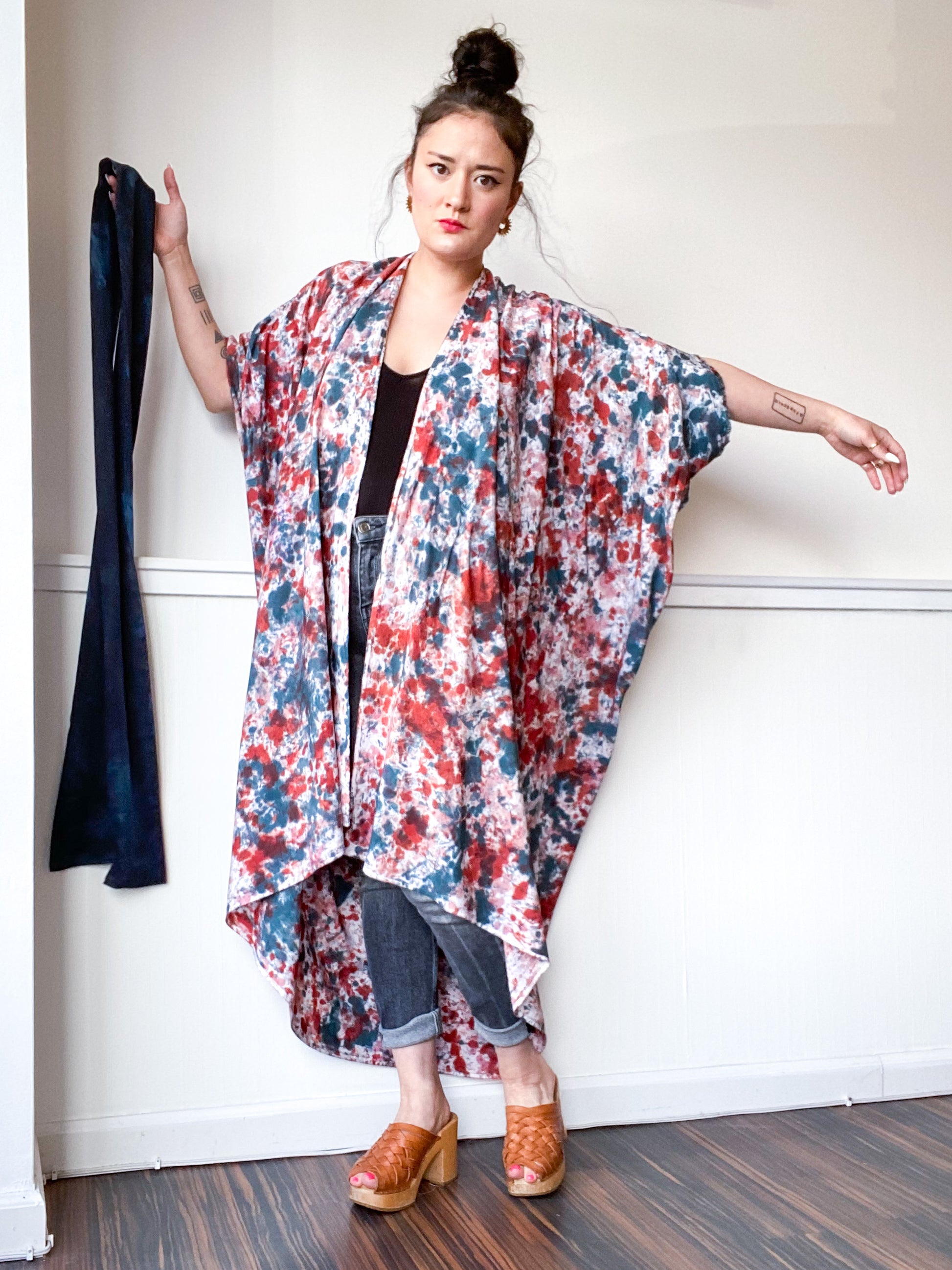 Hand-Dyed High Low Kimono Speckle Teal Terracotta Pink