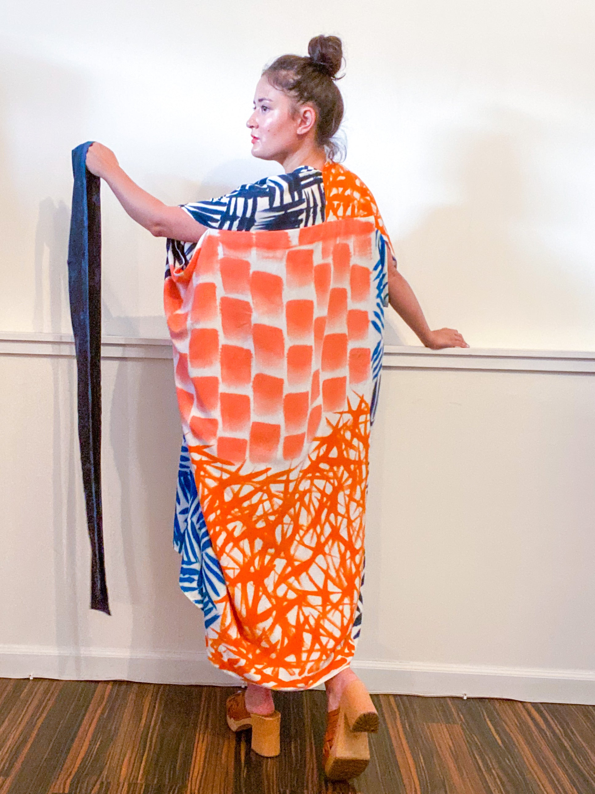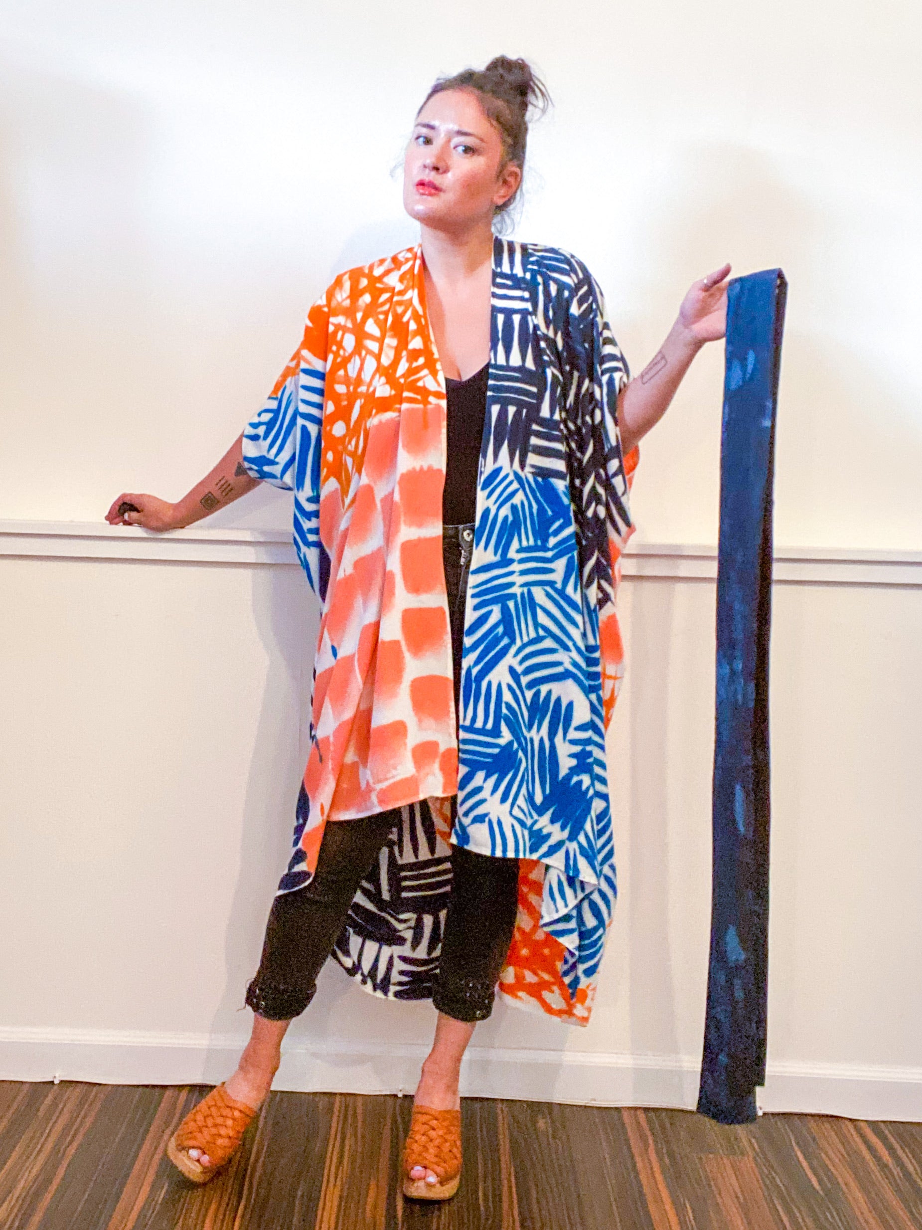 Soft and airy kimono with a flowing silhouette, fringed selvage sleeve detail, curved high low hem and optional waist tie. Versatile shape can be styled as a wrap dress, lightweight jacket over jeans, or an elegant robe over lingerie. The minimalist design created from a full rectangle of fabric drapes beautifully over the shoulders and produces no material waste by utilizing one whole piece of fabric without scraps from corners and irregular cuts. Lightweight woven fabric is hand painted with a multi brushstroke pattern using algae thickened dyes in teal, cerulean blue, coral and orange hues.