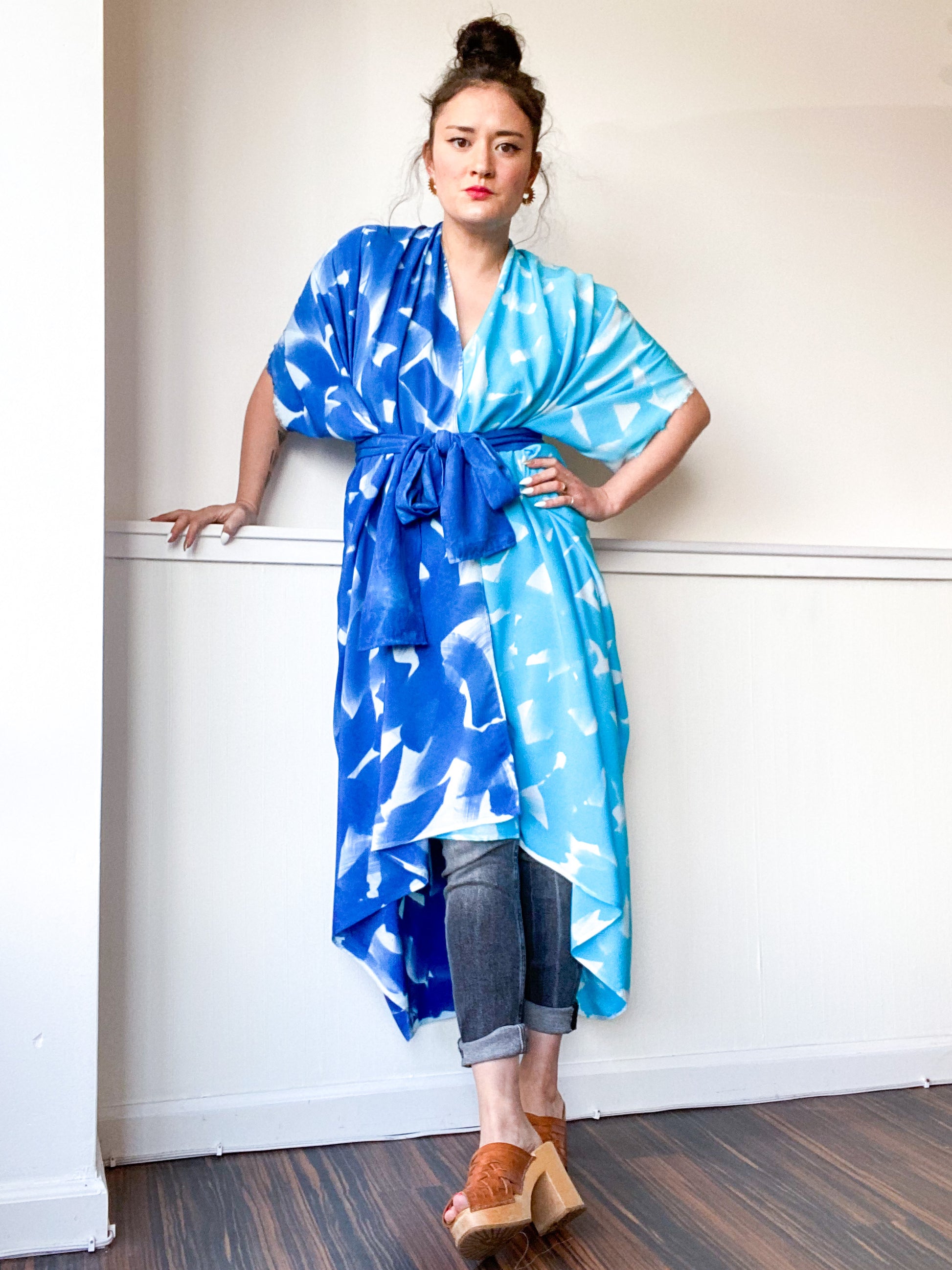Soft and airy kimono with a flowing silhouette, fringed selvage sleeve detail, curved high low hem and royal blue waist tie. Versatile shape can be styled as a wrap dress, lightweight jacket over jeans, or an elegant robe over lingerie. The minimalist design created from a full rectangle of fabric drapes beautifully over the shoulders and produces no material waste by utilizing one whole piece of fabric without scraps from corners and irregular cuts. Lightweight woven fabric is hand painted with two tone brushstroke pattern using algae thickened dyes in turquoise and royal blue hues.
