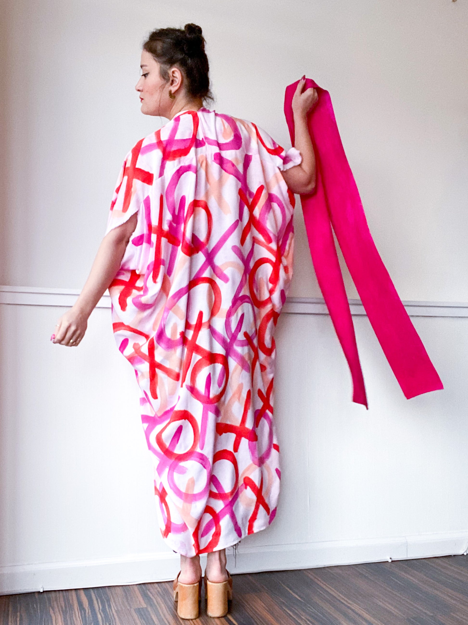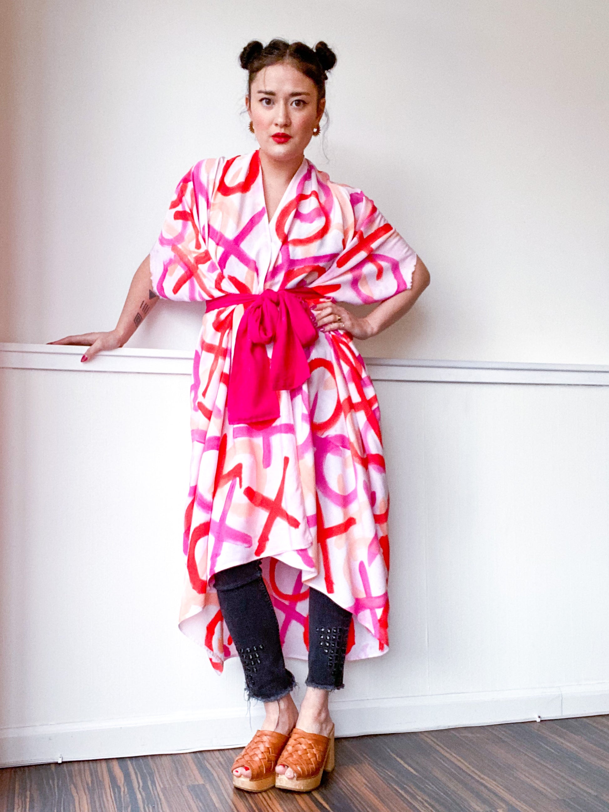 Soft and airy kimono with a flowing silhouette, fringed selvage sleeve detail, curved high low hem and optional waist tie. Versatile shape can be styled as a wrap dress, lightweight jacket over jeans, or an elegant robe over lingerie. The minimalist design created from a full rectangle of fabric drapes beautifully over the shoulders and produces no material waste by utilizing one whole piece of fabric without scraps from corners and irregular cuts. Lightweight woven fabric is hand painted with And random XO pattern using algae thickened dyes in scarlet, coral and pink hues.