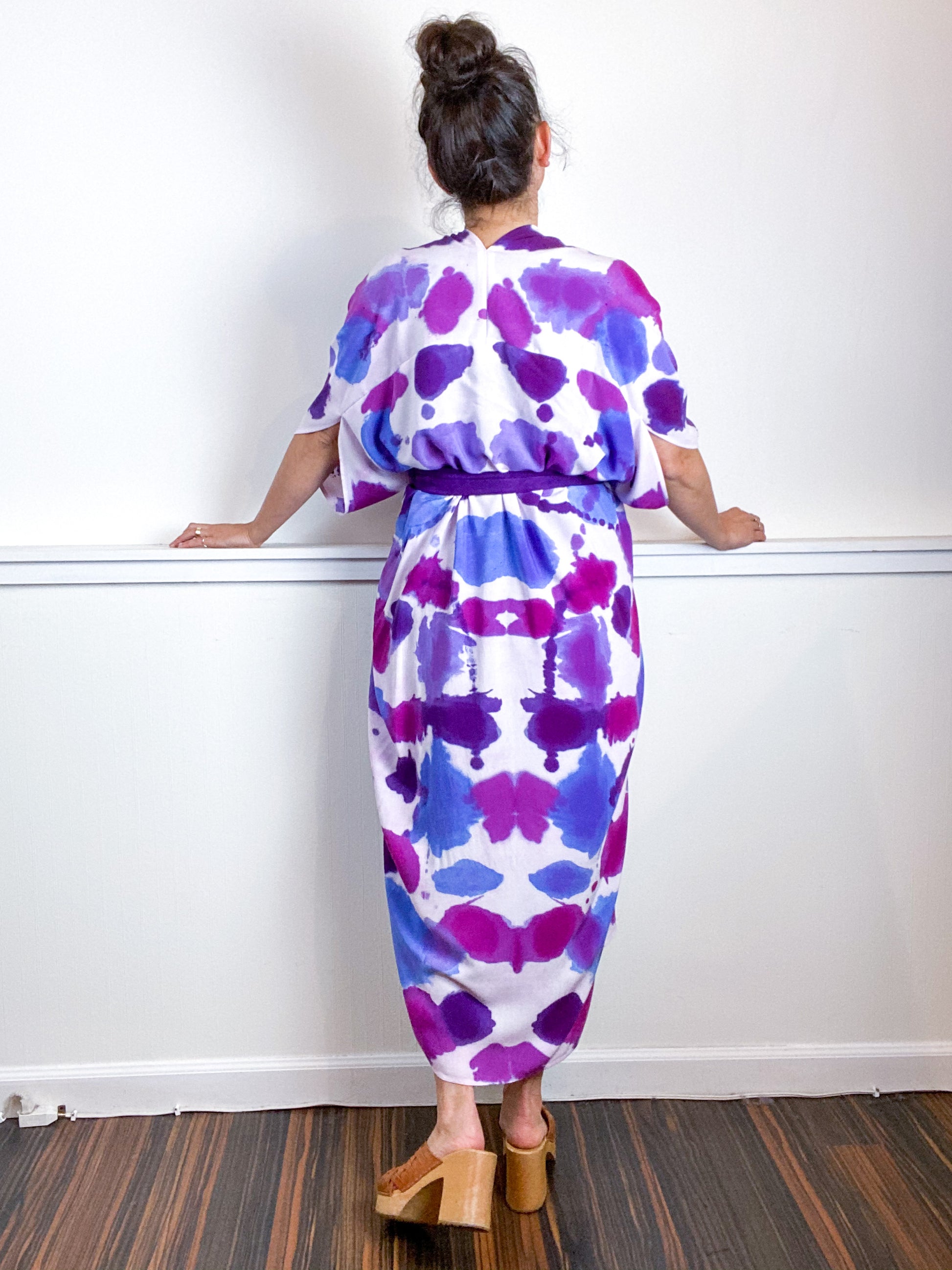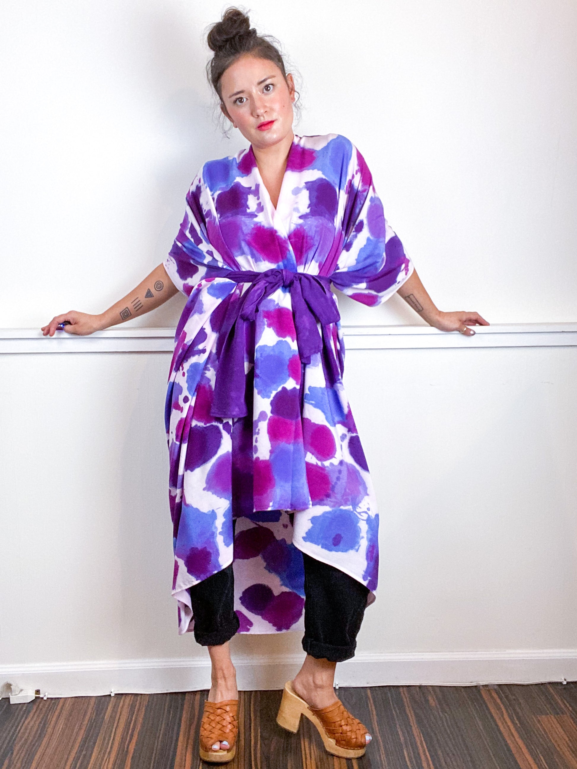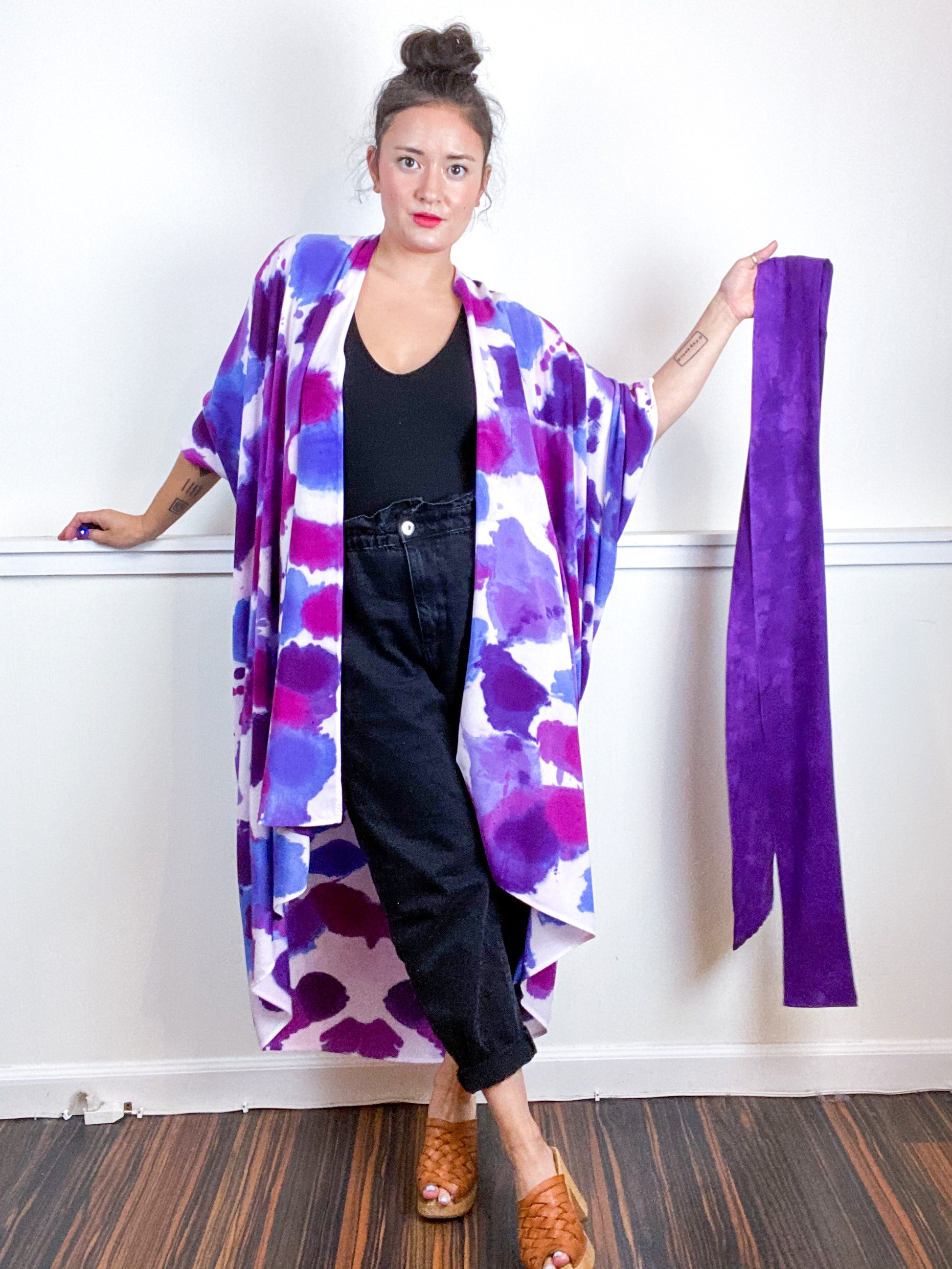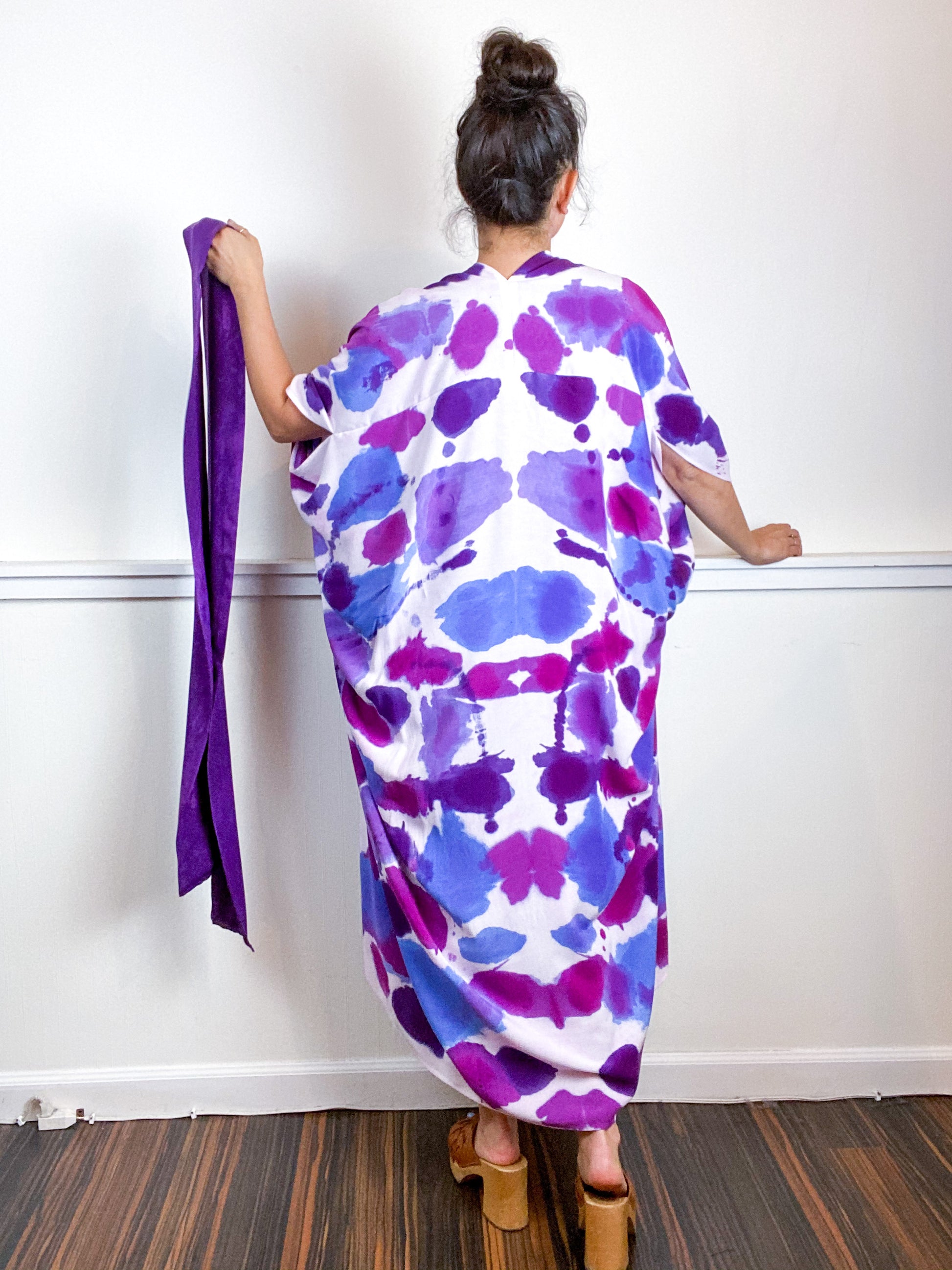 Soft and airy kimono with a flowing silhouette, tulip selvage sleeve detail, curved high low hem and optional waist tie. Versatile shape can be styled as a wrap dress, lightweight jacket over jeans, or an elegant robe over lingerie. The minimalist design created from a full rectangle of fabric drapes beautifully over the shoulders and produces no material waste by utilizing one whole piece of fabric without scraps from corners and irregular cuts. Lightweight woven fabric is hand-dyed with an inkblot pattern using algae thickened dyes in purple hues.