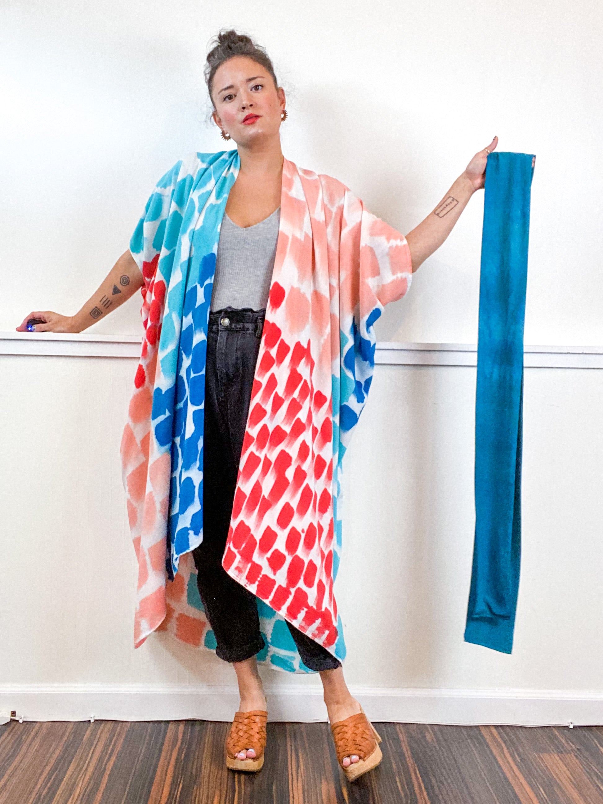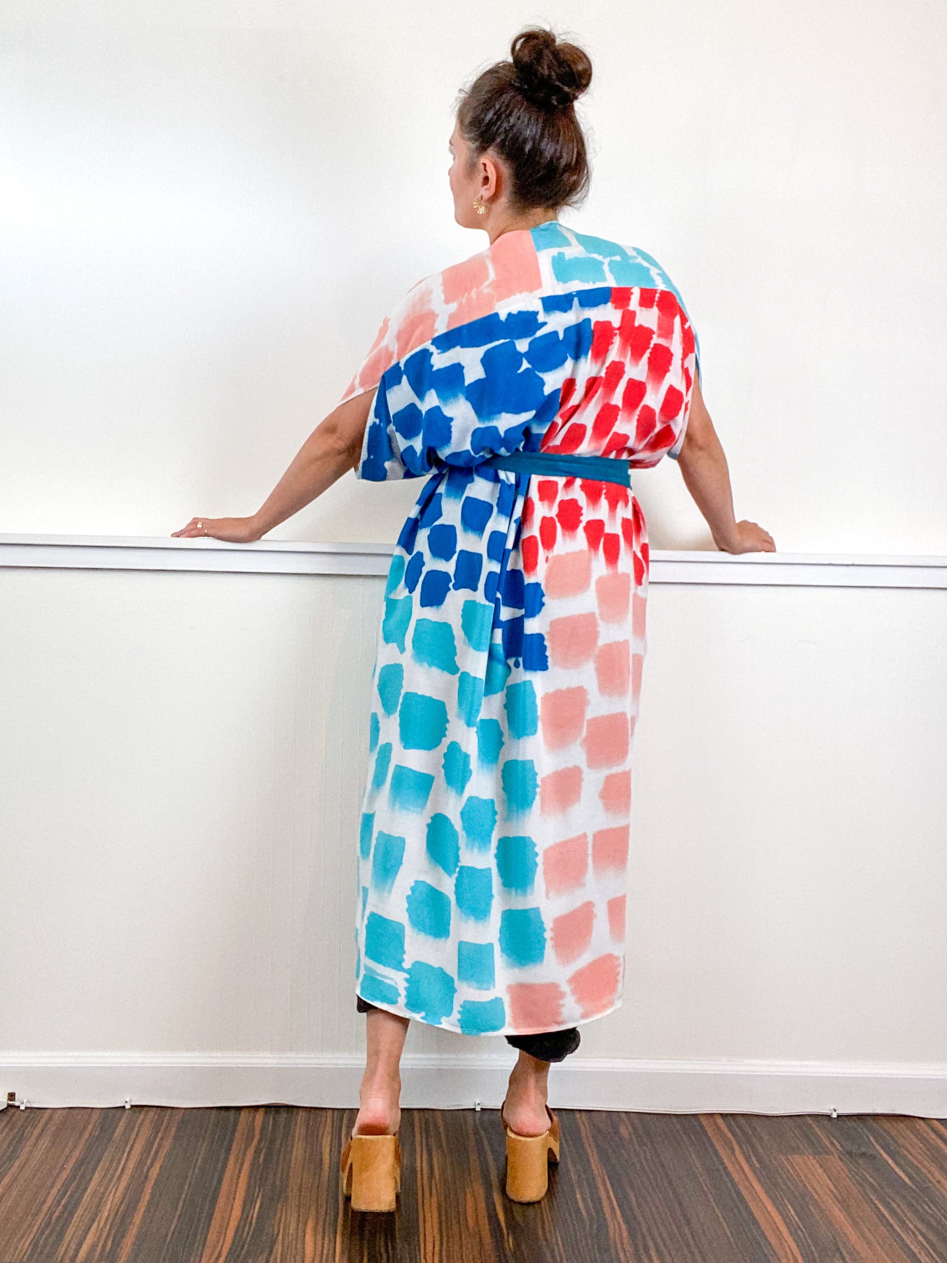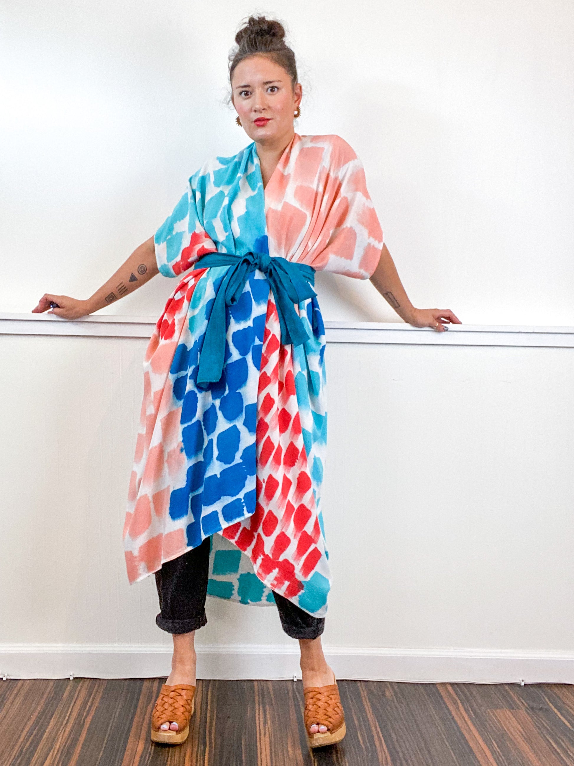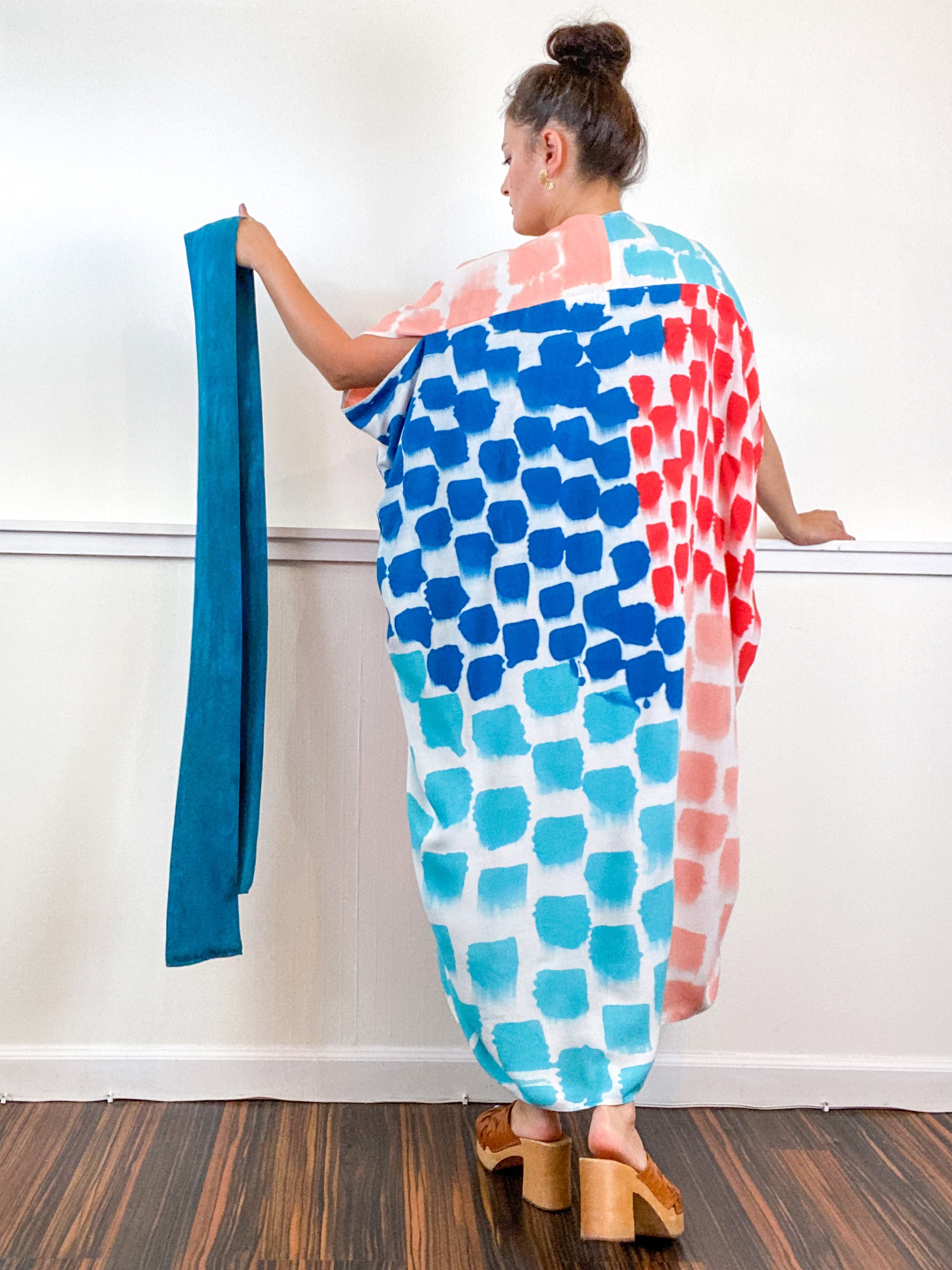 Soft and airy kimono with a flowing silhouette, tulip selvage sleeve detail, curved high low hem and optional waist tie. Versatile shape can be styled as a wrap dress, lightweight jacket over jeans, or an elegant robe over lingerie. The minimalist design created from a full rectangle of fabric drapes beautifully over the shoulders and produces no material waste by utilizing one whole piece of fabric without scraps from corners and irregular cuts. Lightweight woven fabric is hand painted with a multi dots pattern using algae thickened dyes in teal, turquoise, coral and red hues.