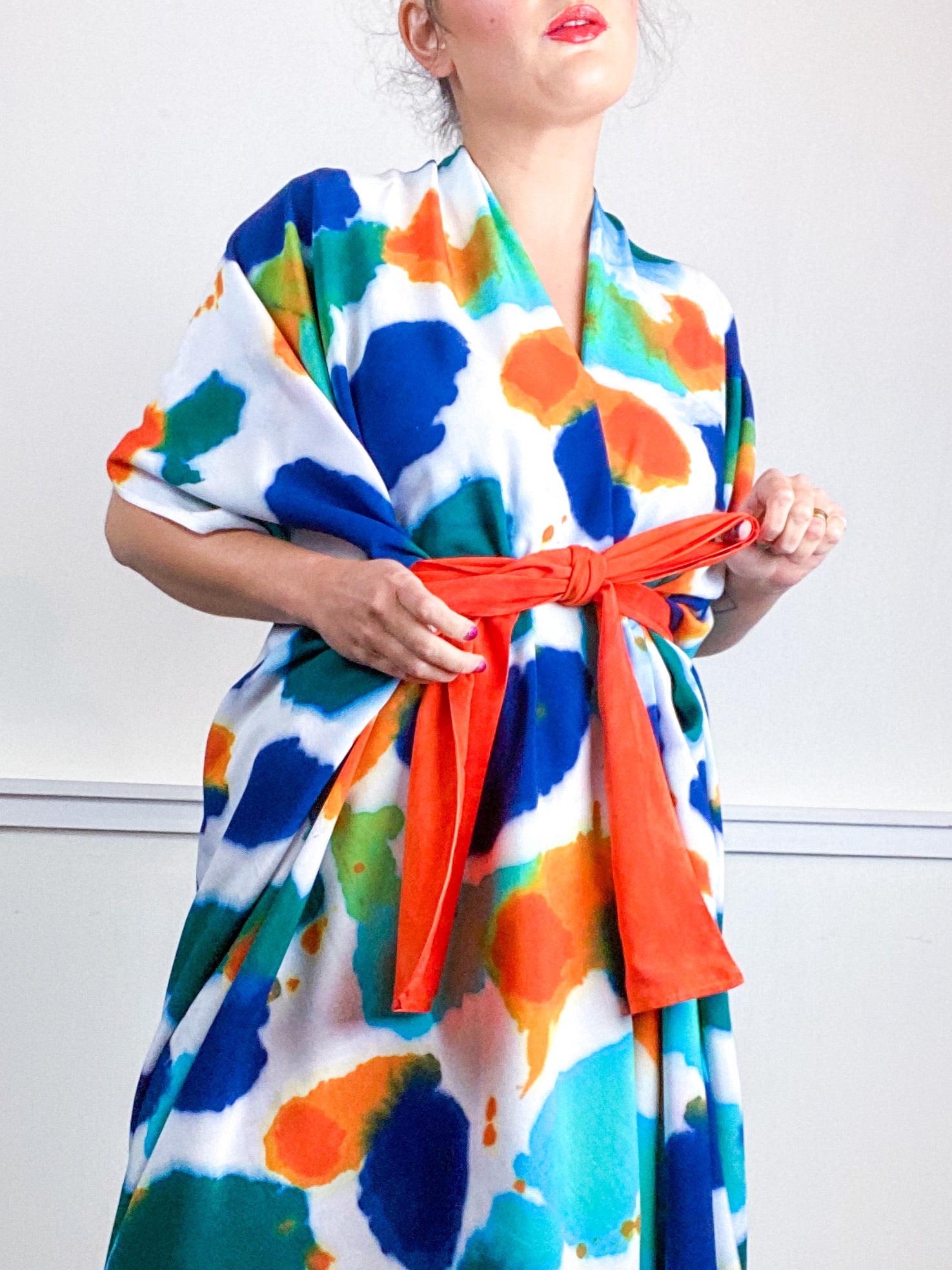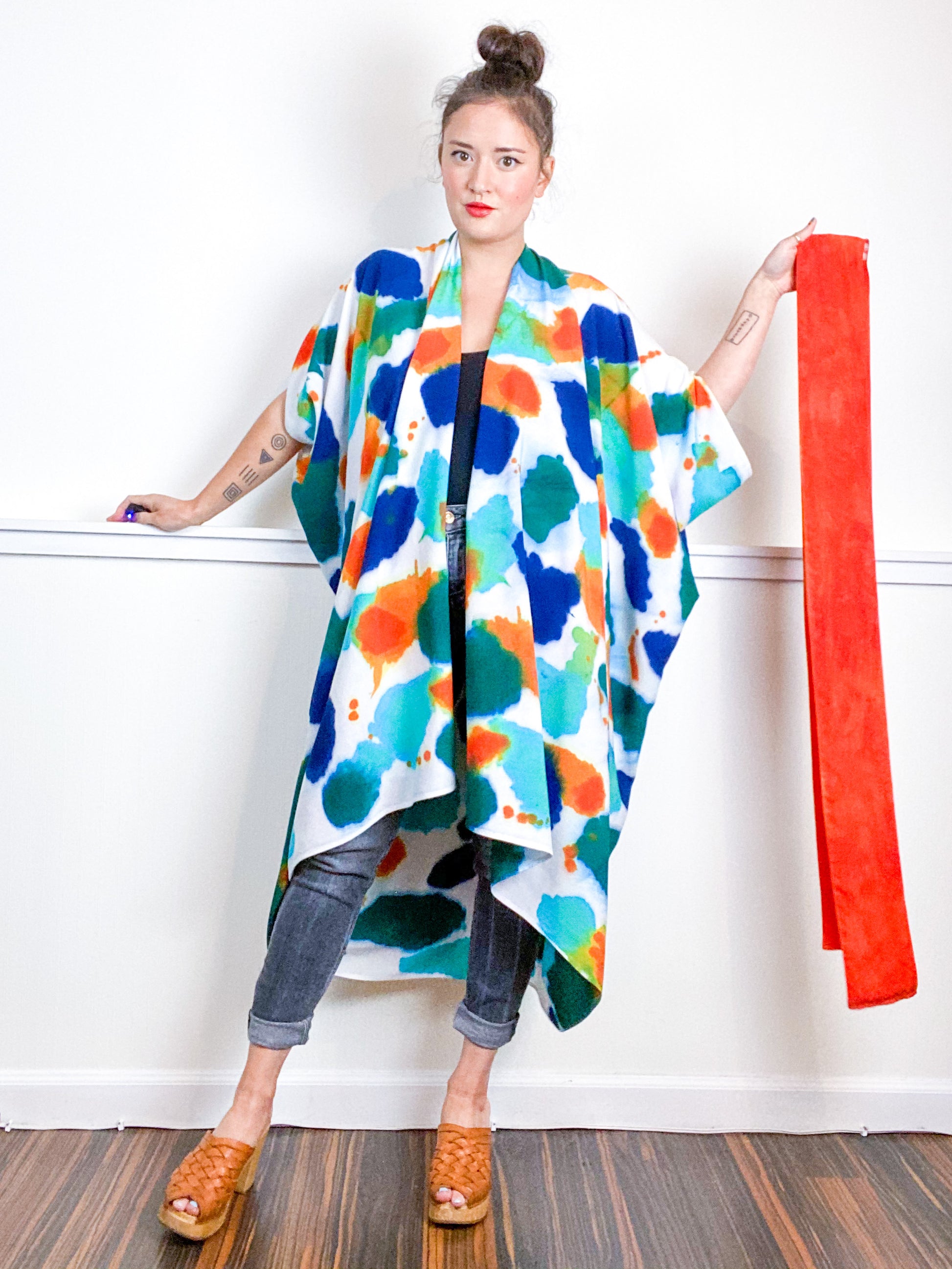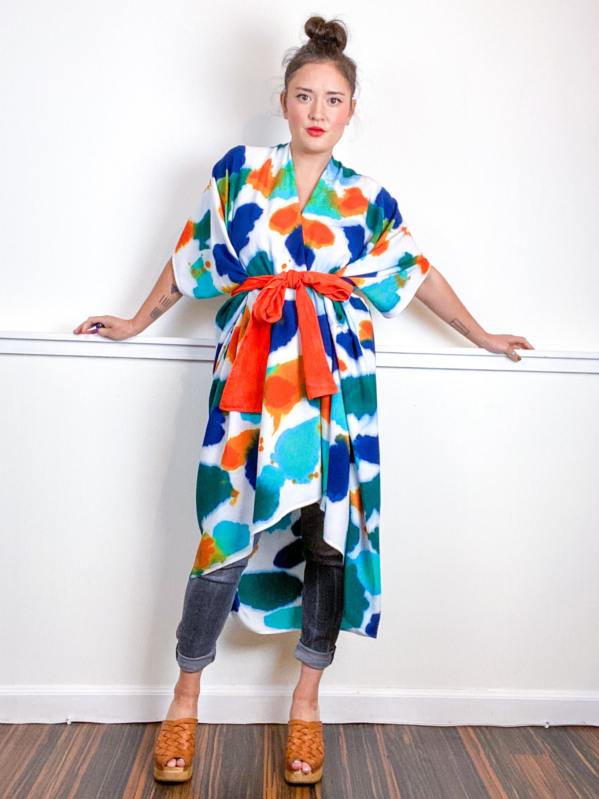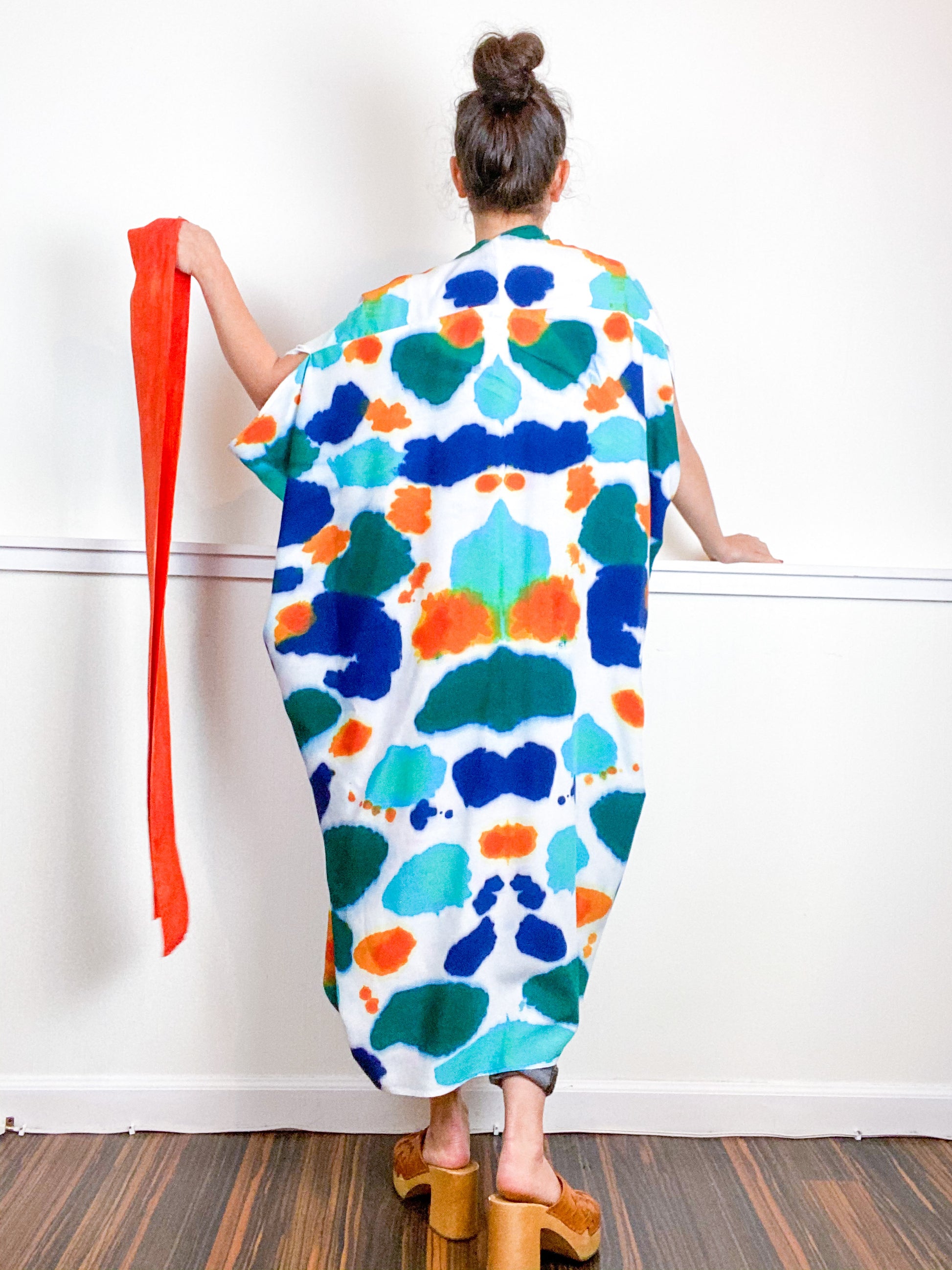 Soft and airy kimono with a flowing silhouette, tulip selvage sleeve detail, curved high low hem and optional waist tie. Versatile shape can be styled as a wrap dress, lightweight jacket over jeans, or an elegant robe over lingerie. The minimalist design created from a full rectangle of fabric drapes beautifully over the shoulders and produces no material waste by utilizing one whole piece of fabric without scraps from corners and irregular cuts. Lightweight woven fabric is hand-dyed with an inkblot pattern using algae thickened dyes in green, orange, blue and turquoise hues.
