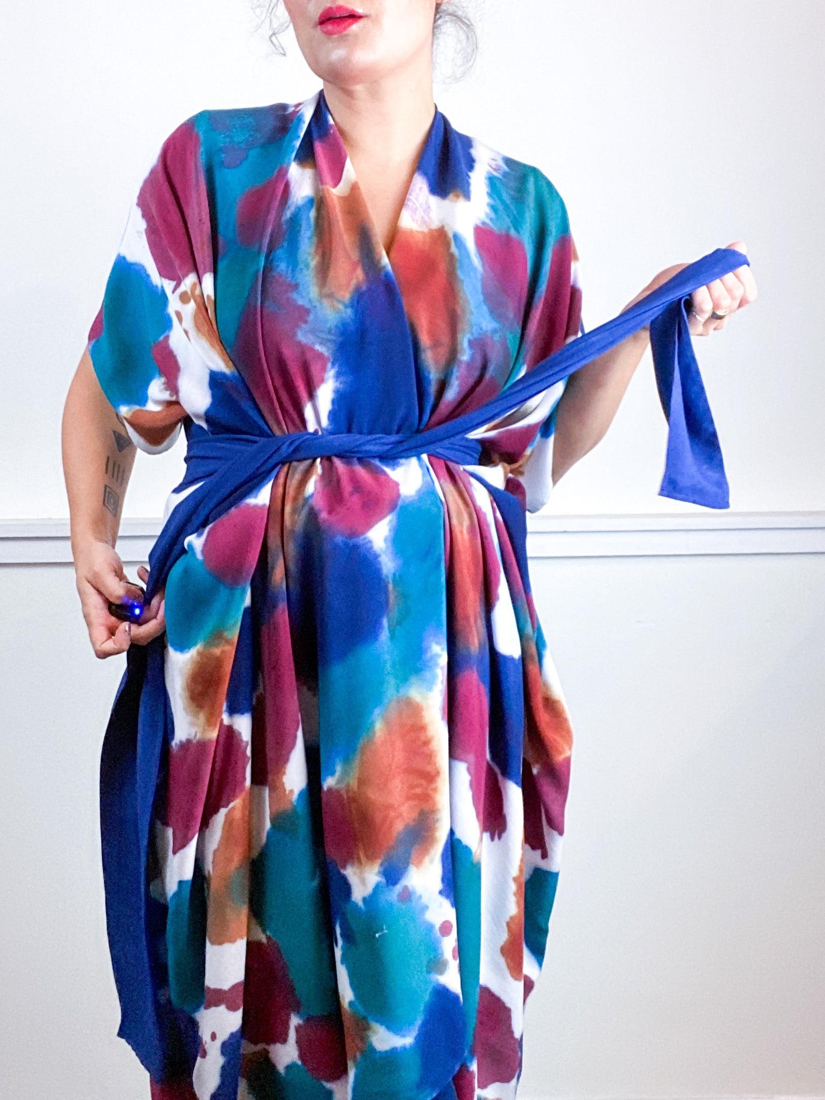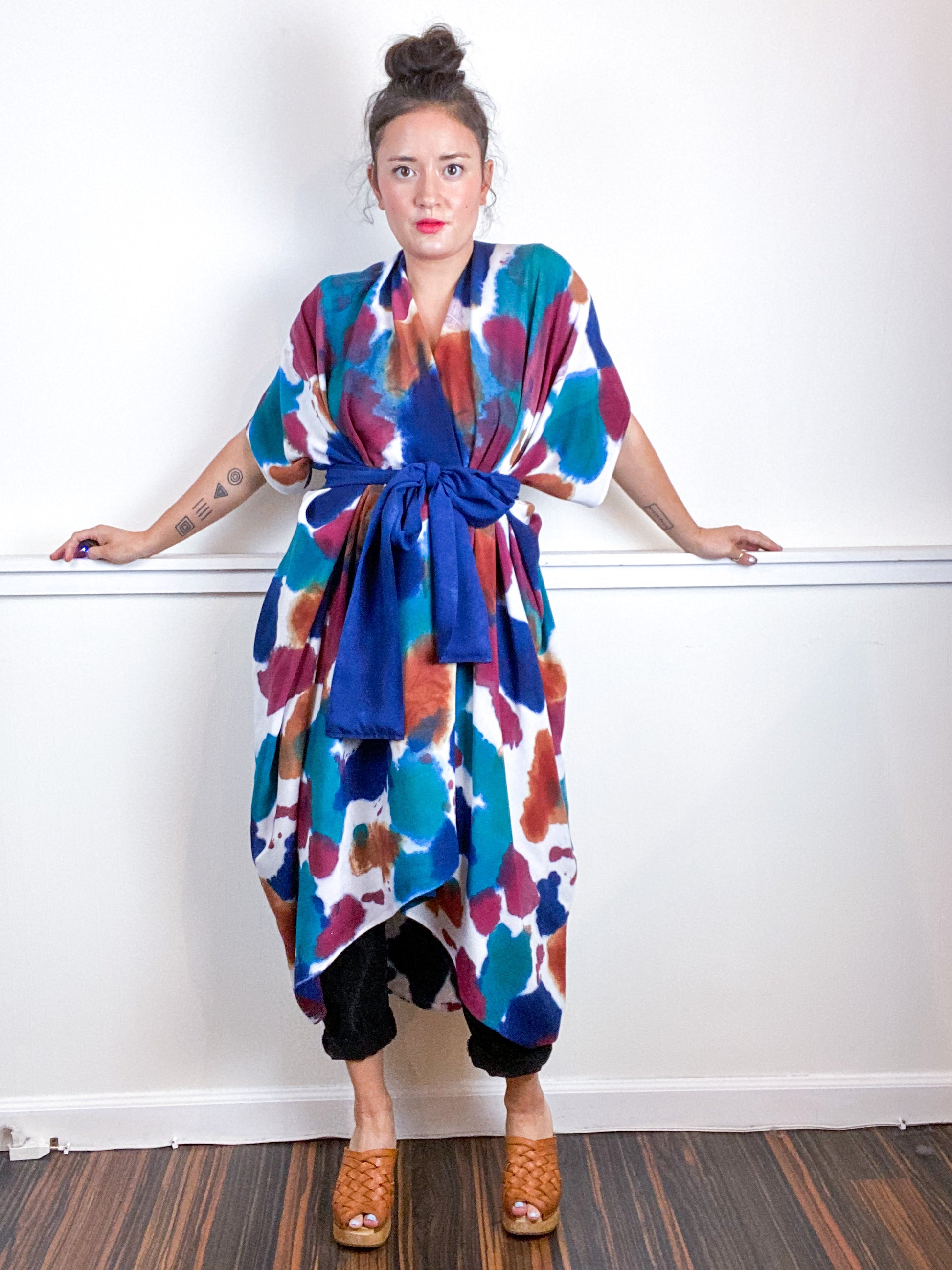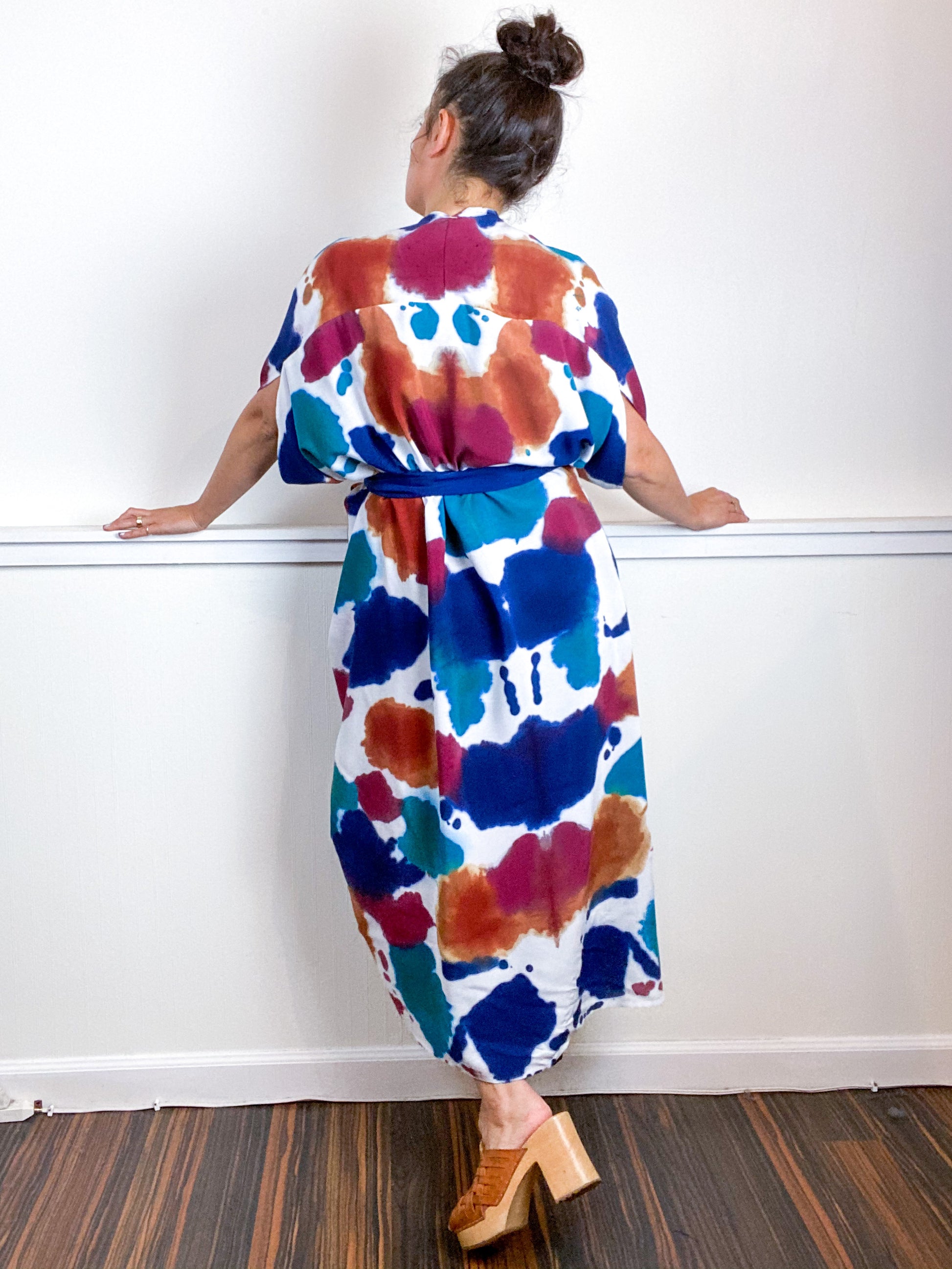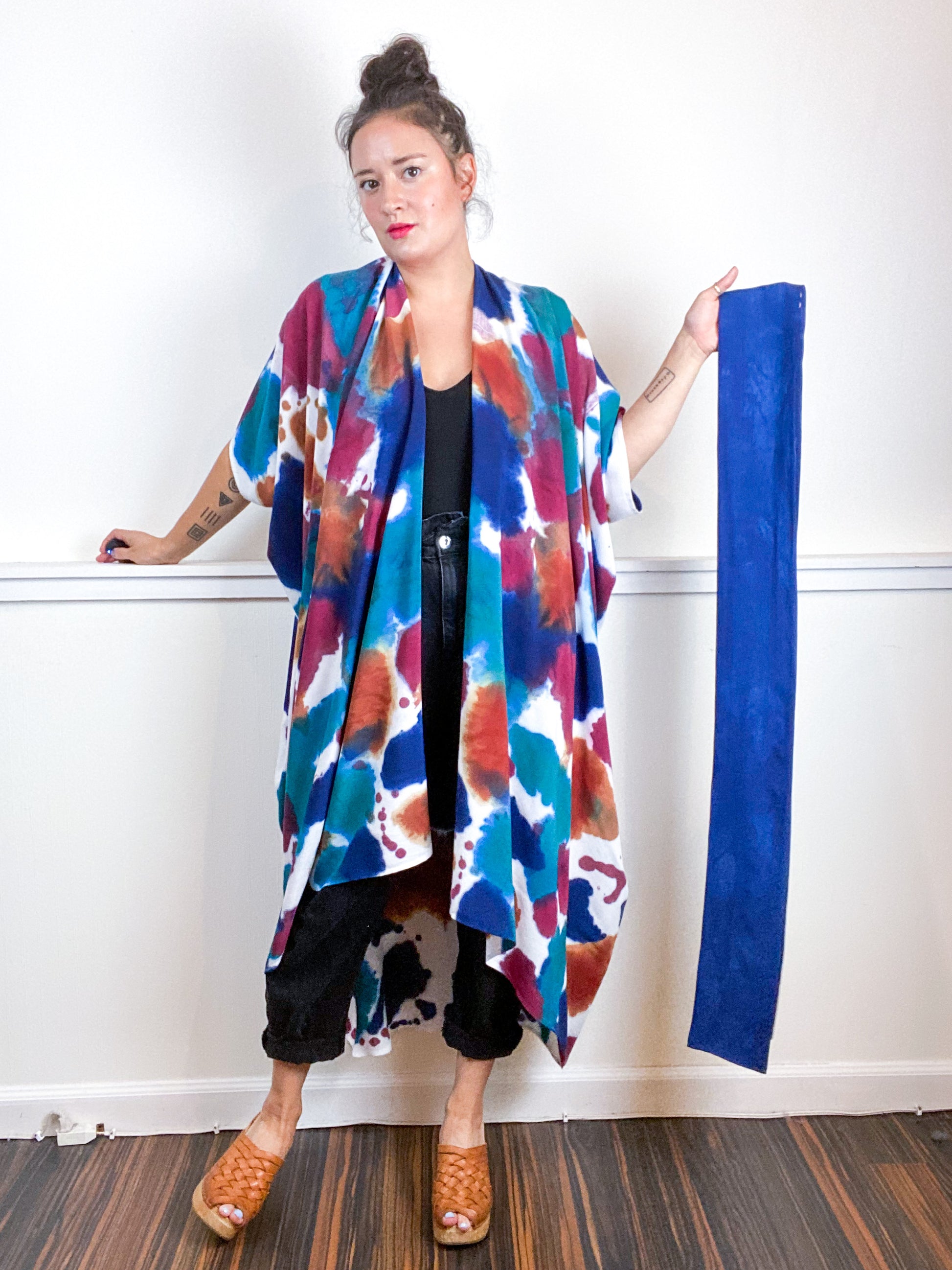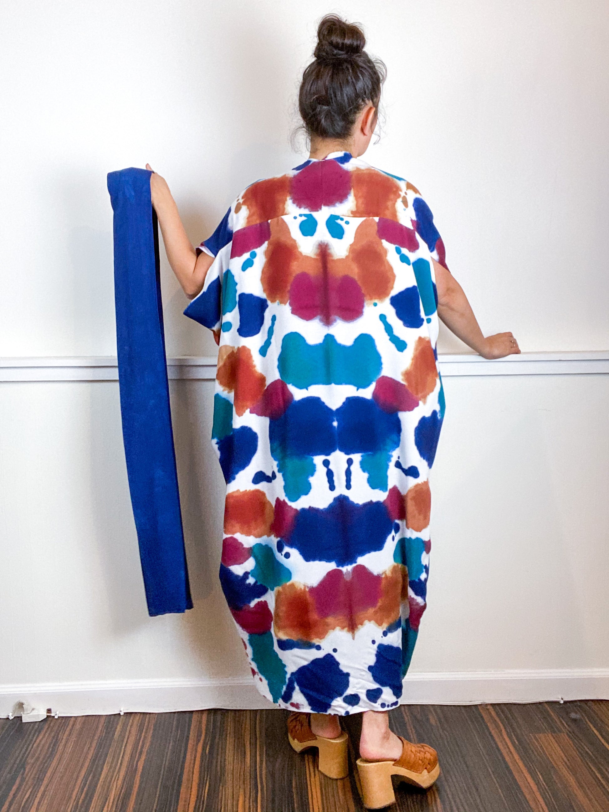 Soft and airy kimono with a flowing silhouette, tulip selvage sleeve detail, curved high low hem and optional waist tie. Versatile shape can be styled as a wrap dress, lightweight jacket over jeans, or an elegant robe over lingerie. The minimalist design created from a full rectangle of fabric drapes beautifully over the shoulders and produces no material waste by utilizing one whole piece of fabric without scraps from corners and irregular cuts. Lightweight woven fabric is hand-dyed with an inkblot pattern using algae thickened dyes in Martin, terracotta, indigo and teal hues.