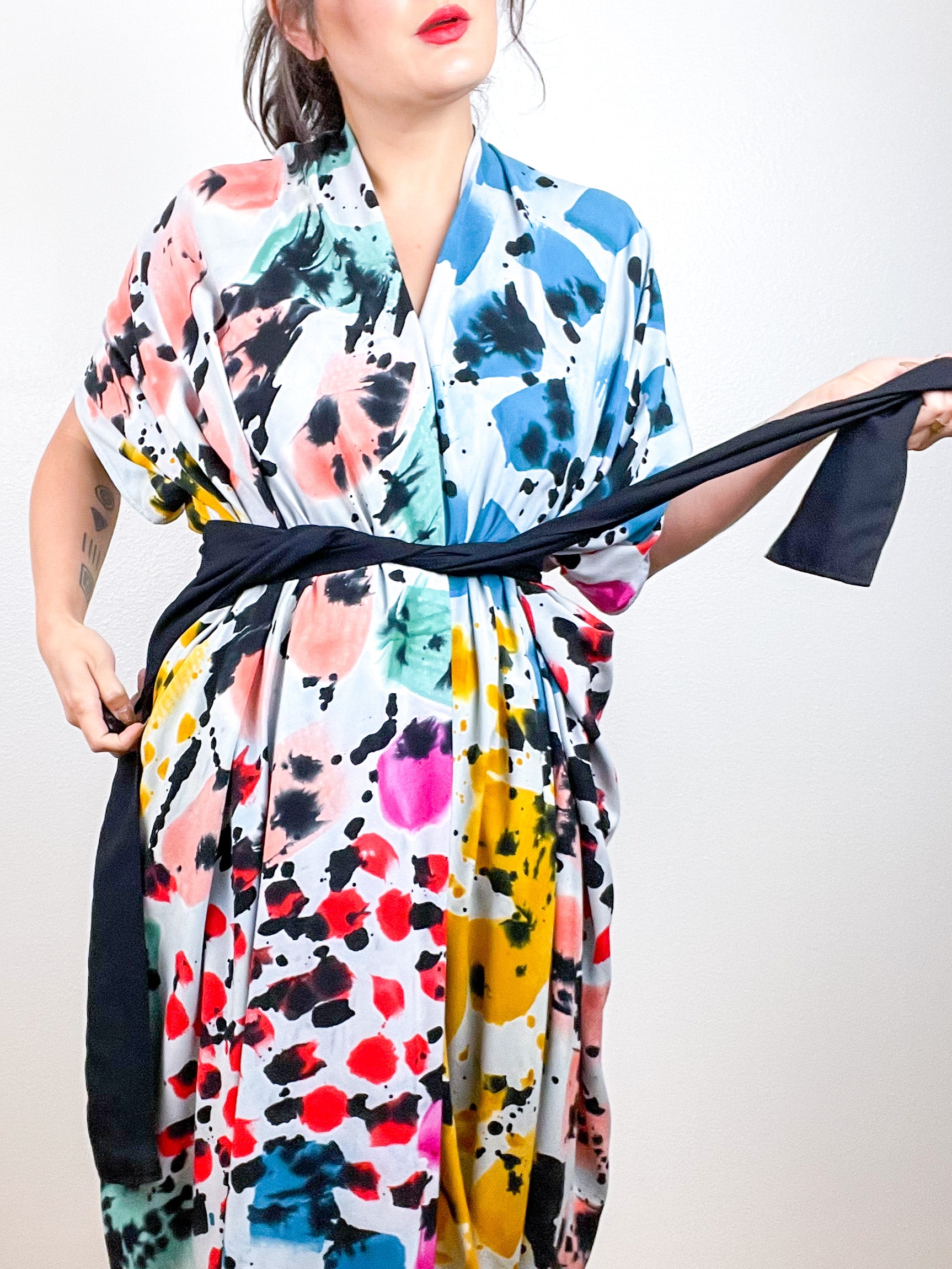 Soft and airy kimono with a flowing silhouette, tulip sleeve detail, curved high low hem and separate waist tie. Versatile shape can be styled as a wrap dress, an open kimono without the tie, or a robe for staying home. The minimalist design created from a full rectangle of fabric drapes beautifully over the shoulders and produces no material waste by utilizing one whole piece of fabric without scraps from corners and irregular cuts. Lightweight woven teal fabric is hand painted with algae thickened dye in fuchsia, coral, scarlet, marigold, celadon, teal and black using varying brush patterns.