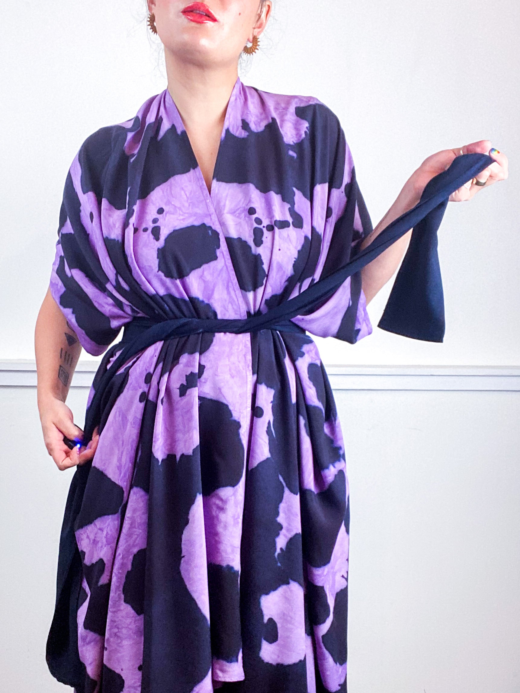 Soft and airy kimono with a flowing silhouette, tulip selvage sleeve detail, curved high low hem and optional waist tie. Versatile shape can be styled as a wrap dress, lightweight jacket over jeans, or an elegant robe over lingerie. The minimalist design created from a full rectangle of fabric drapes beautifully over the shoulders and produces no material waste by utilizing one whole piece of fabric without scraps from corners and irregular cuts. Lightweight woven fabric is hand-dyed with an inkblot pattern using algae thickened dyes in raven and orchid hues.