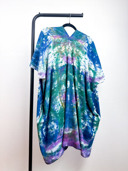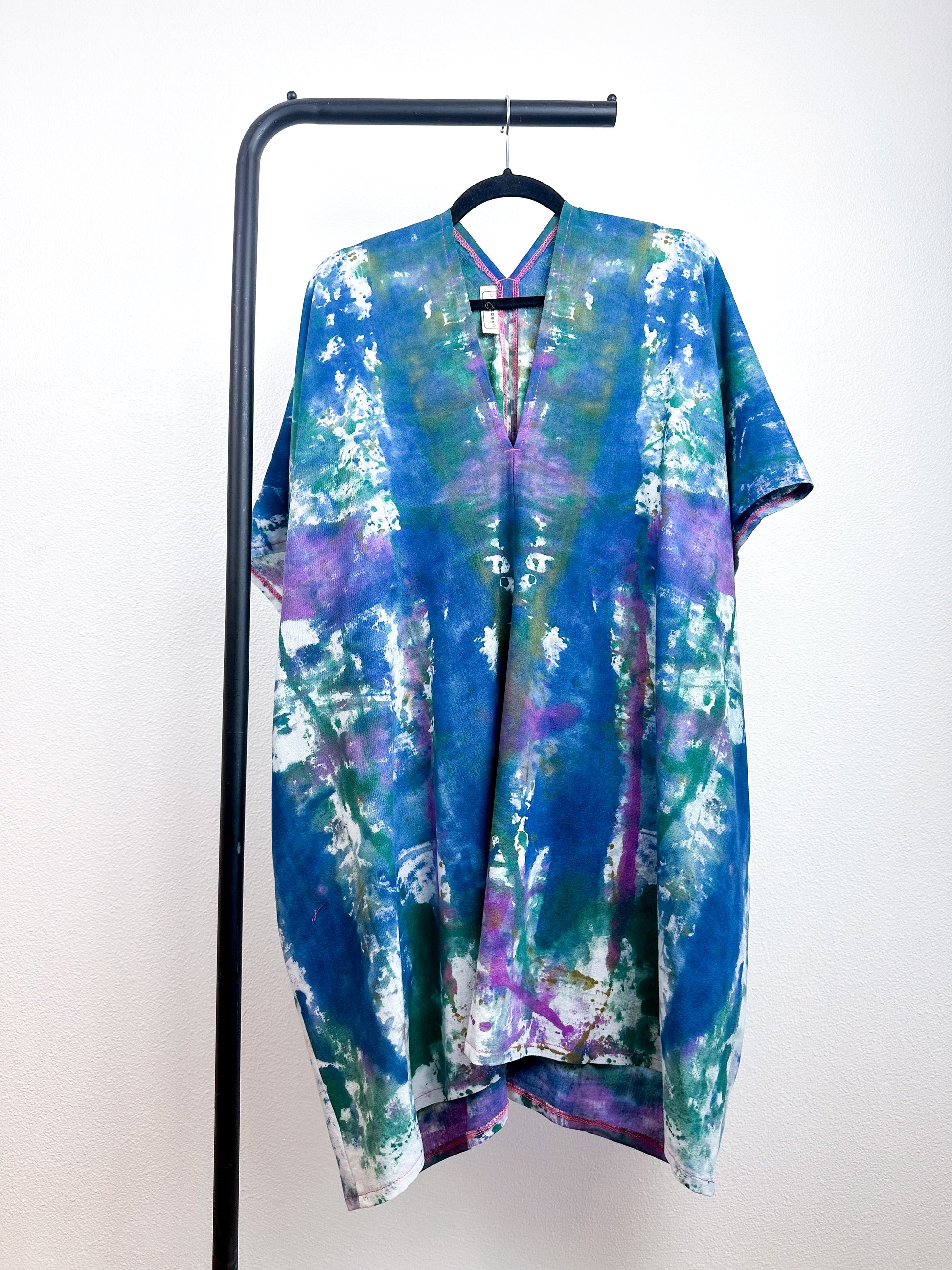 Linen rayon blend smock dress with an oversized silhouette, deep V neckline and contrast teal pockets. Versatile shape can be styled as a dress or tunic. The minimalist design created from full rectangles of fabric produces little to no material waste. Linen rayon fabric is hand-dyed with colors inspired by Rabanal, Spain using a watercolor technique.