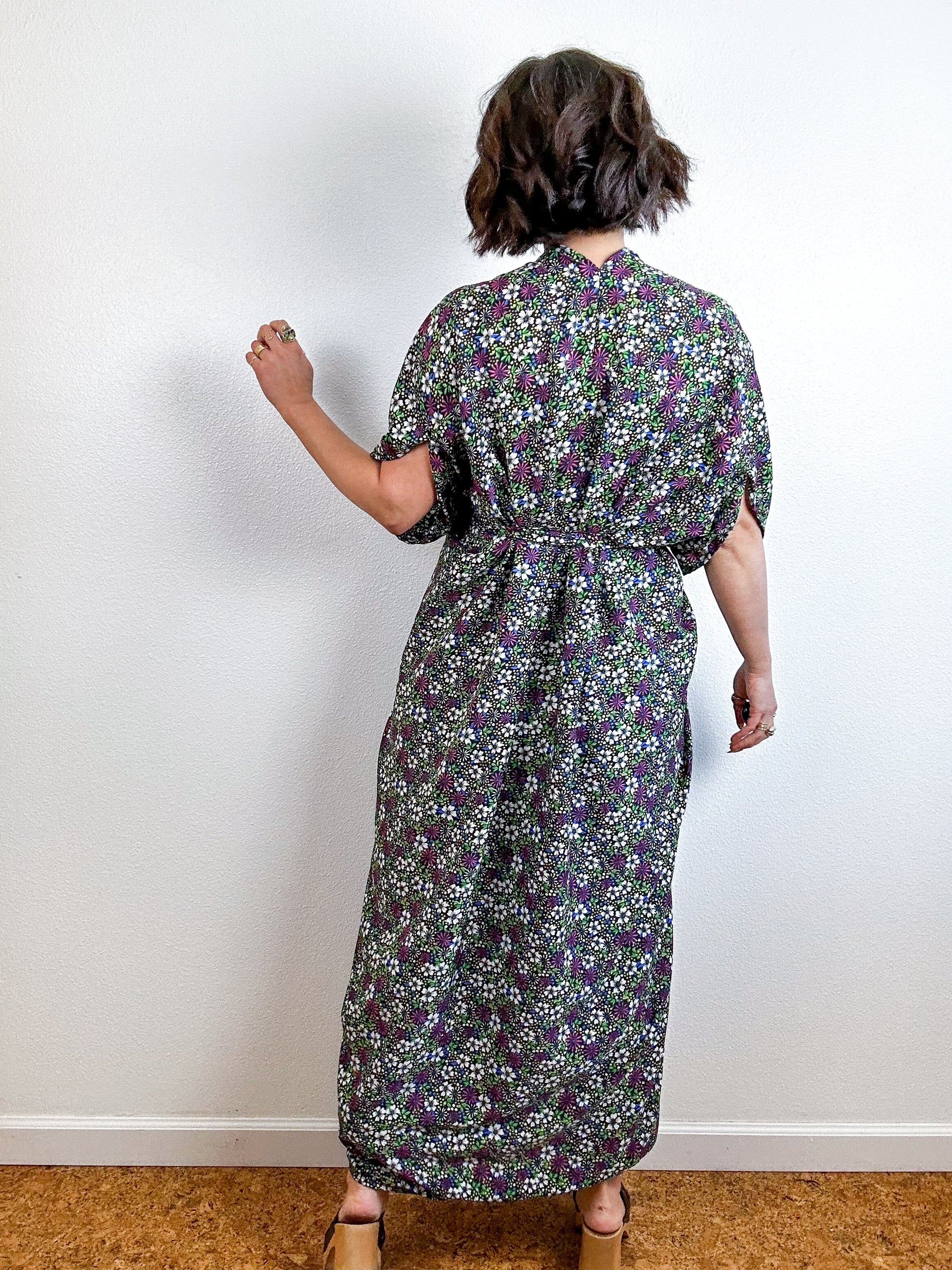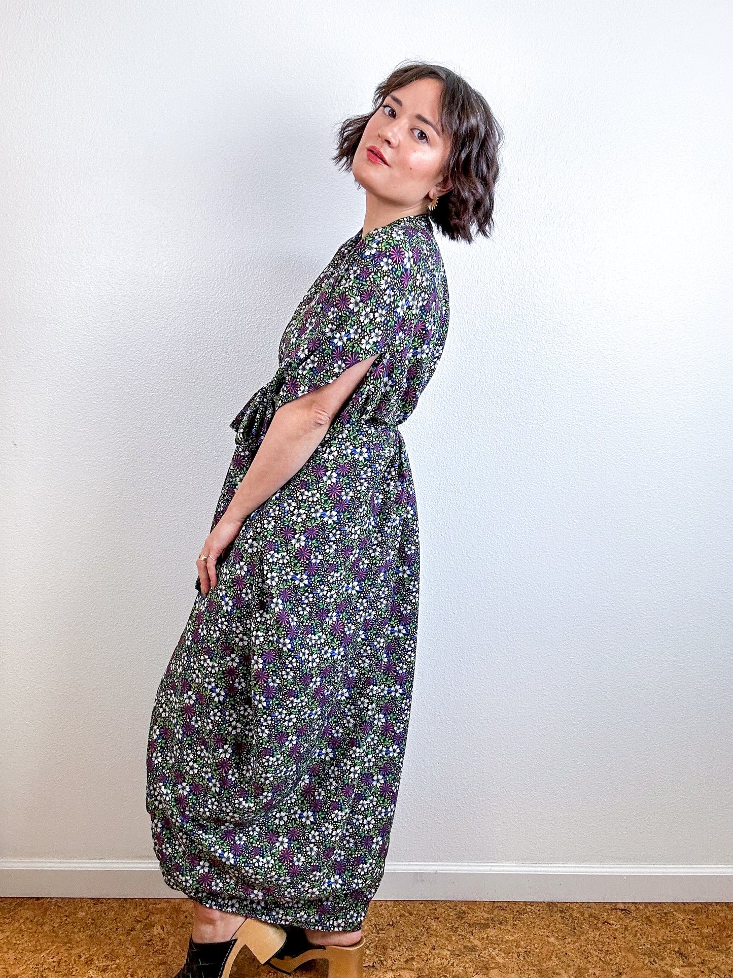 Light and airy kimono with a flowing silhouette, selvage sleeve detail, curved high low hem and optional waist tie. Versatile shape can be styled as a wrap dress, lightweight jacket over jeans, swimsuit coverup, or an elegant robe over lingerie. The minimalist design created from a full rectangle of fabric drapes beautifully over the shoulders and produces little to no material waste by utilizing one whole piece of fabric without scraps from corners and irregular cuts. Black purple green mini floral print fabric with a smooth surface and slight sheen.