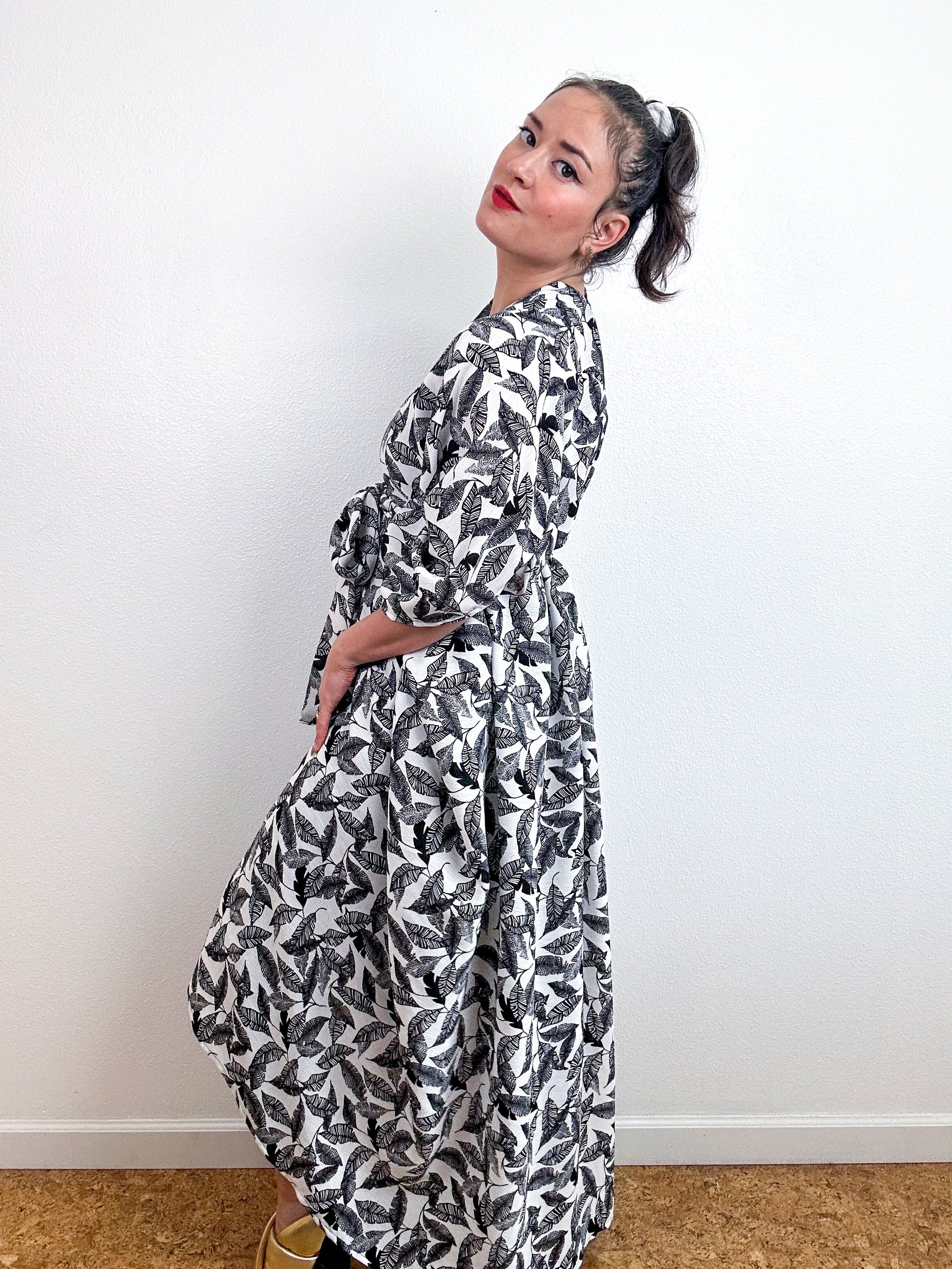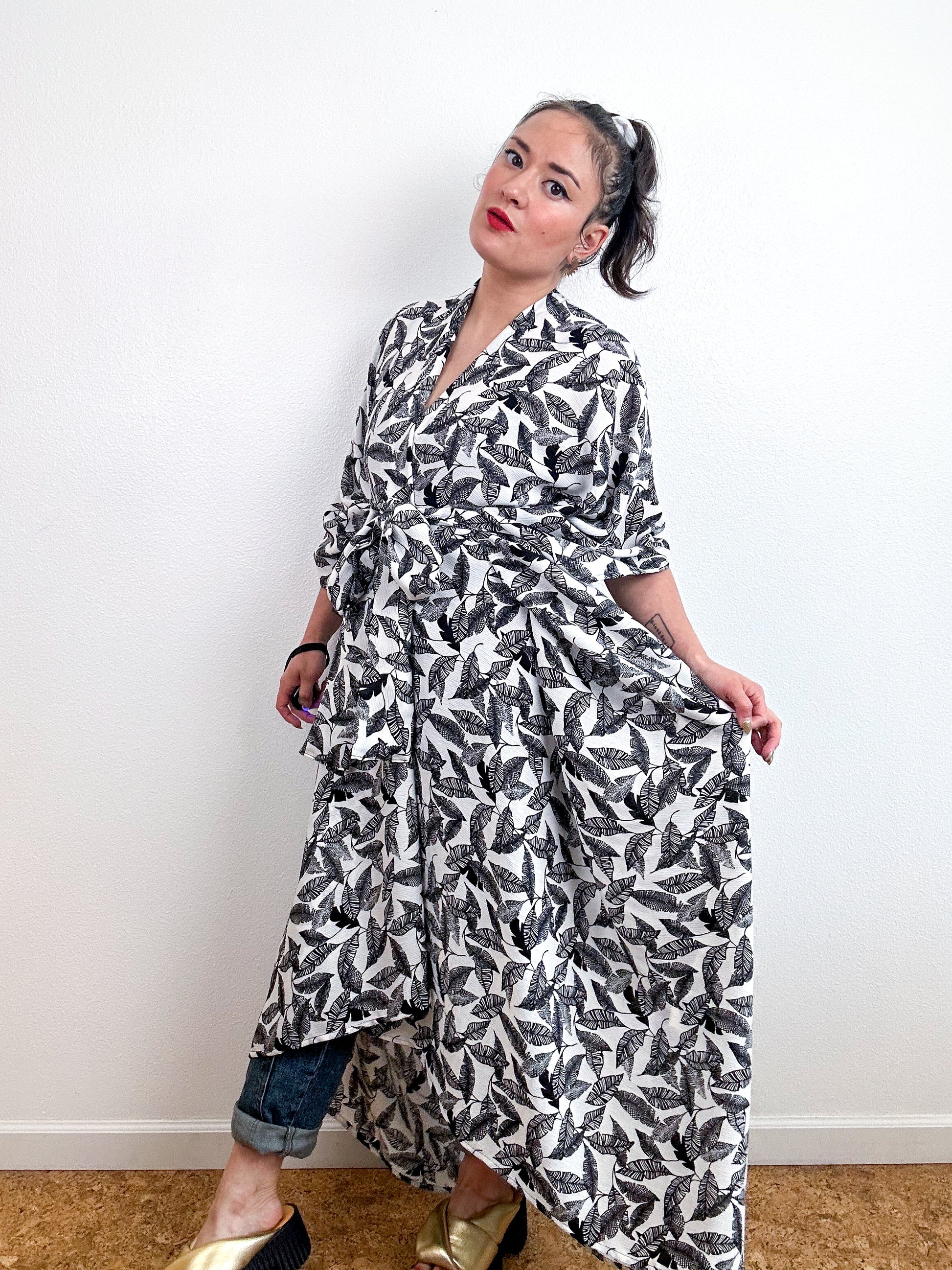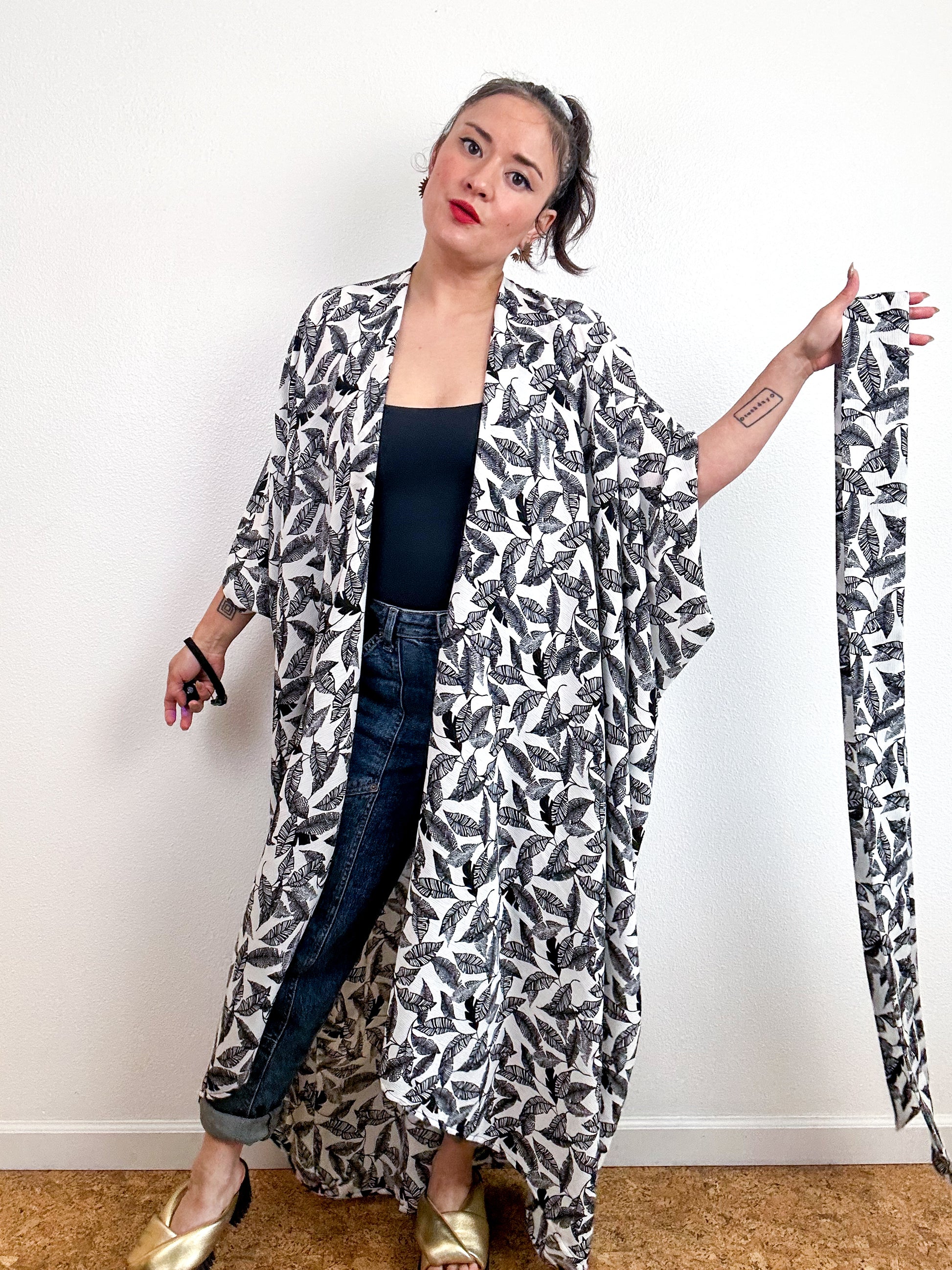 Light and airy kimono with a flowing silhouette, selvage sleeve detail, curved high low hem and optional waist tie. Versatile shape can be styled as a wrap dress, lightweight jacket over jeans, swimsuit coverup, or an elegant robe over lingerie. The minimalist design created from a full rectangle of fabric drapes beautifully over the shoulders and produces little to no material waste by utilizing one whole piece of fabric without scraps from corners and irregular cuts. Black white feather print crinkle challis fabric with a silky textured hand.