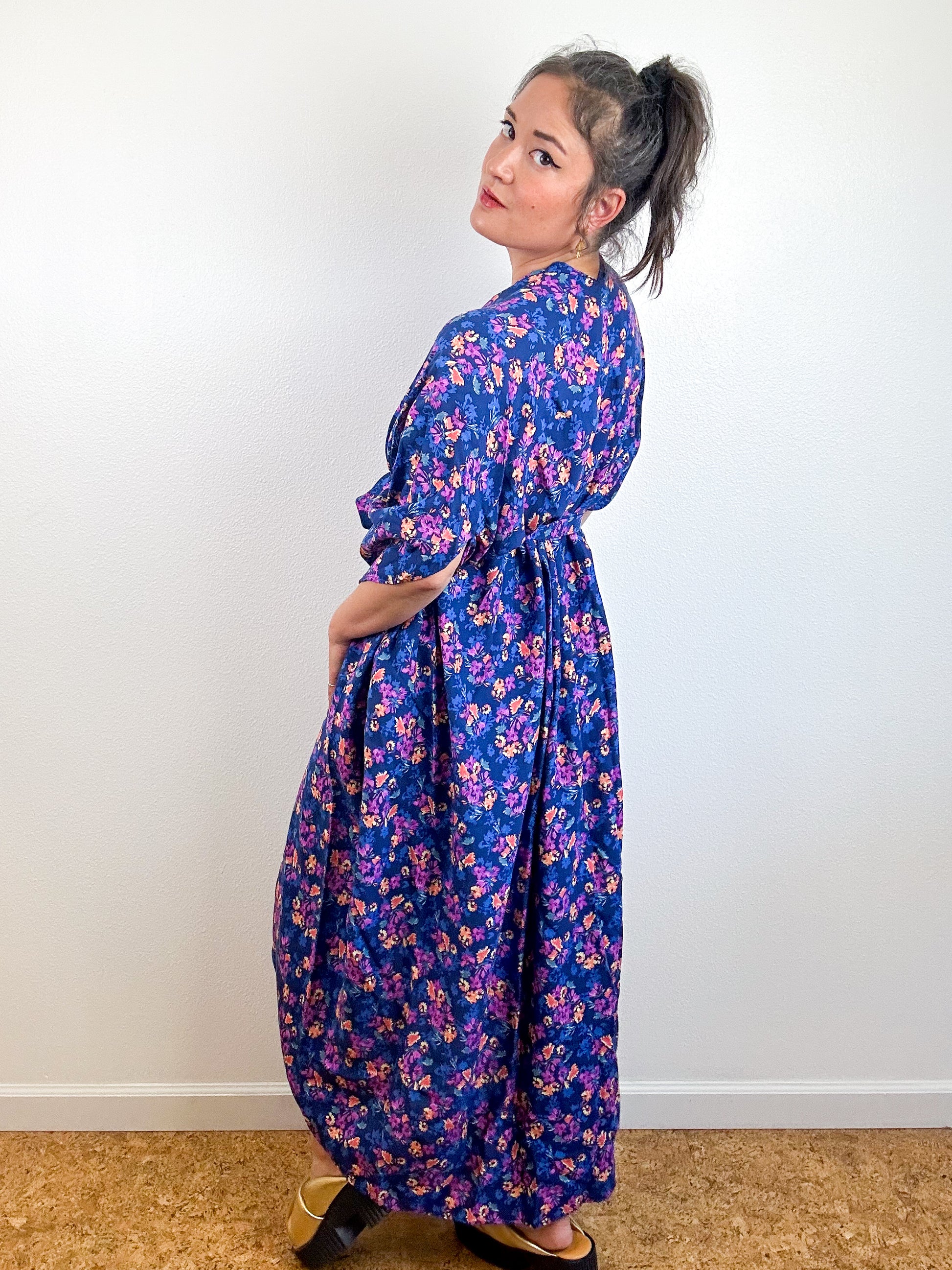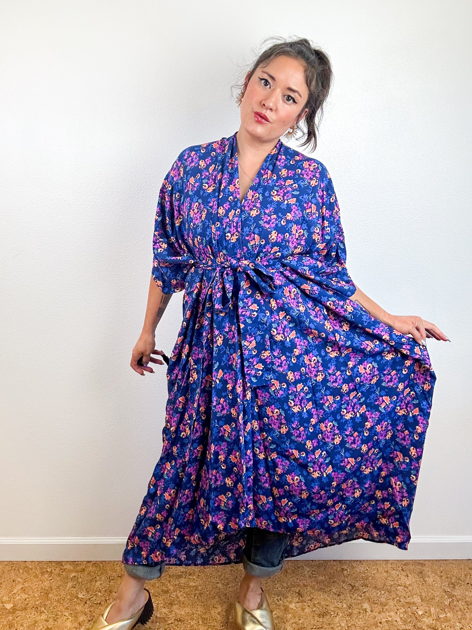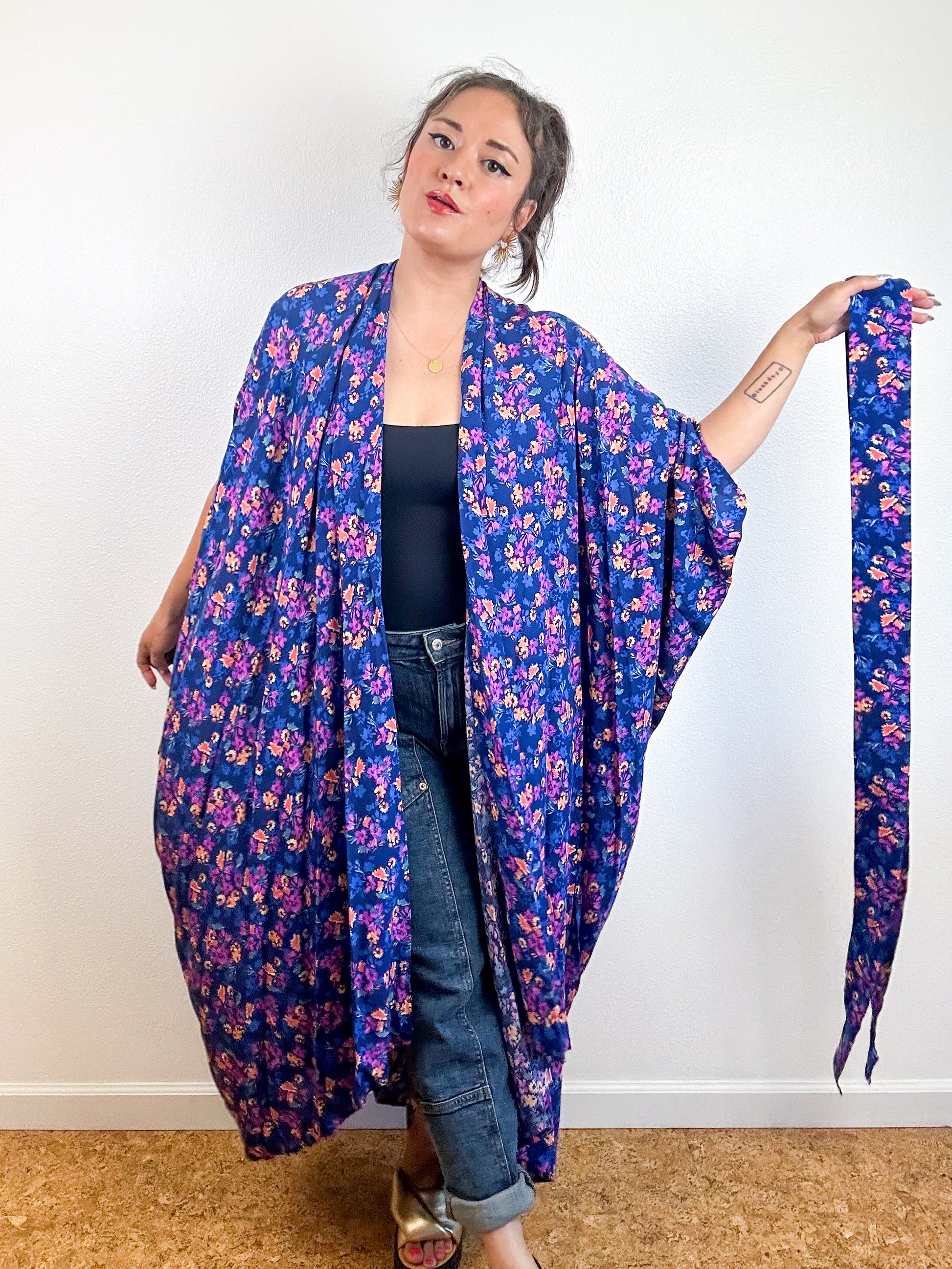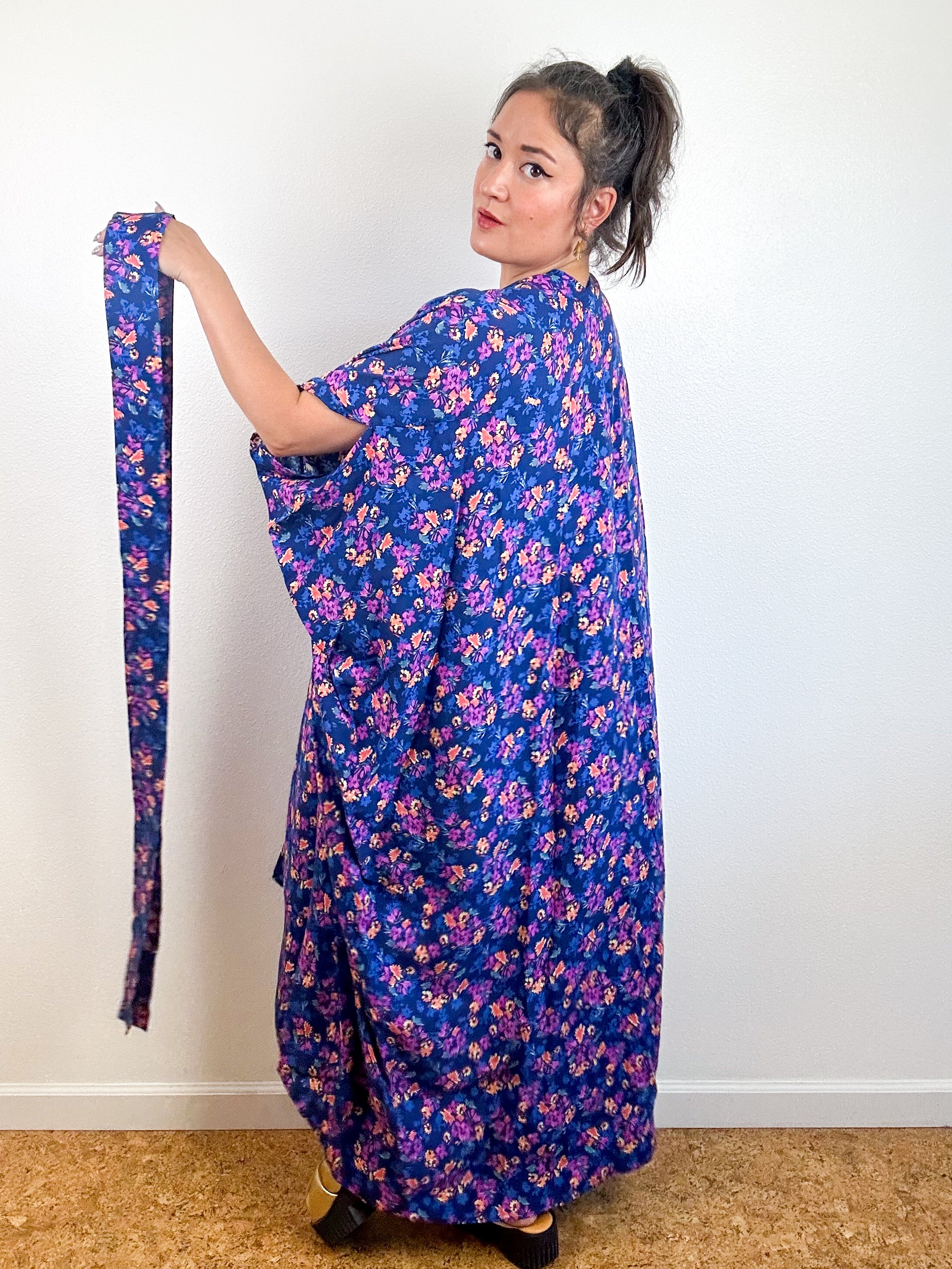 Light and airy kimono with a flowing silhouette, selvage sleeve detail, curved high low hem and optional waist tie. Versatile shape can be styled as a wrap dress, lightweight jacket over jeans, swimsuit coverup, or an elegant robe over lingerie. The minimalist design created from a full rectangle of fabric drapes beautifully over the shoulders and produces little to no material waste by utilizing one whole piece of fabric without scraps from corners and irregular cuts. Magenta and blue floral print rayon challis fabric with a silky smooth surface.