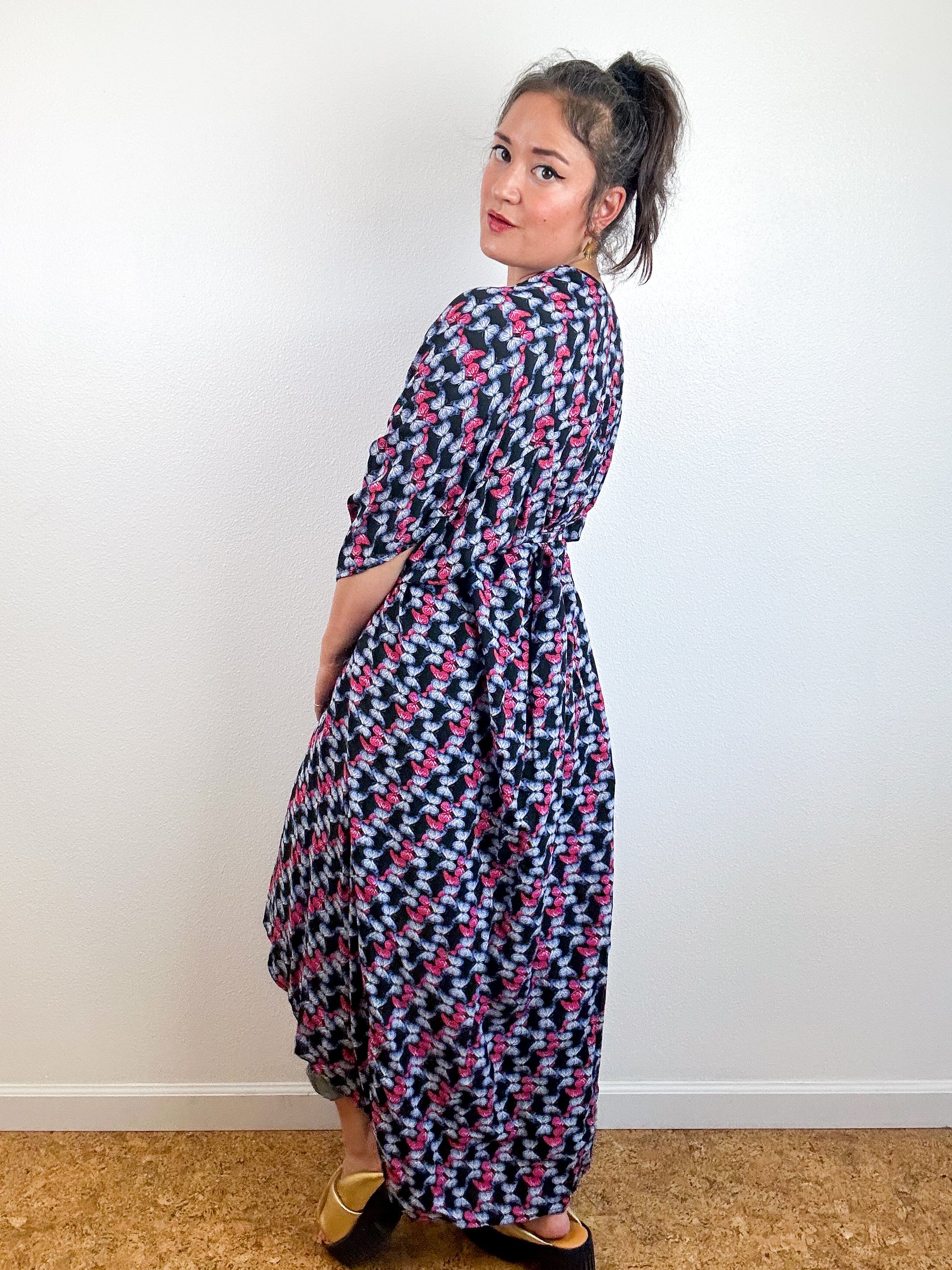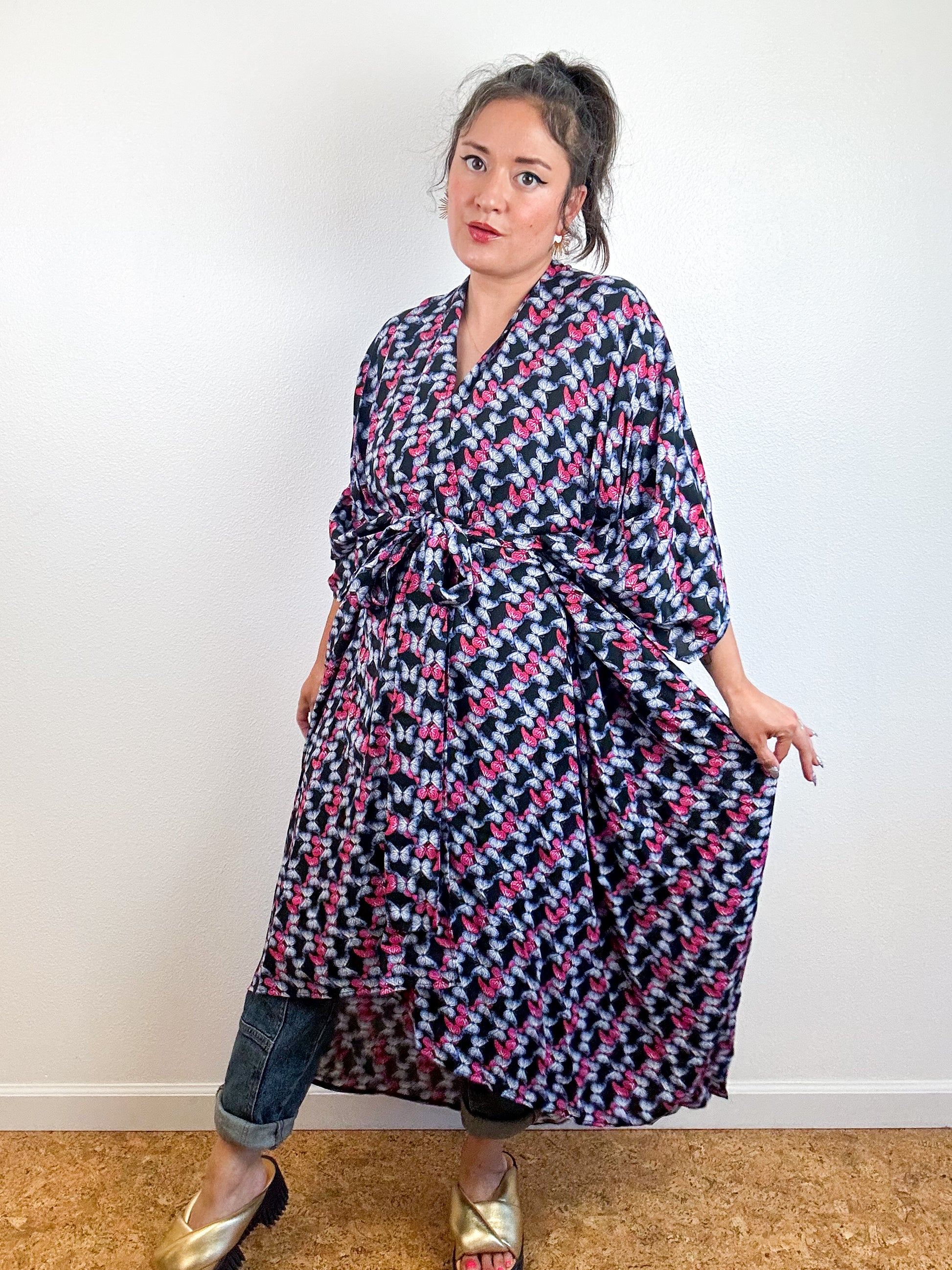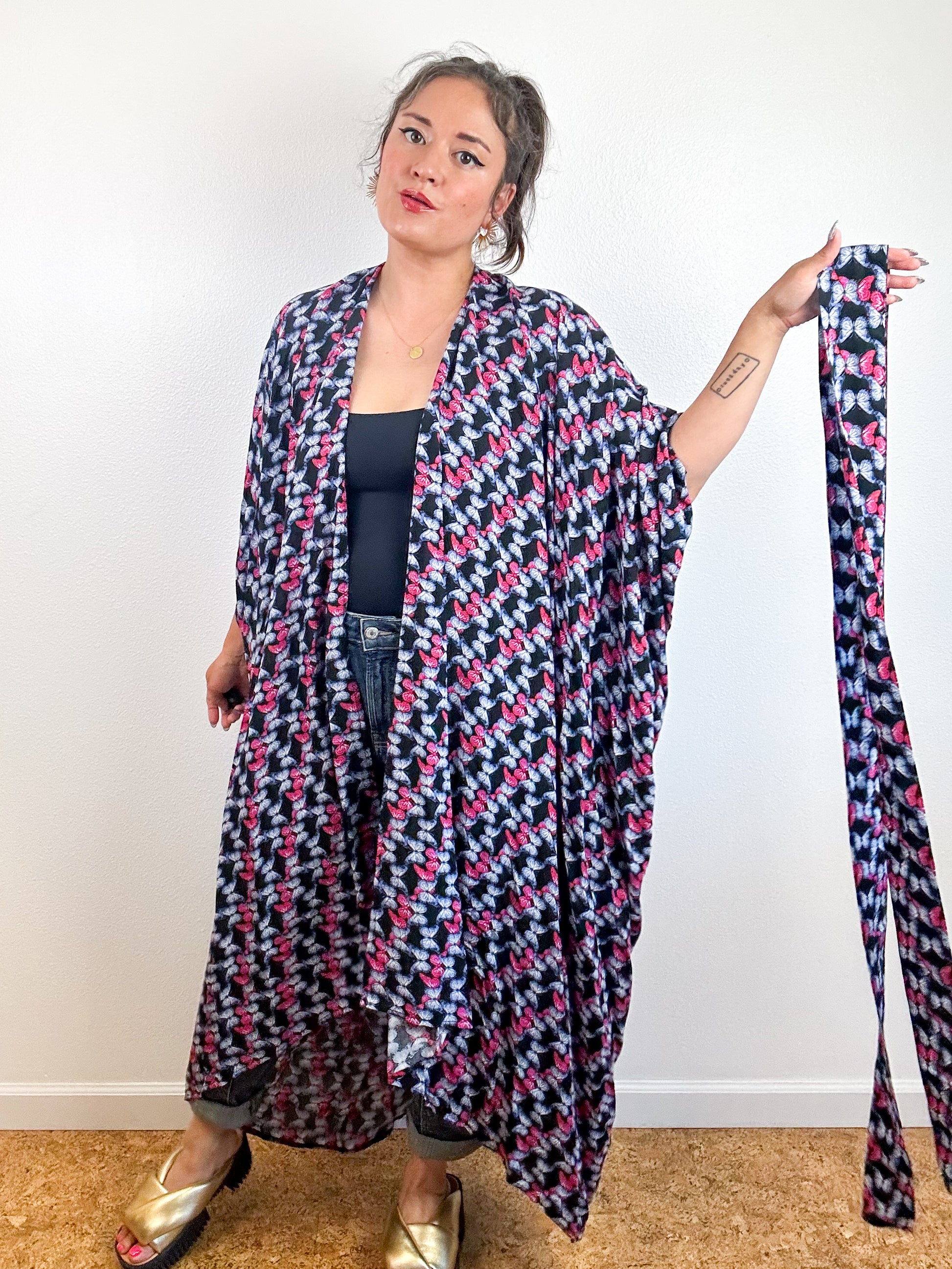 Light and airy kimono with a flowing silhouette, selvage sleeve detail, curved high low hem and optional waist tie. Versatile shape can be styled as a wrap dress, lightweight jacket over jeans, swimsuit coverup, or an elegant robe over lingerie. The minimalist design created from a full rectangle of fabric drapes beautifully over the shoulders and produces little to no material waste by utilizing one whole piece of fabric without scraps from corners and irregular cuts. Blue red black butterfly print rayon challis fabric with a silky smooth surface.