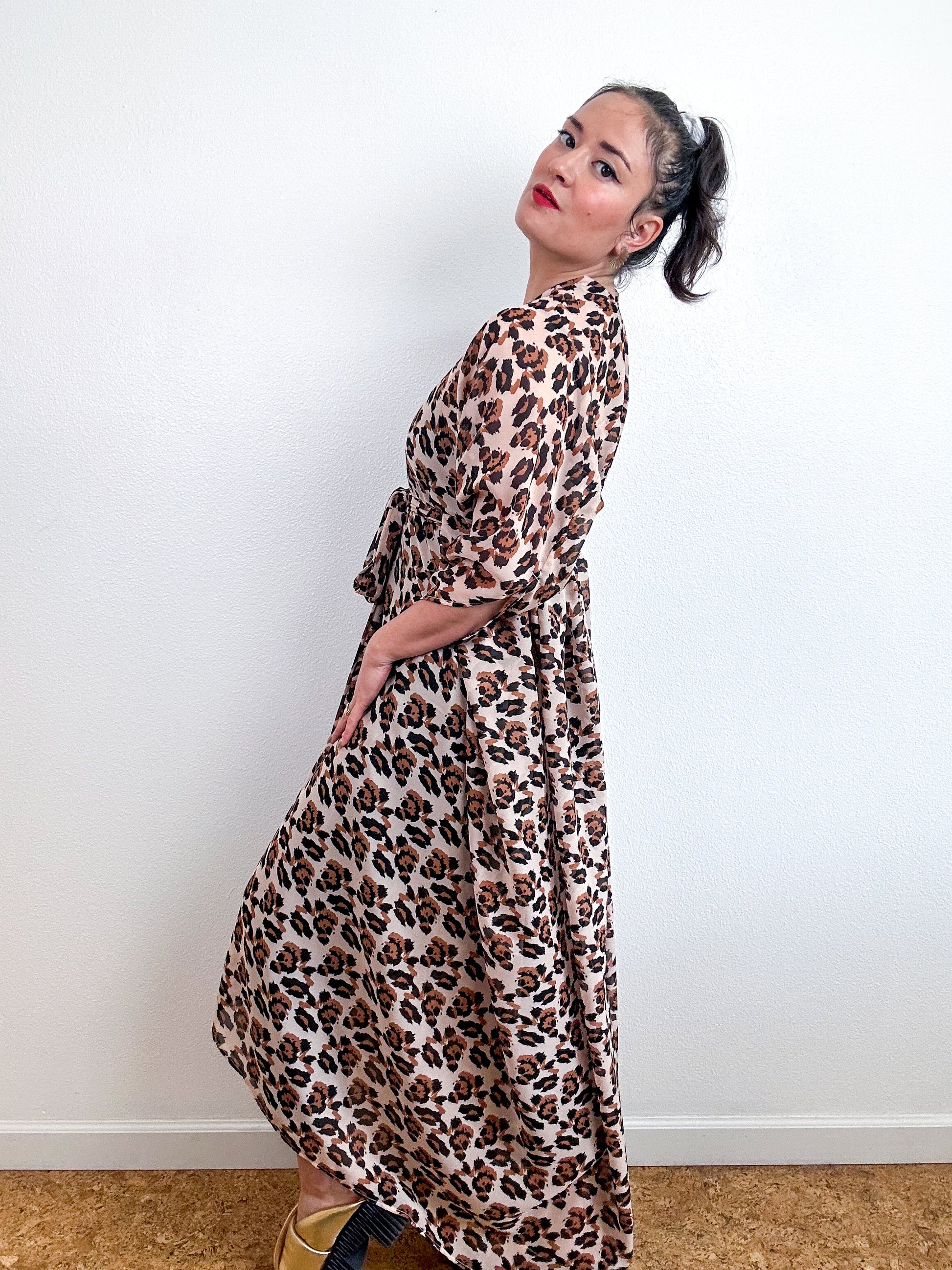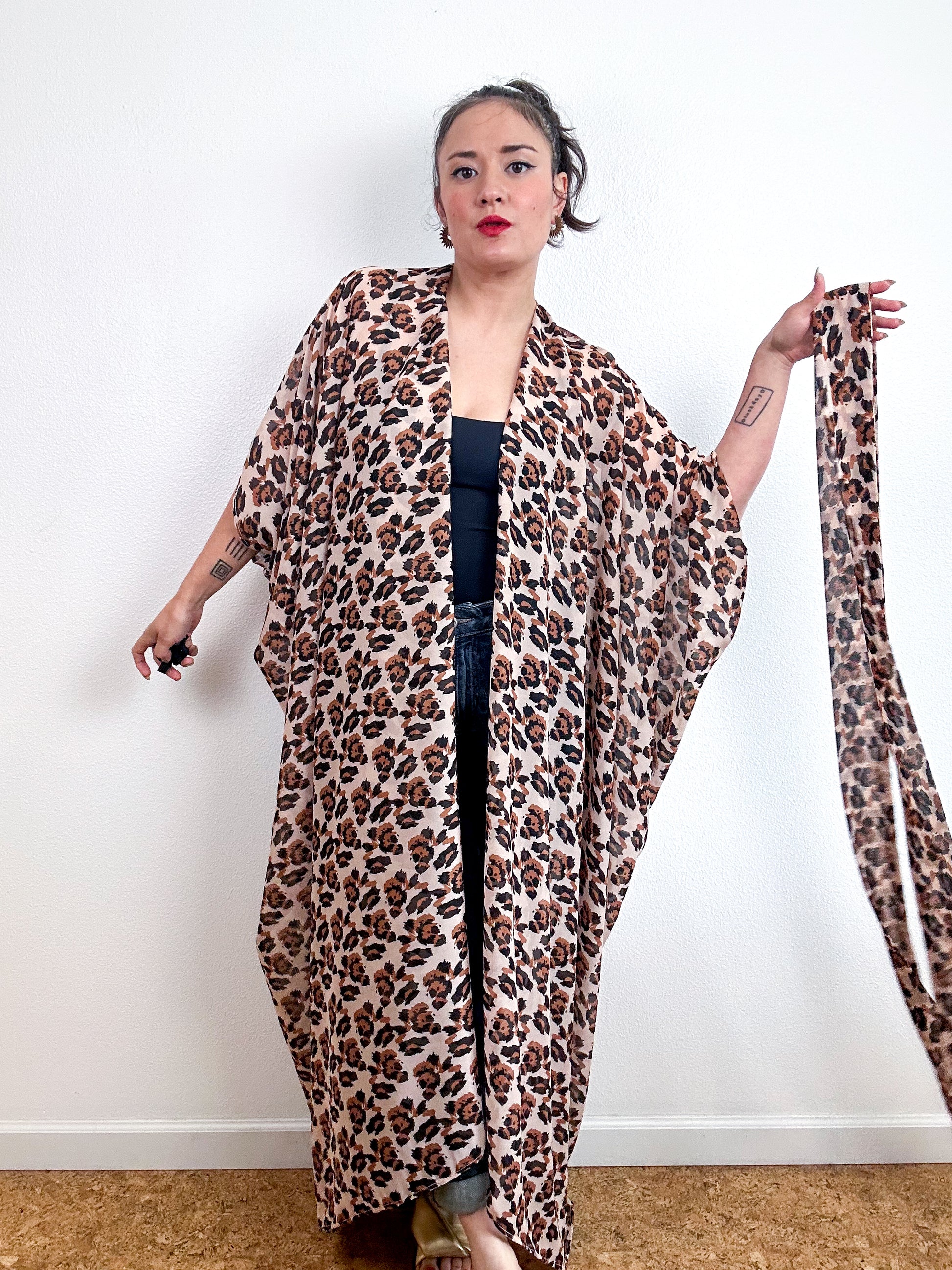 Light and airy kimono with a flowing silhouette, selvage sleeve detail, curved high low hem and optional waist tie. Versatile shape can be styled as a wrap dress, lightweight open layer, swimsuit coverup, or an elegant robe over lingerie. The minimalist design created from a full rectangle of fabric drapes beautifully over the shoulders and produces little to no material waste by utilizing one whole piece of fabric without scraps from corners and irregular cuts. Classic leopard print chiffon fabric with a gorgeous sheer drape and smooth hand.