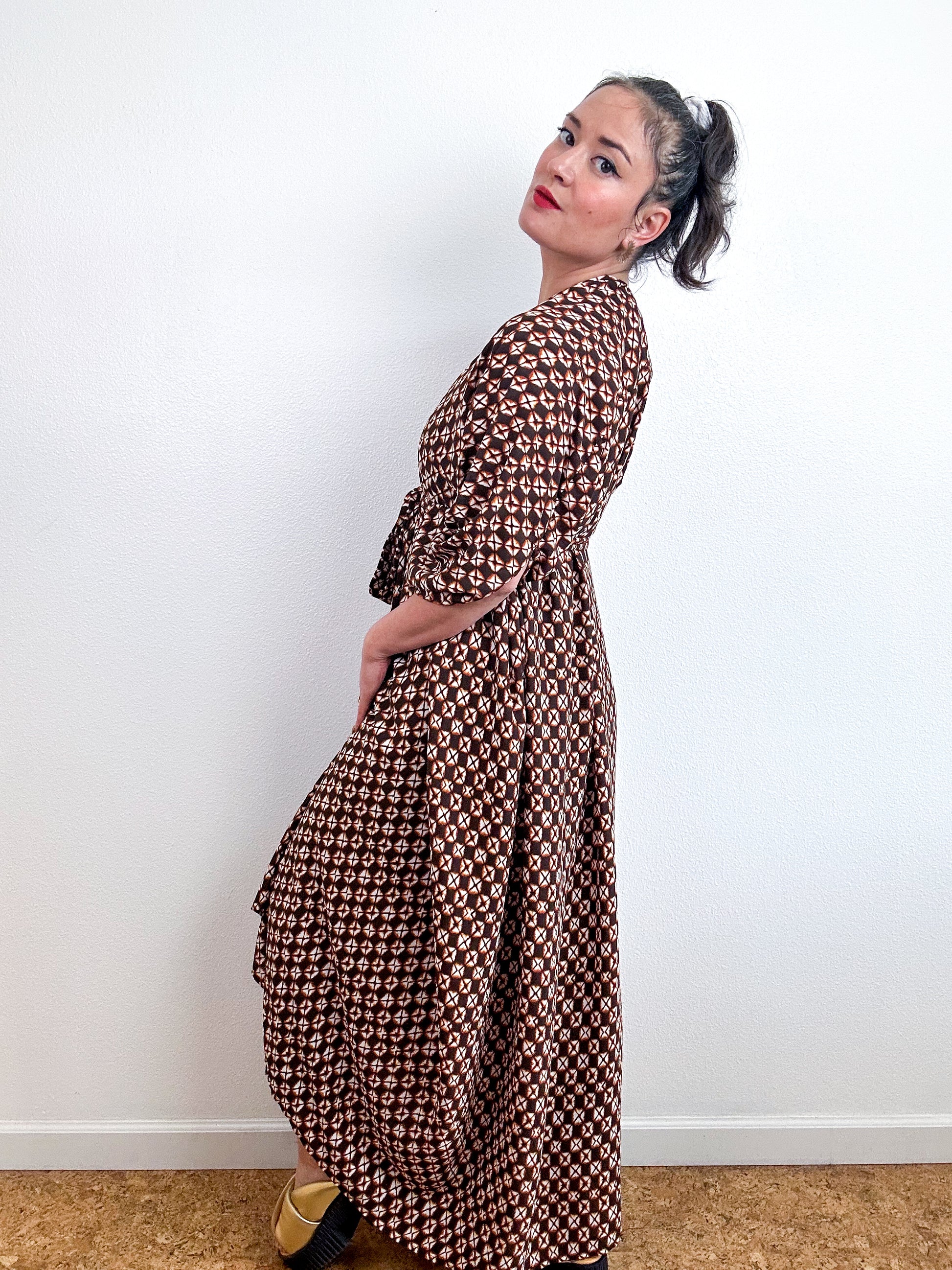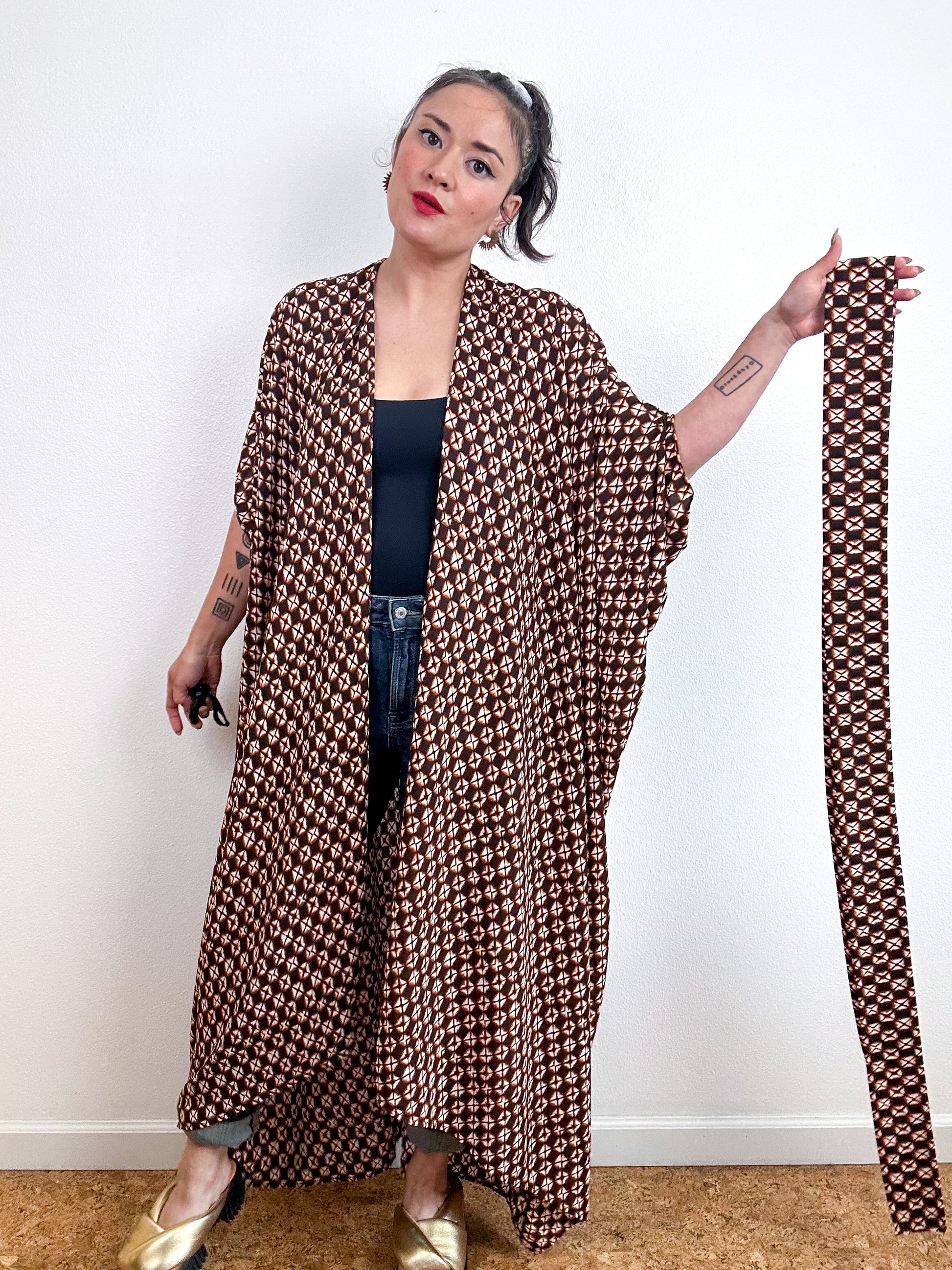 Light and airy kimono with a flowing silhouette, selvage sleeve detail, curved high low hem and optional waist tie. Versatile shape can be styled as a wrap dress, lightweight jacket over jeans, swimsuit coverup, or an elegant robe over lingerie. The minimalist design created from a full rectangle of fabric drapes beautifully over the shoulders and produces little to no material waste by utilizing one whole piece of fabric without scraps from corners and irregular cuts. Black and brown shibori print crepe fabric with a matte textured surface.