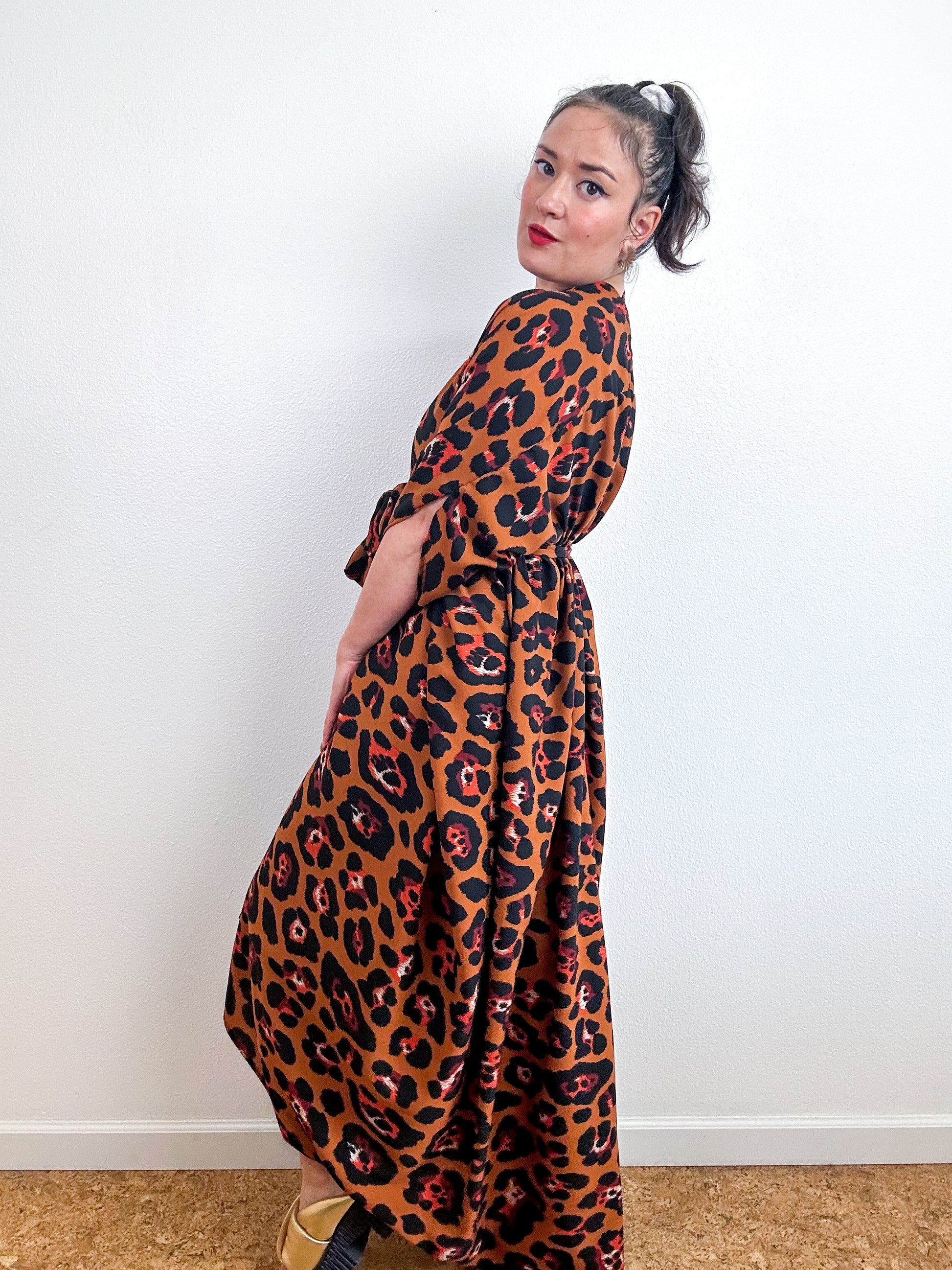 Light and airy kimono with a flowing silhouette, selvage sleeve detail, curved high low hem and optional waist tie. Versatile shape can be styled as a wrap dress, lightweight jacket over jeans, swimsuit coverup, or an elegant robe over lingerie. The minimalist design created from a full rectangle of fabric drapes beautifully over the shoulders and produces little to no material waste by utilizing one whole piece of fabric without scraps from corners and irregular cuts. Copper leopard print crepe georgette fabric with a matte textured surface.