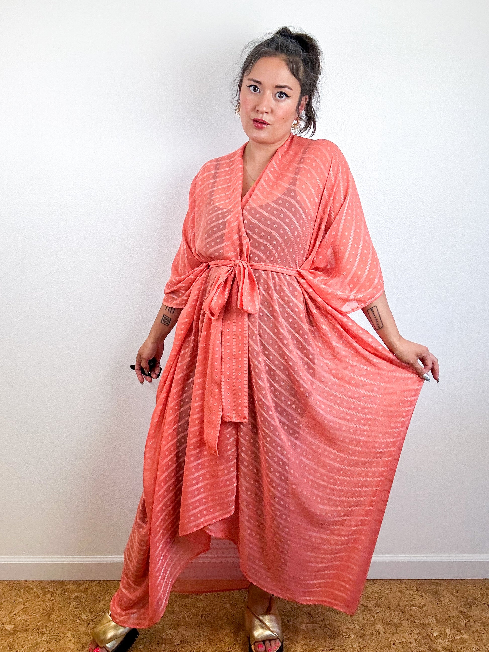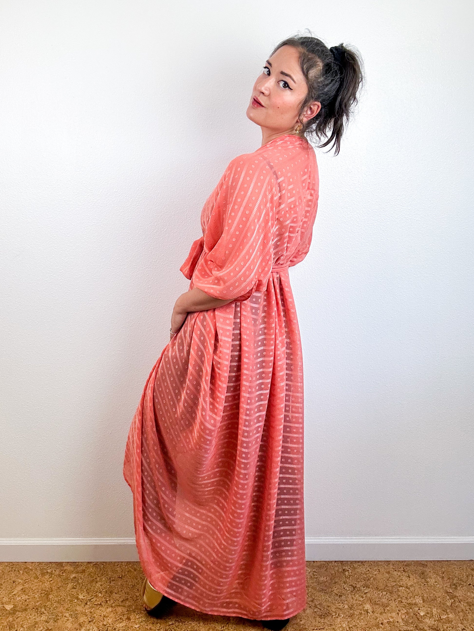 Light and airy kimono with a flowing silhouette, tulip sleeve detail, curved high low hem and optional waist tie. Versatile shape can be styled as a wrap dress, lightweight open layer, swimsuit coverup, or an elegant robe over lingerie. The minimalist design created from a full rectangle of fabric drapes beautifully over the shoulders and produces little to no material waste by utilizing one whole piece of fabric without scraps from corners and irregular cuts. Solid coral textured chiffon fabric with a sheer, silky finish.
