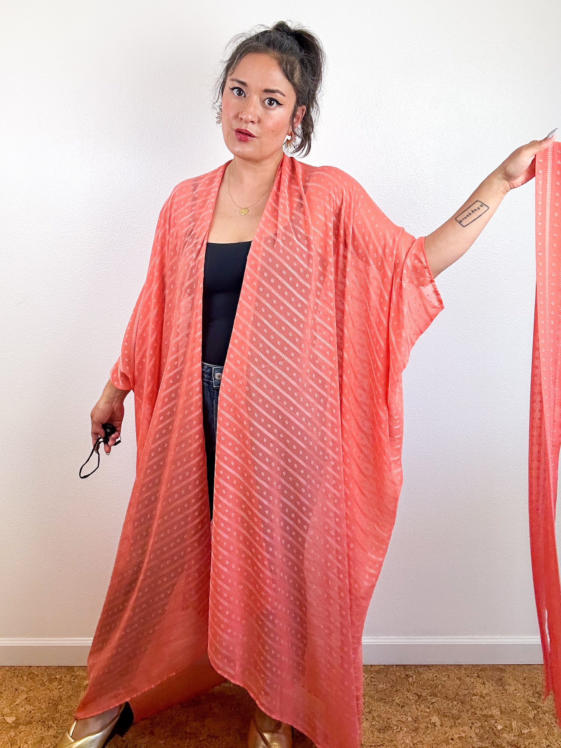 Print High Low Kimono Coral Dots Stripes Chiffon
