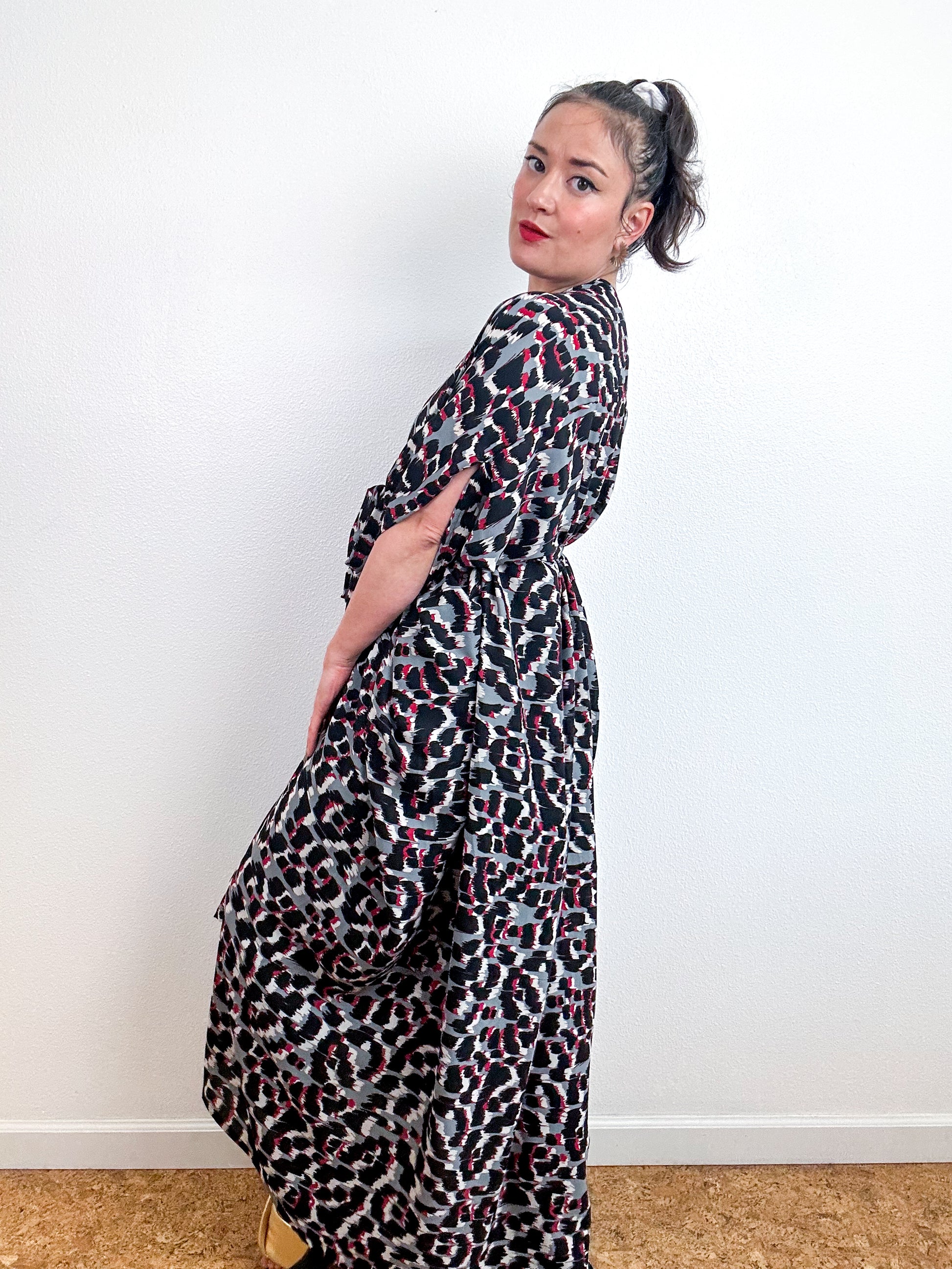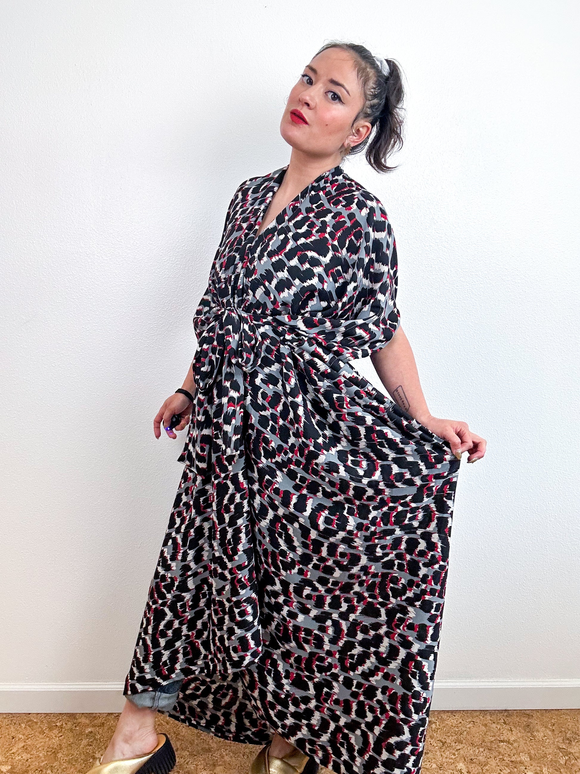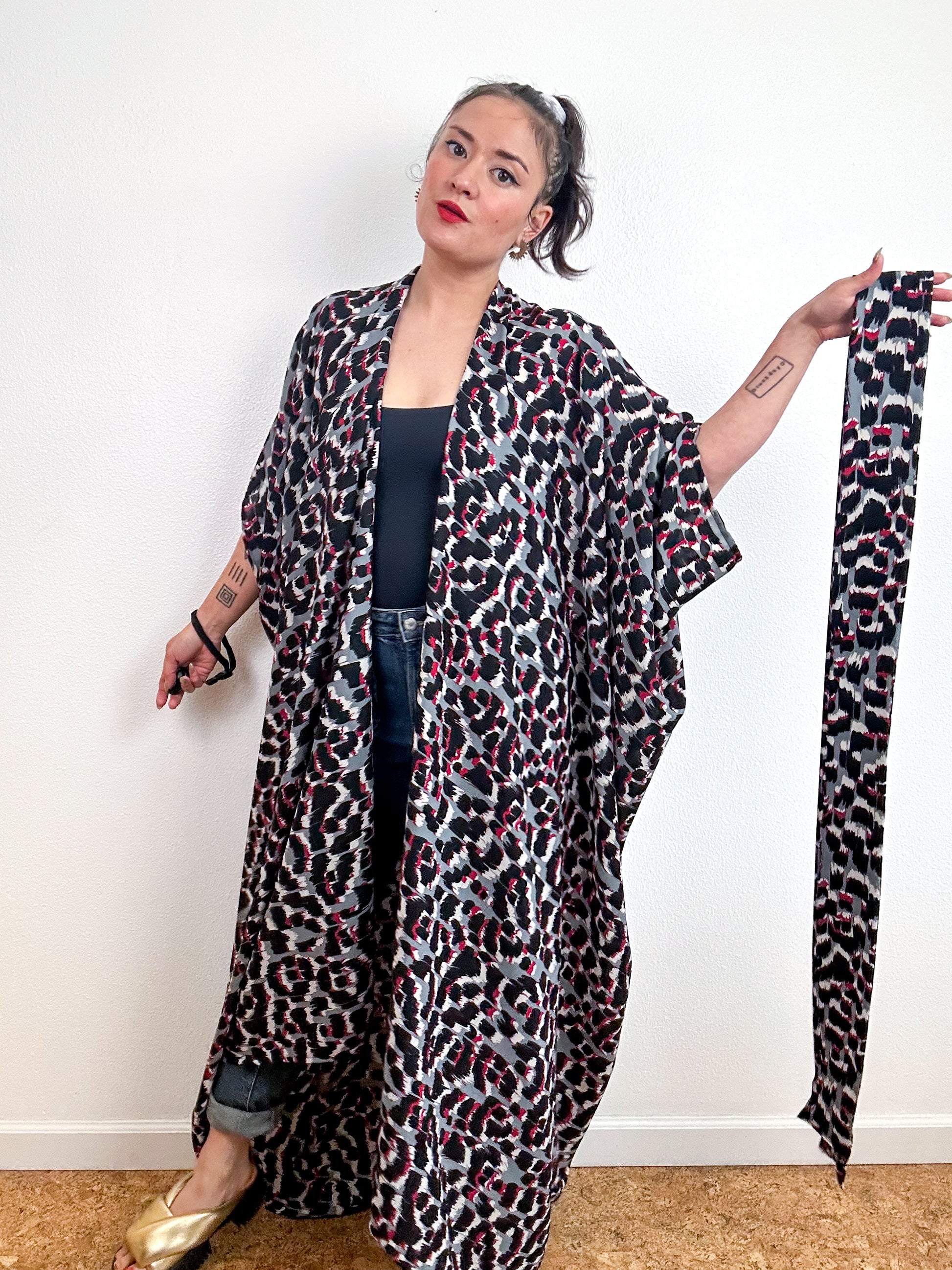 Light and airy kimono with a flowing silhouette, selvage sleeve detail, curved high low hem and optional waist tie. Versatile shape can be styled as a wrap dress, lightweight jacket over jeans, swimsuit coverup, or an elegant robe over lingerie. The minimalist design created from a full rectangle of fabric drapes beautifully over the shoulders and produces little to no material waste by utilizing one whole piece of fabric without scraps from corners and irregular cuts. Grey, red, black abstract print crepe georgette fabric with a matte textured surface.