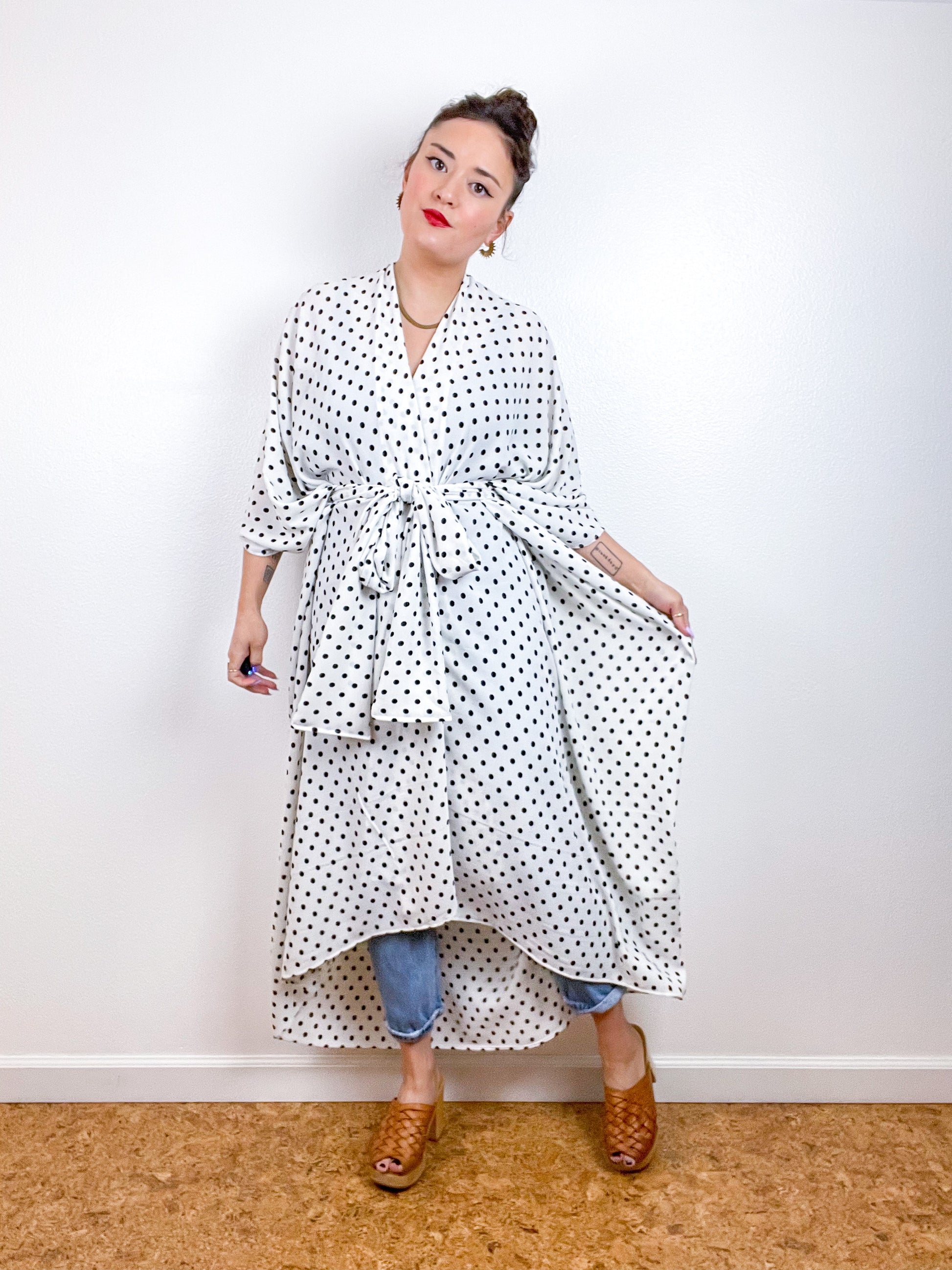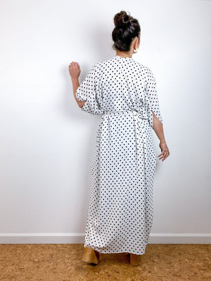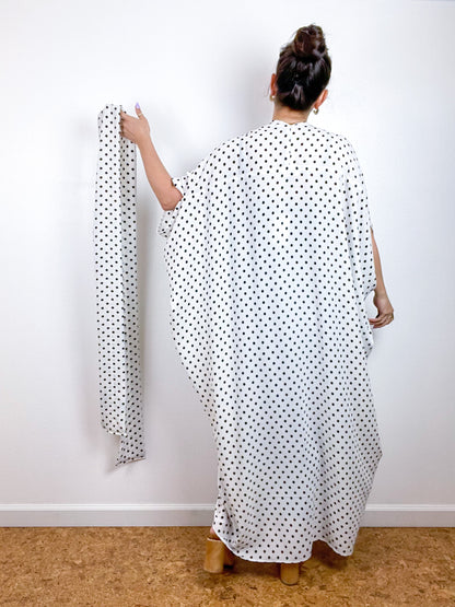 Light and airy kimono with a flowing silhouette, selvage sleeve detail, curved high low hem and optional waist tie. Versatile shape can be styled as a wrap dress, lightweight jacket over jeans, swimsuit coverup, or an elegant robe over lingerie. The minimalist design created from a full rectangle of fabric drapes beautifully over the shoulders and produces little to no material waste by utilizing one whole piece of fabric without scraps from corners and irregular cuts. Ivory and black polka dot print bubble crepe fabric with a matte textured surface.