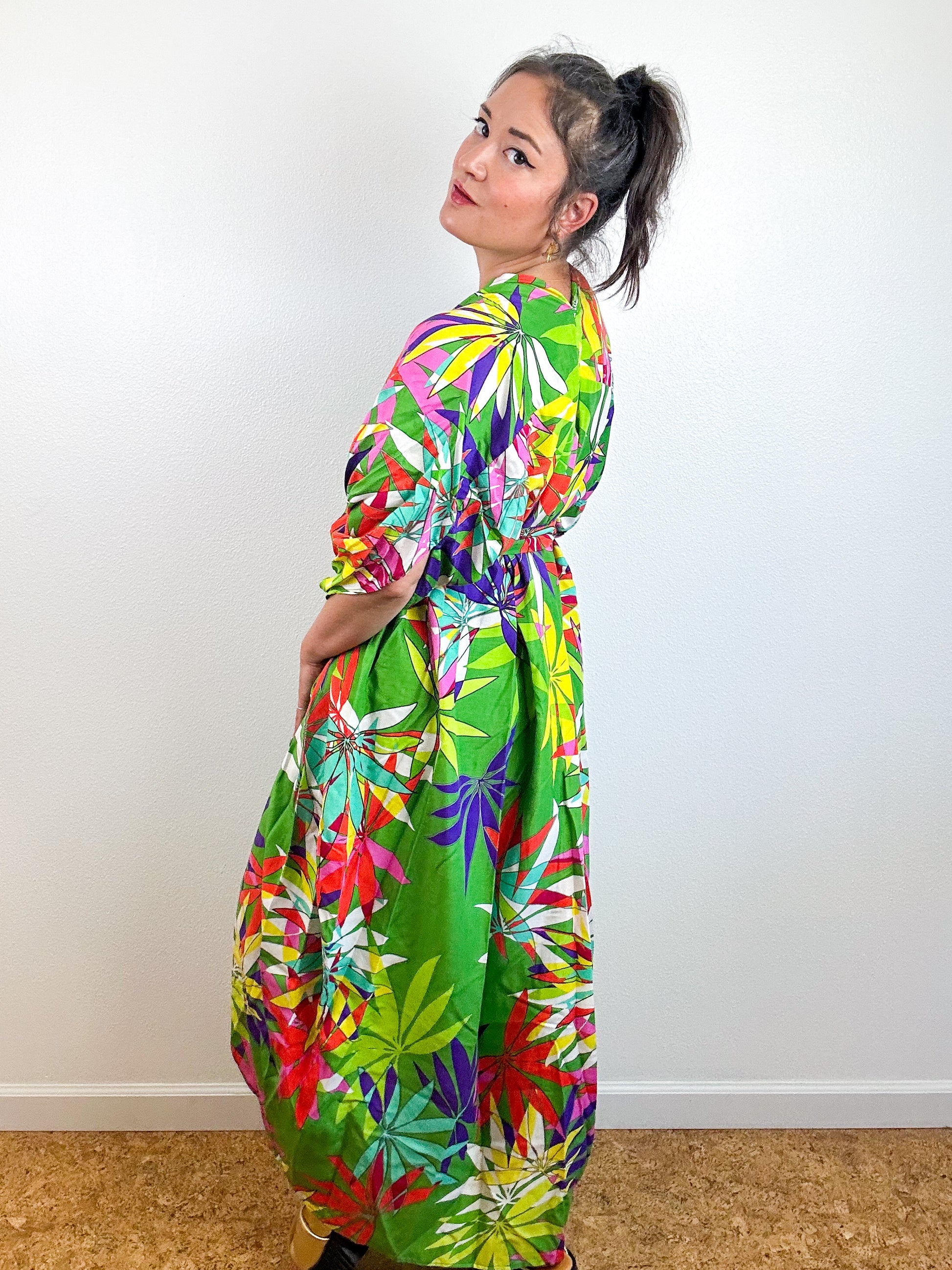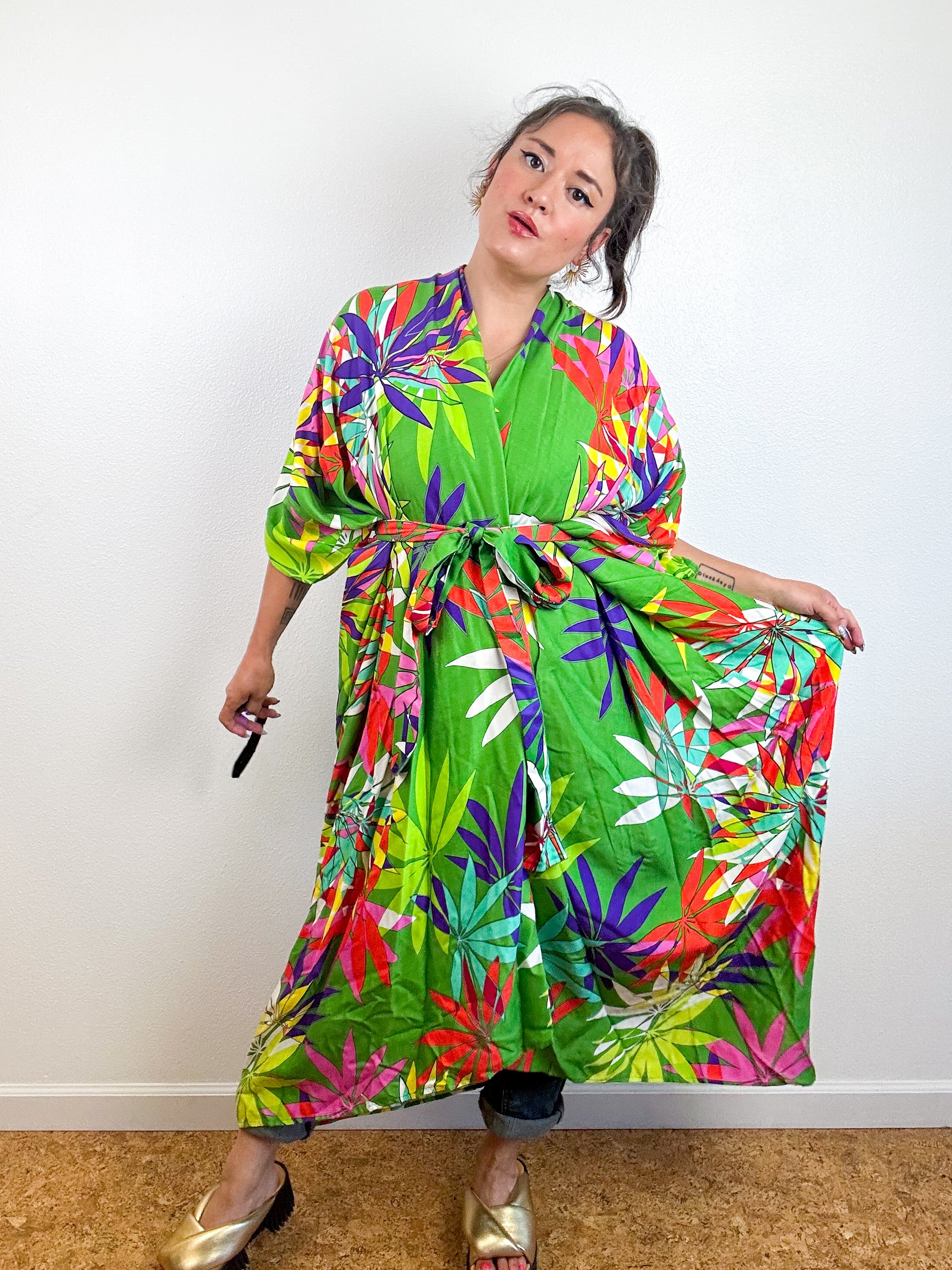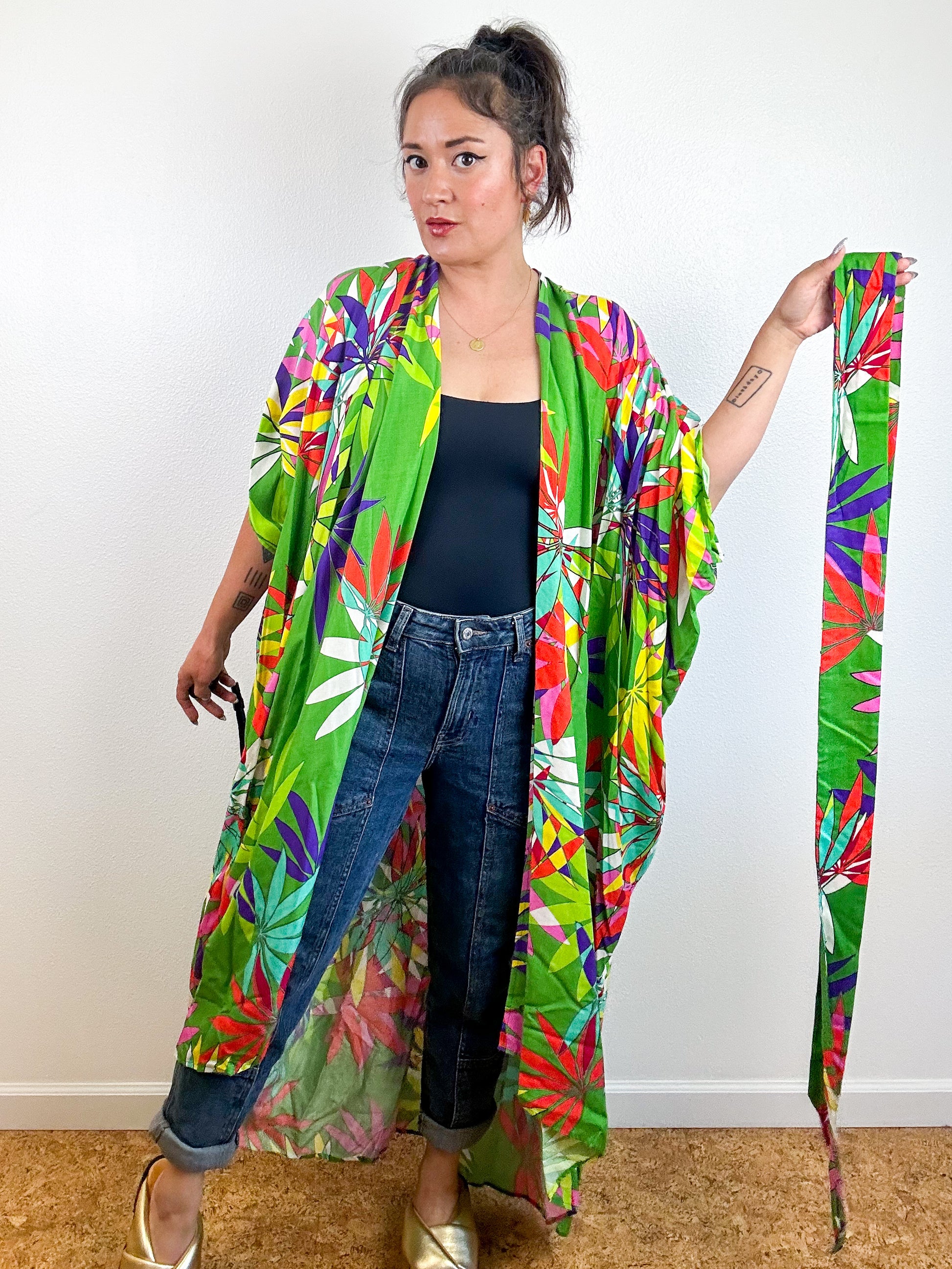Light and airy kimono with a flowing silhouette, selvage sleeve detail, curved high low hem and optional waist tie. Versatile shape can be styled as a wrap dress, lightweight jacket over jeans, swimsuit coverup, or an elegant robe over lingerie. The minimalist design created from a full rectangle of fabric drapes beautifully over the shoulders and produces little to no material waste by utilizing one whole piece of fabric without scraps from corners and irregular cuts. Lime and multicolor tropical print rayon challis fabric with a silky smooth surface.