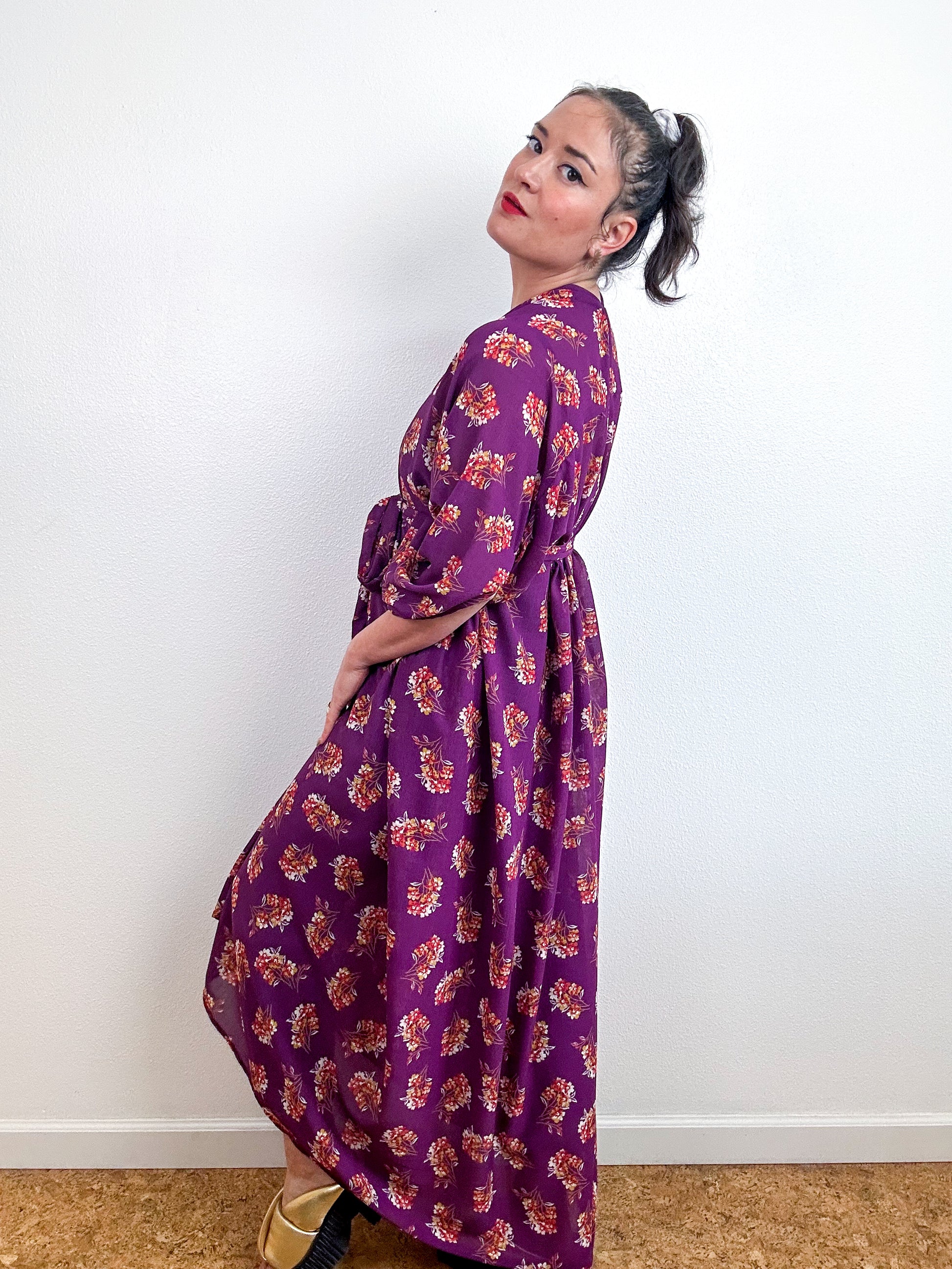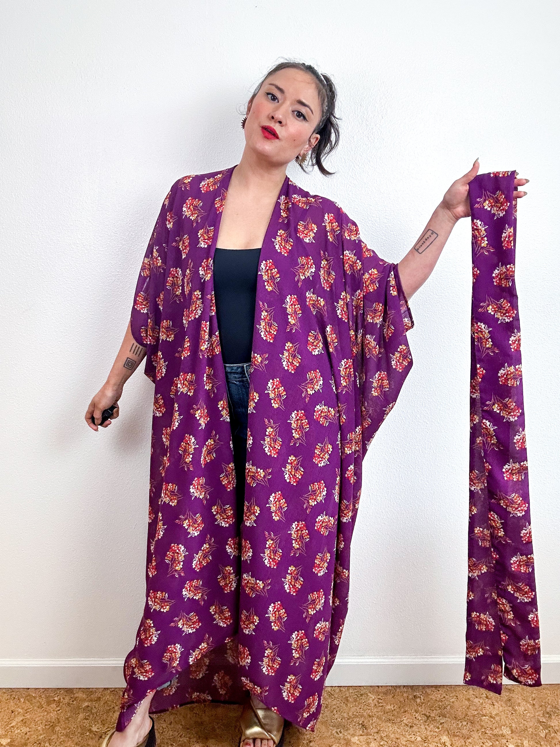 Light and airy kimono with a flowing silhouette, selvage sleeve detail, curved high low hem and optional waist tie. Versatile shape can be styled as a wrap dress, lightweight open layer, swimsuit coverup, or an elegant robe over lingerie. The minimalist design created from a full rectangle of fabric drapes beautifully over the shoulders and produces little to no material waste by utilizing one whole piece of fabric without scraps from corners and irregular cuts. Magenta mini floral print chiffon fabric with a gorgeous sheer drape and light crepe texture .