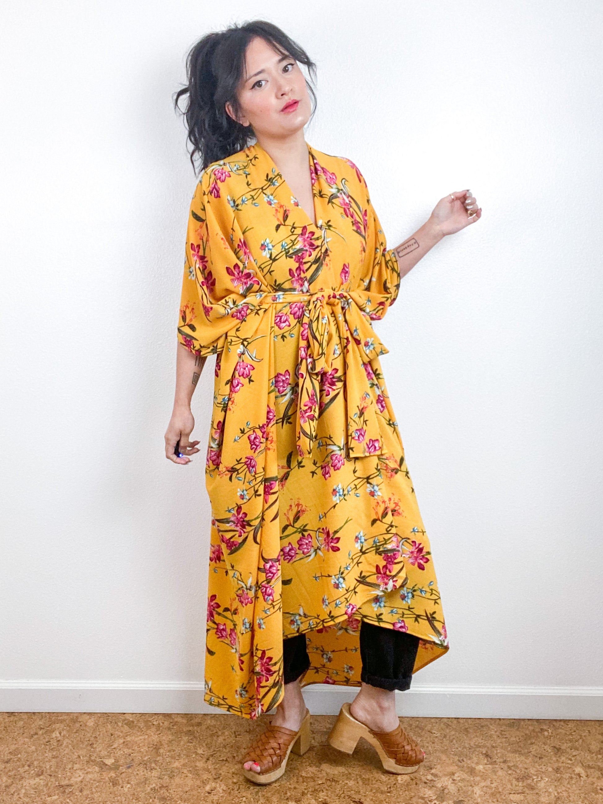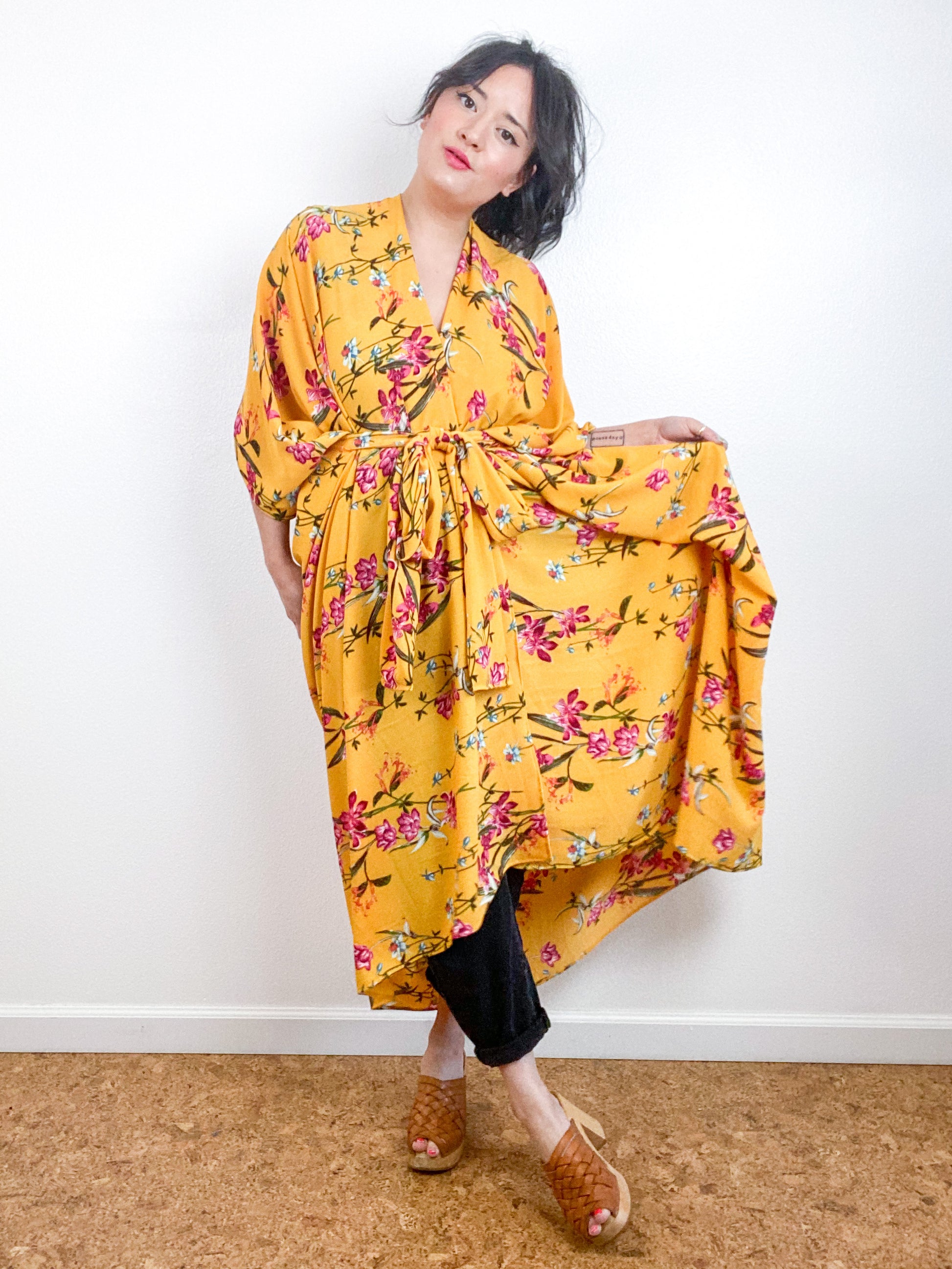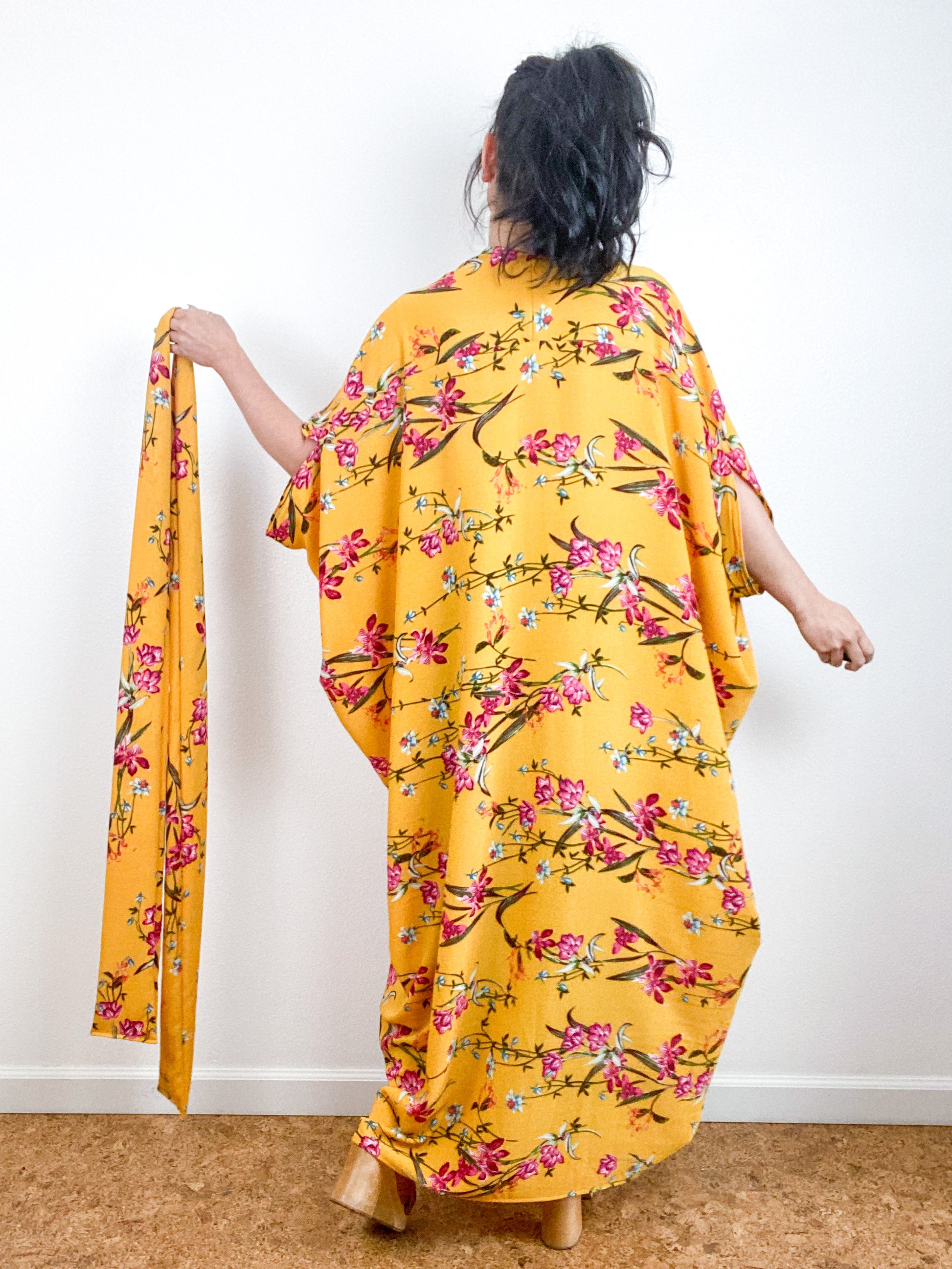 Light and airy kimono with a flowing silhouette, selvage sleeve detail, curved high low hem and optional waist tie. Versatile shape can be styled as a wrap dress, lightweight jacket over jeans, swimsuit coverup, or an elegant robe over lingerie. The minimalist design created from a full rectangle of fabric drapes beautifully over the shoulders and produces little to no material waste by utilizing one whole piece of fabric without scraps from corners and irregular cuts. Marigold and pink floral print bubble crepe fabric with a matte textured surface.
