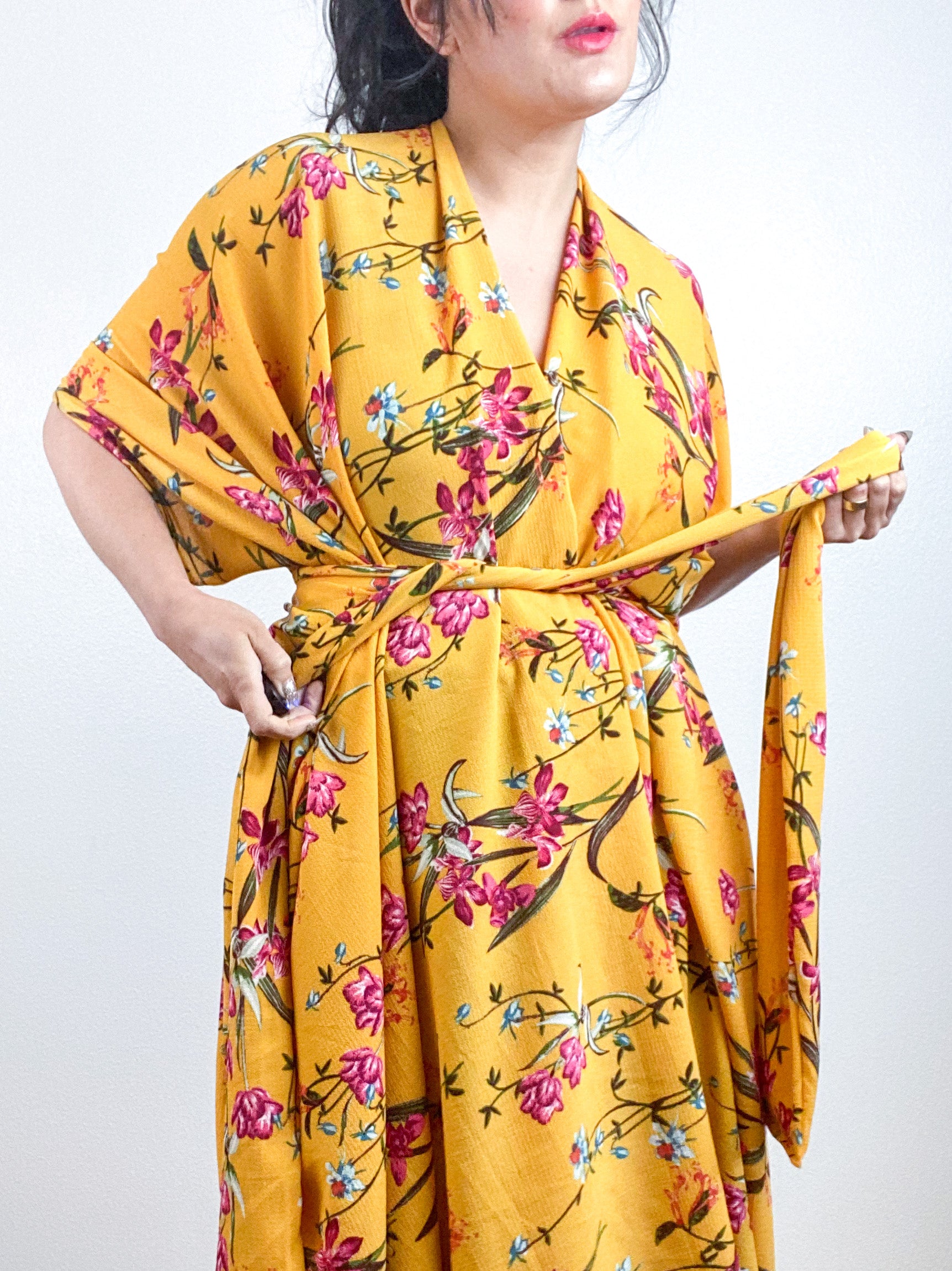 Print High Low Kimono Marigold Floral Bubble Crepe