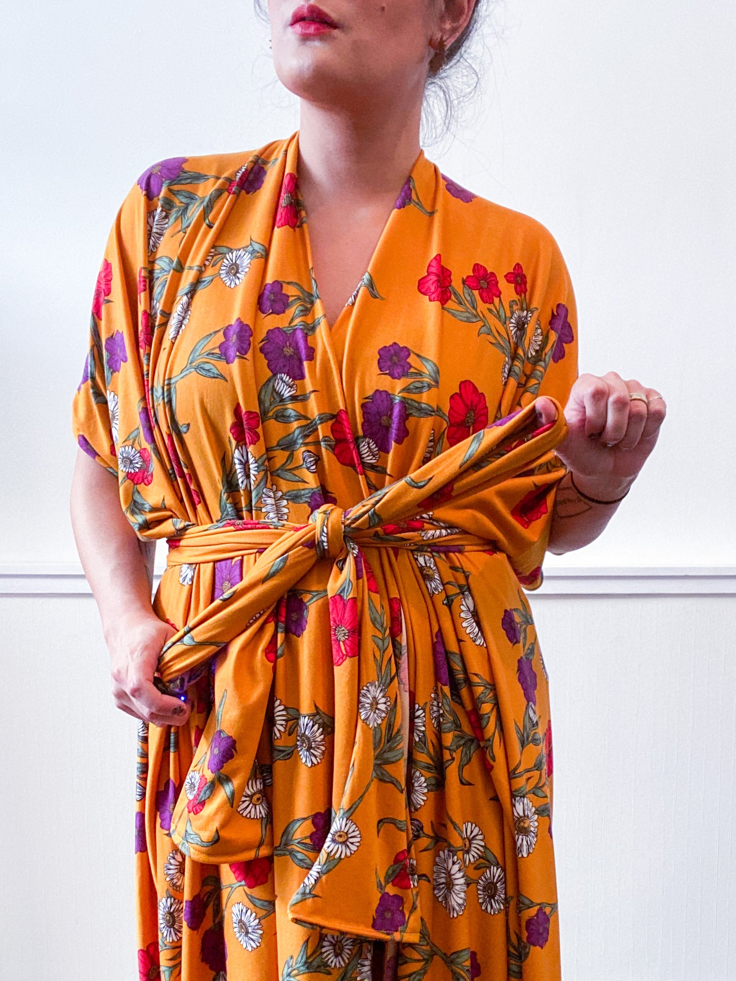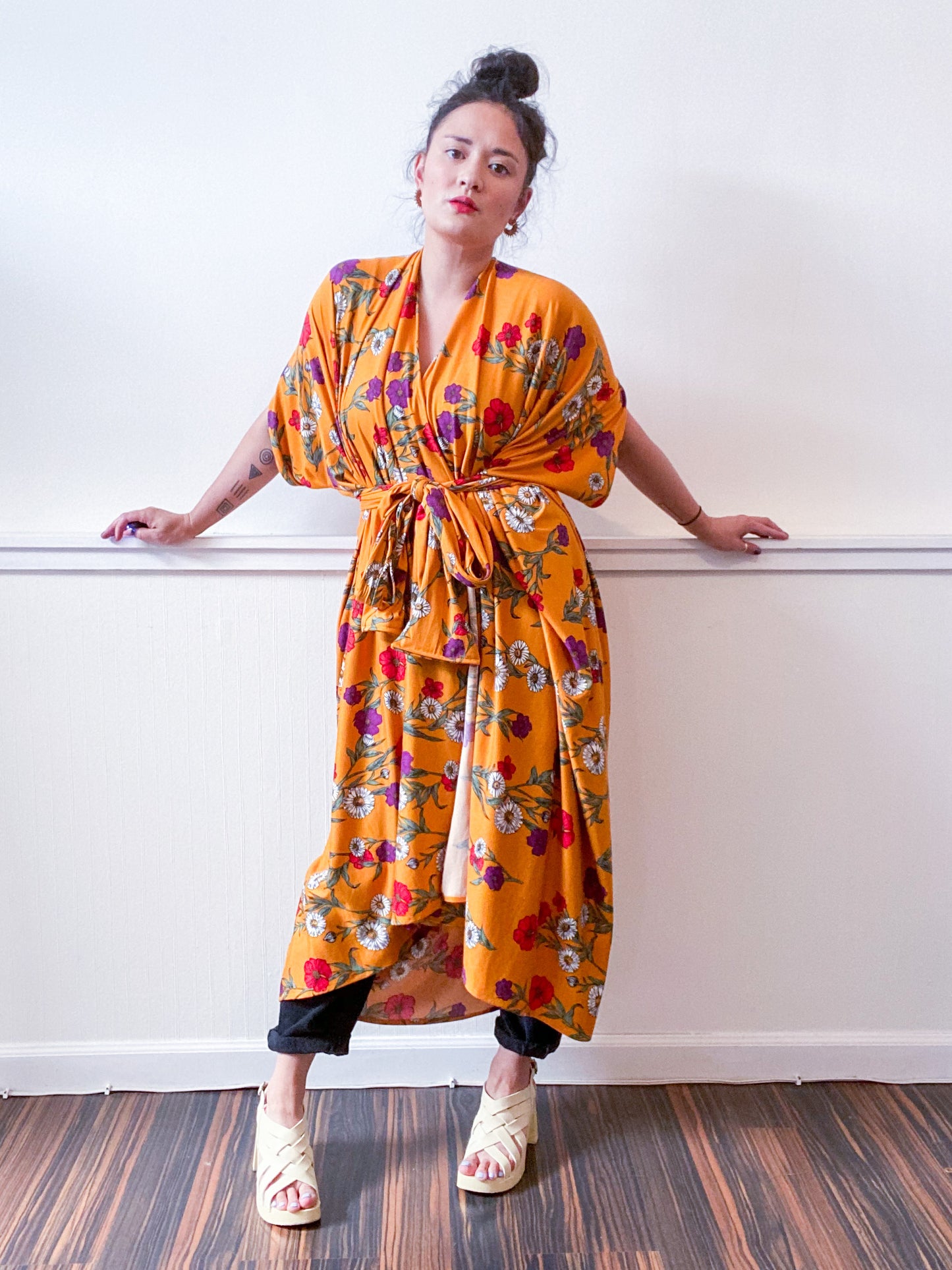Soft and cozy kimono with a drapey silhouette, selvage sleeve detail, curved high low hem and optional waist tie. Versatile shape can be styled as a wrap dress, lightweight jacket over jeans, swimsuit coverup, or an elegant robe over lingerie. The minimalist design created from a full rectangle of fabric drapes beautifully over the shoulders and produces little to no material waste by utilizing one whole piece of fabric without scraps from corners and irregular cuts. Goldenrod yellow mini floral print knit fabric with a soft double brushed texture and stretch for comfort.