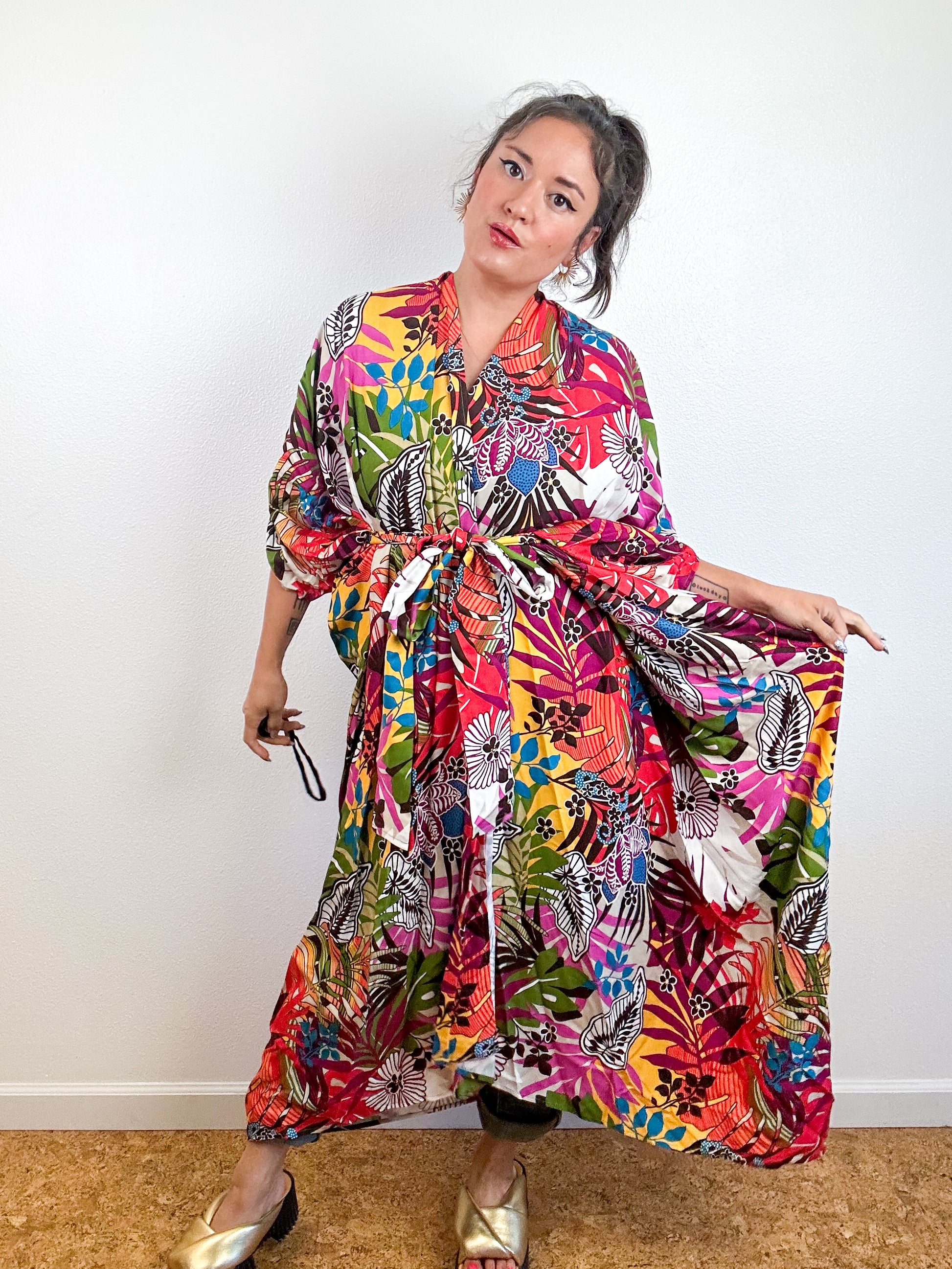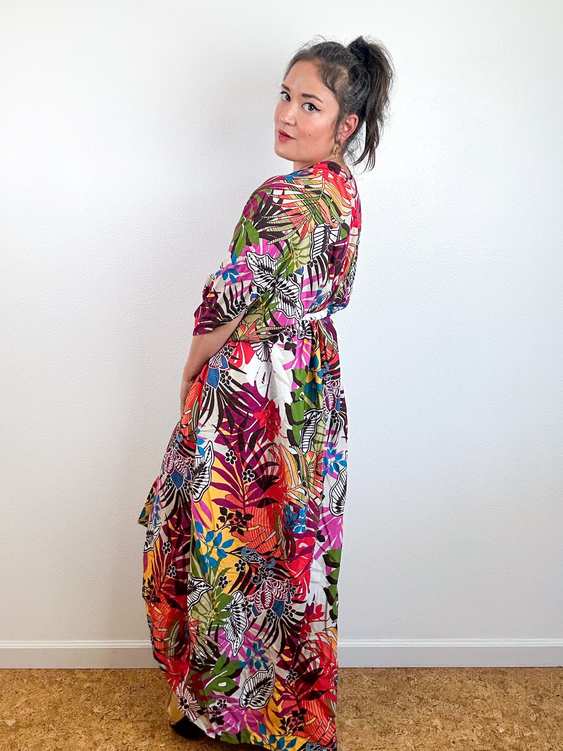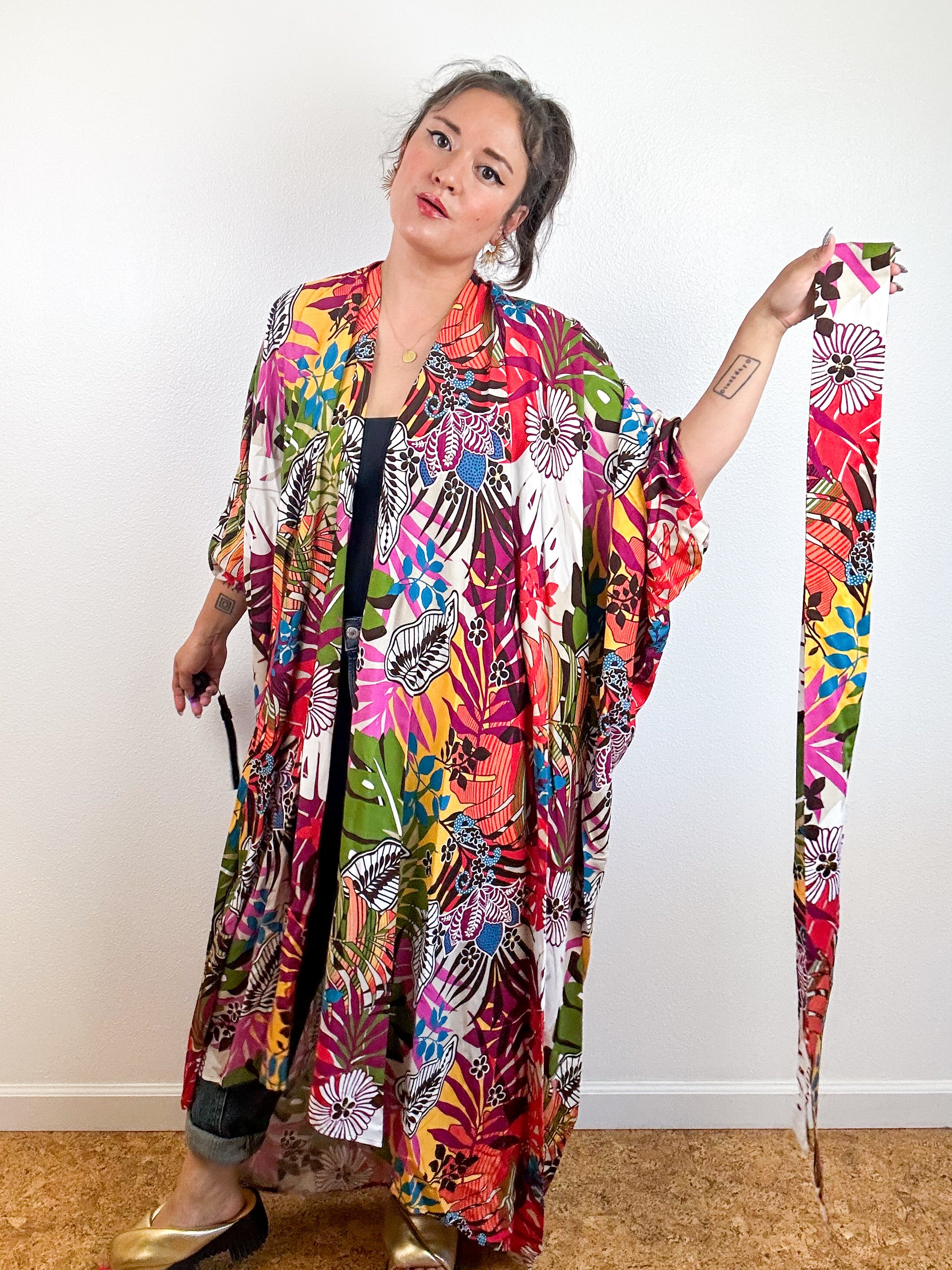 Light and airy kimono with a flowing silhouette, selvage sleeve detail, curved high low hem and optional waist tie. Versatile shape can be styled as a wrap dress, lightweight jacket over jeans, swimsuit coverup, or an elegant robe over lingerie. The minimalist design created from a full rectangle of fabric drapes beautifully over the shoulders and produces little to no material waste by utilizing one whole piece of fabric without scraps from corners and irregular cuts. Multicolor tropical print rayon challis fabric with a silky smooth surface.
