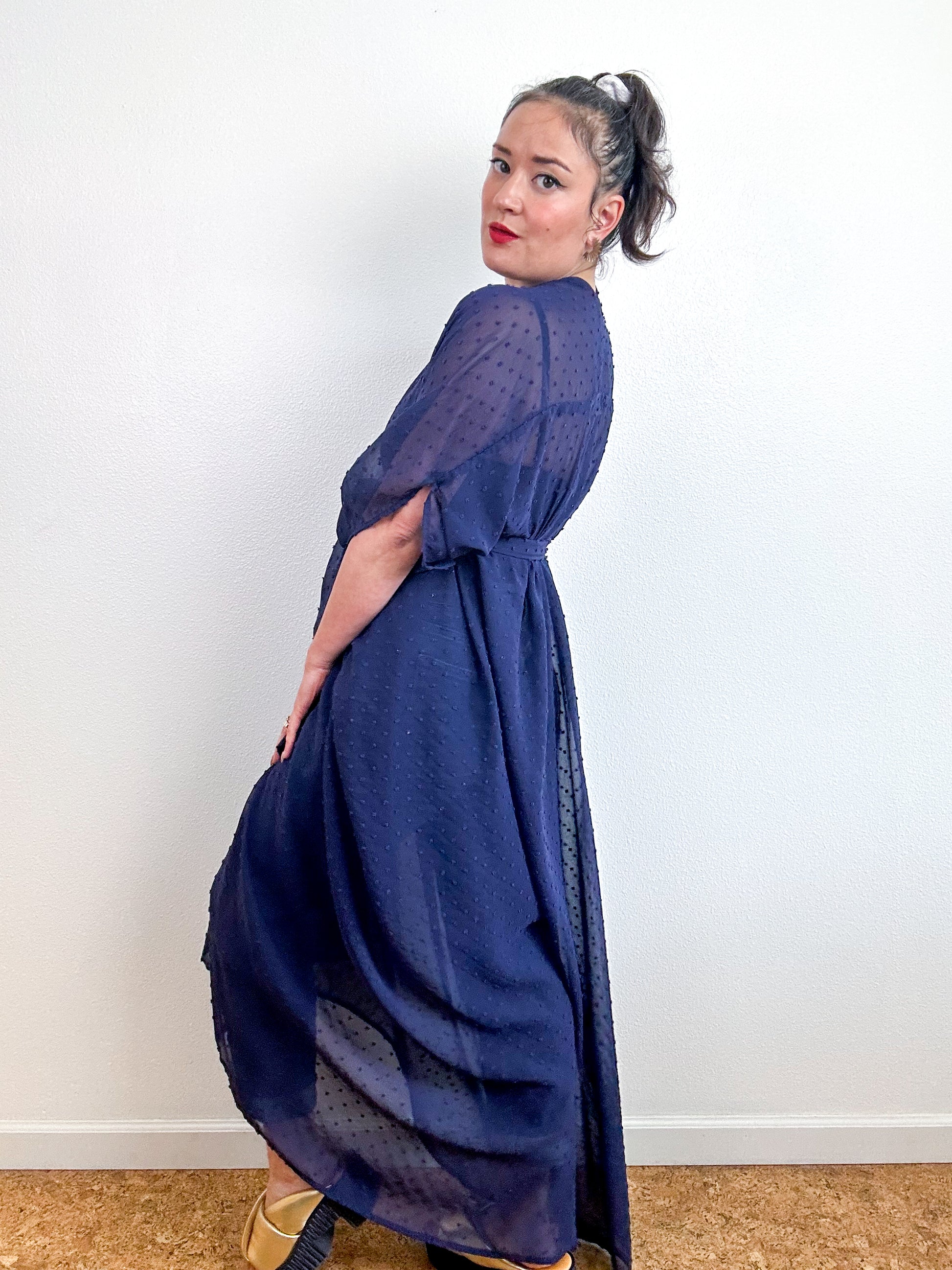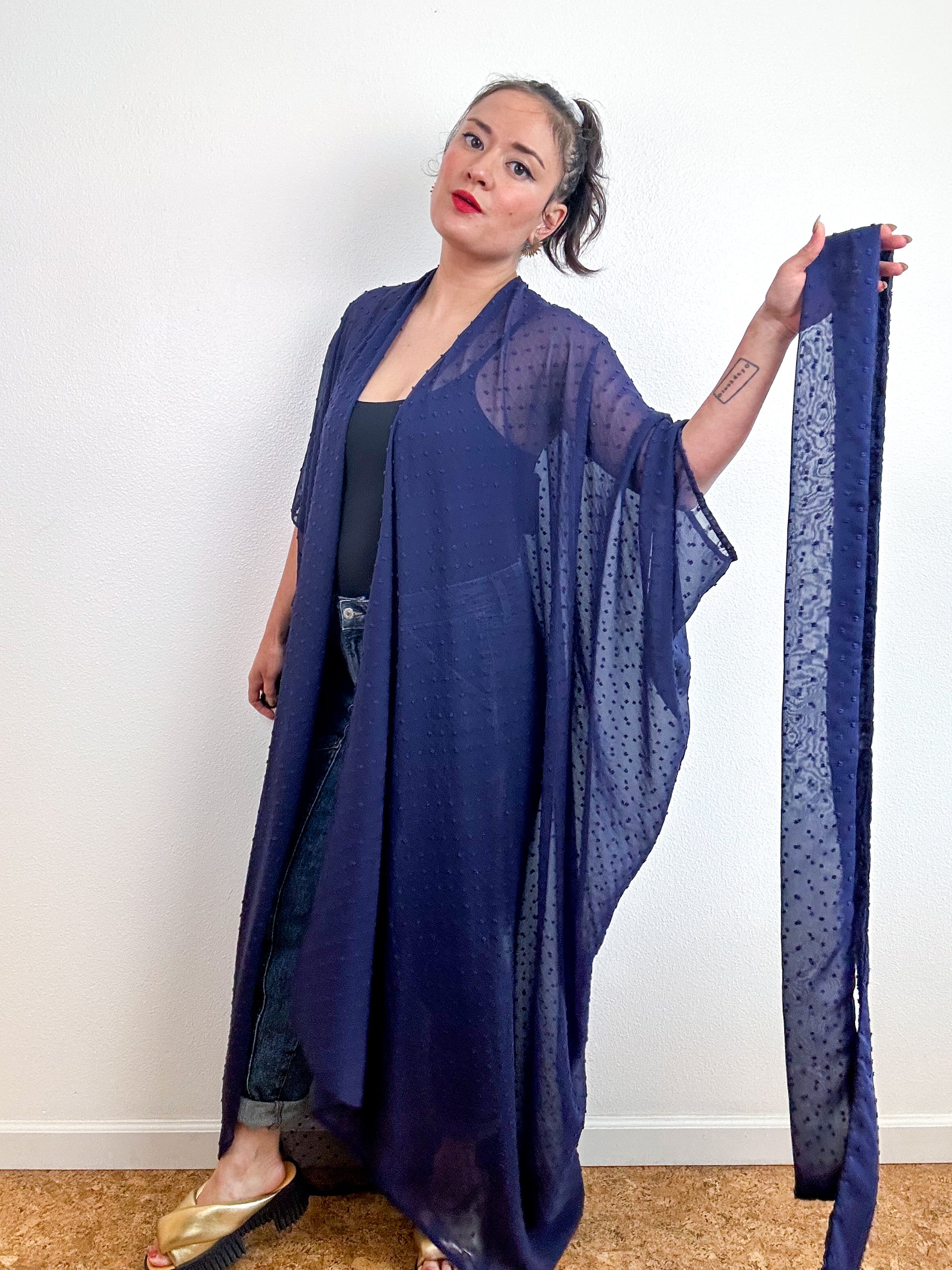 Light and airy kimono with a flowing silhouette, selvage sleeve detail, curved high low hem and optional waist tie. Versatile shape can be styled as a wrap dress, lightweight open layer, swimsuit coverup, or an elegant robe over lingerie. The minimalist design created from a full rectangle of fabric drapes beautifully over the shoulders and produces little to no material waste by utilizing one whole piece of fabric without scraps from corners and irregular cuts. Navy blue Swiss dot chiffon fabric with a gorgeous sheer drape.