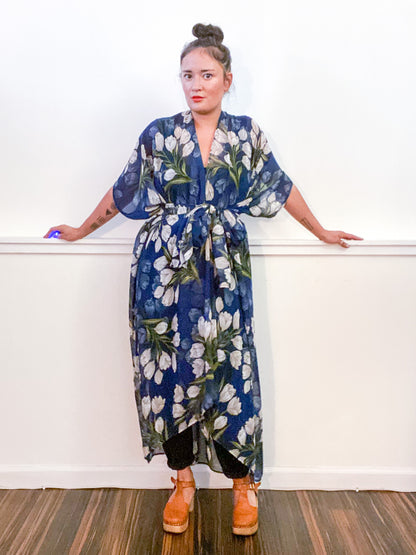 Print High Low Kimono Navy Tulips Chiffon