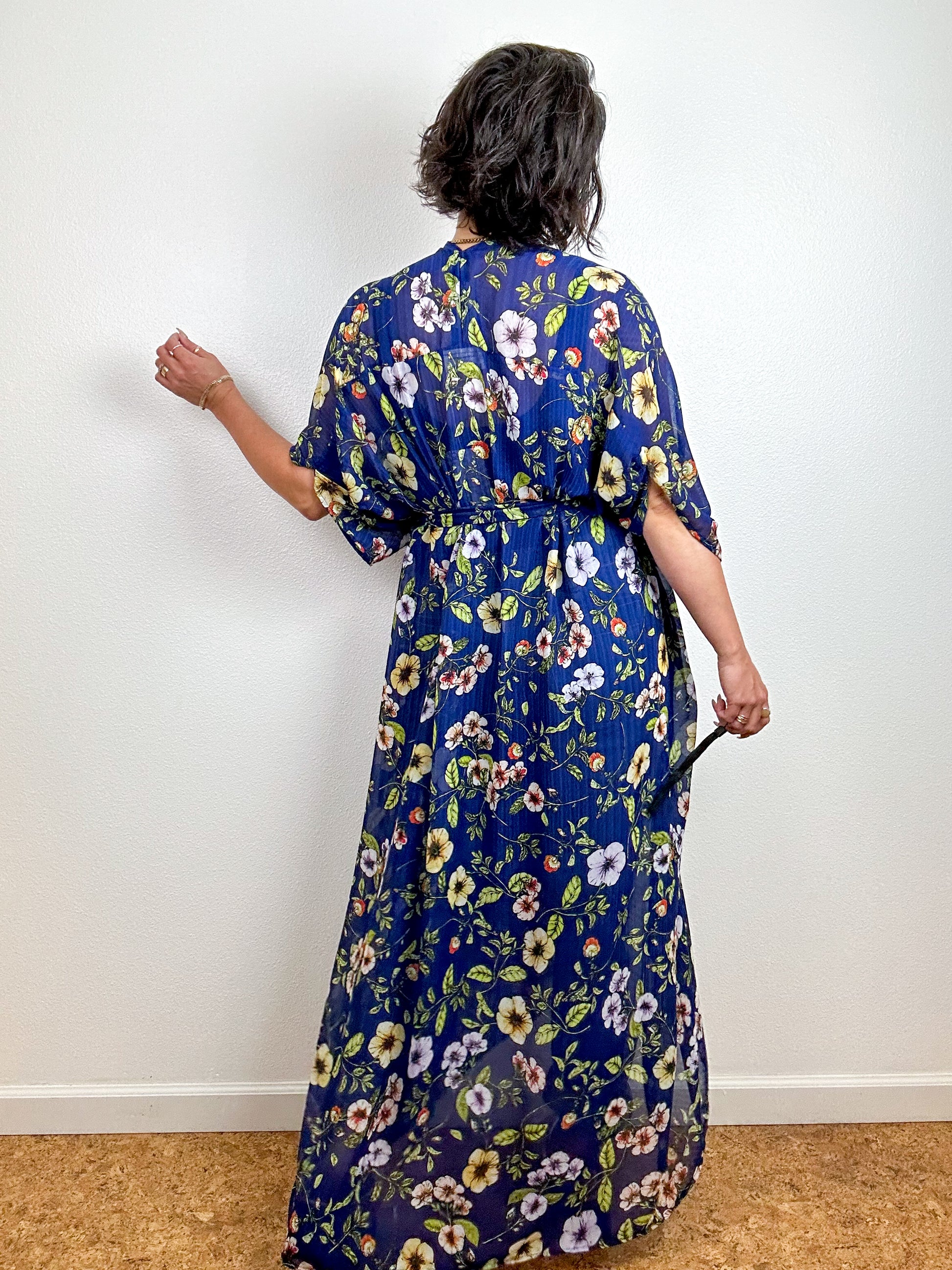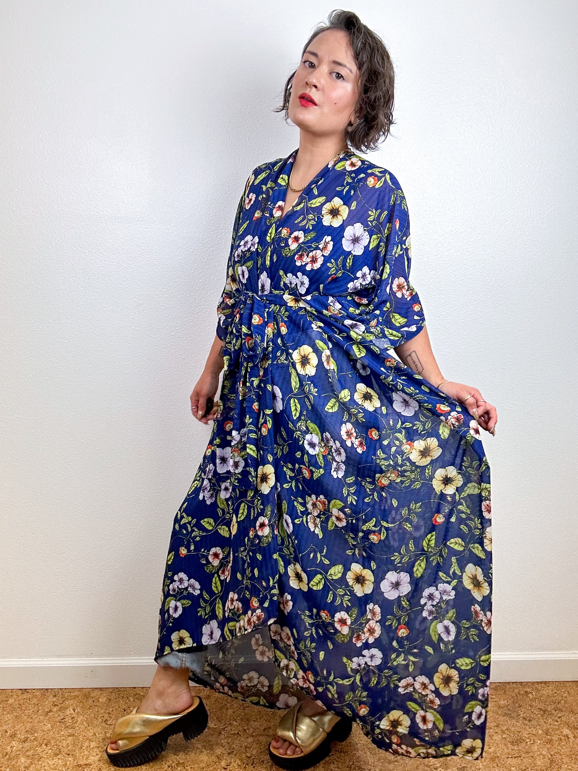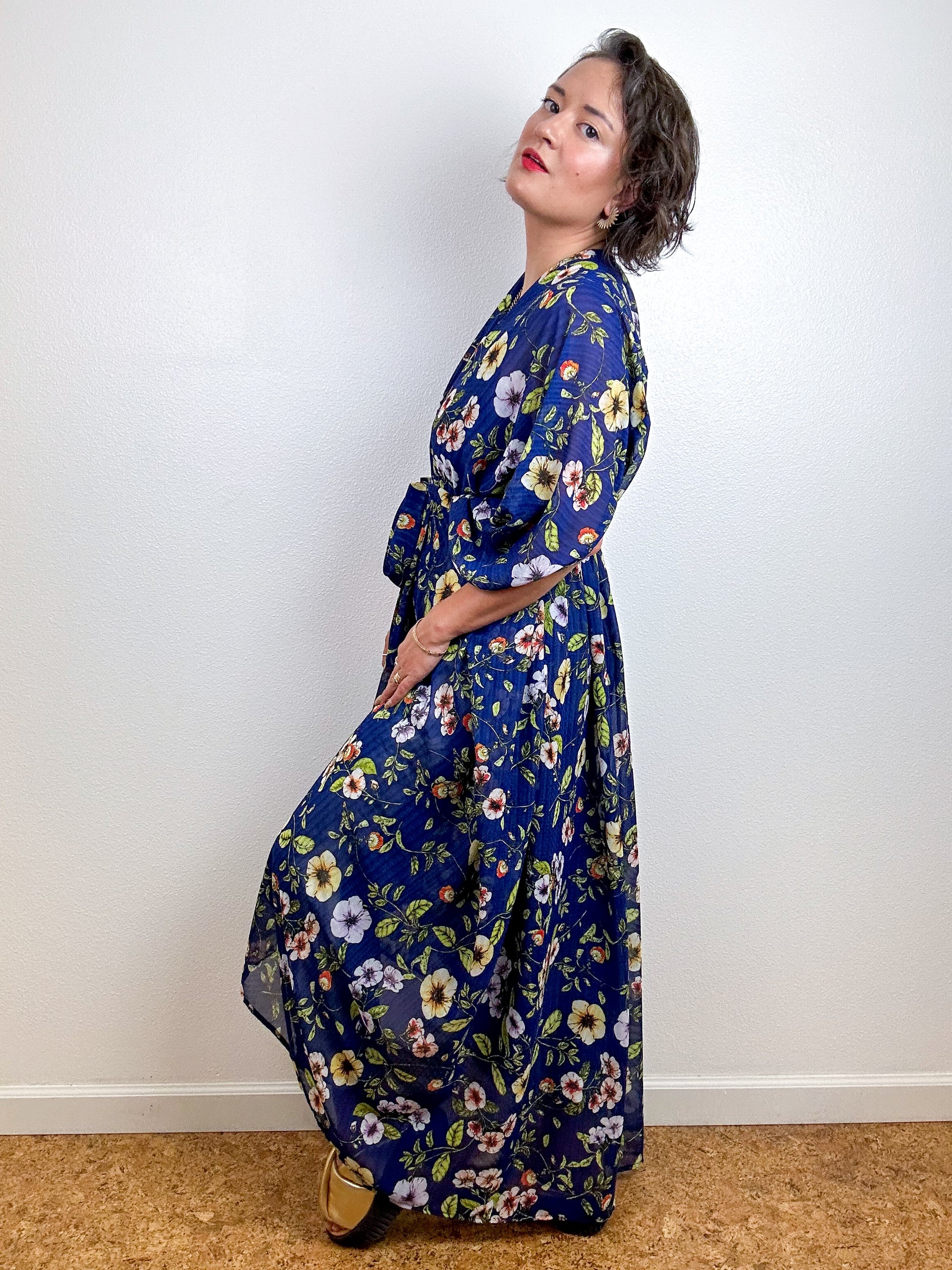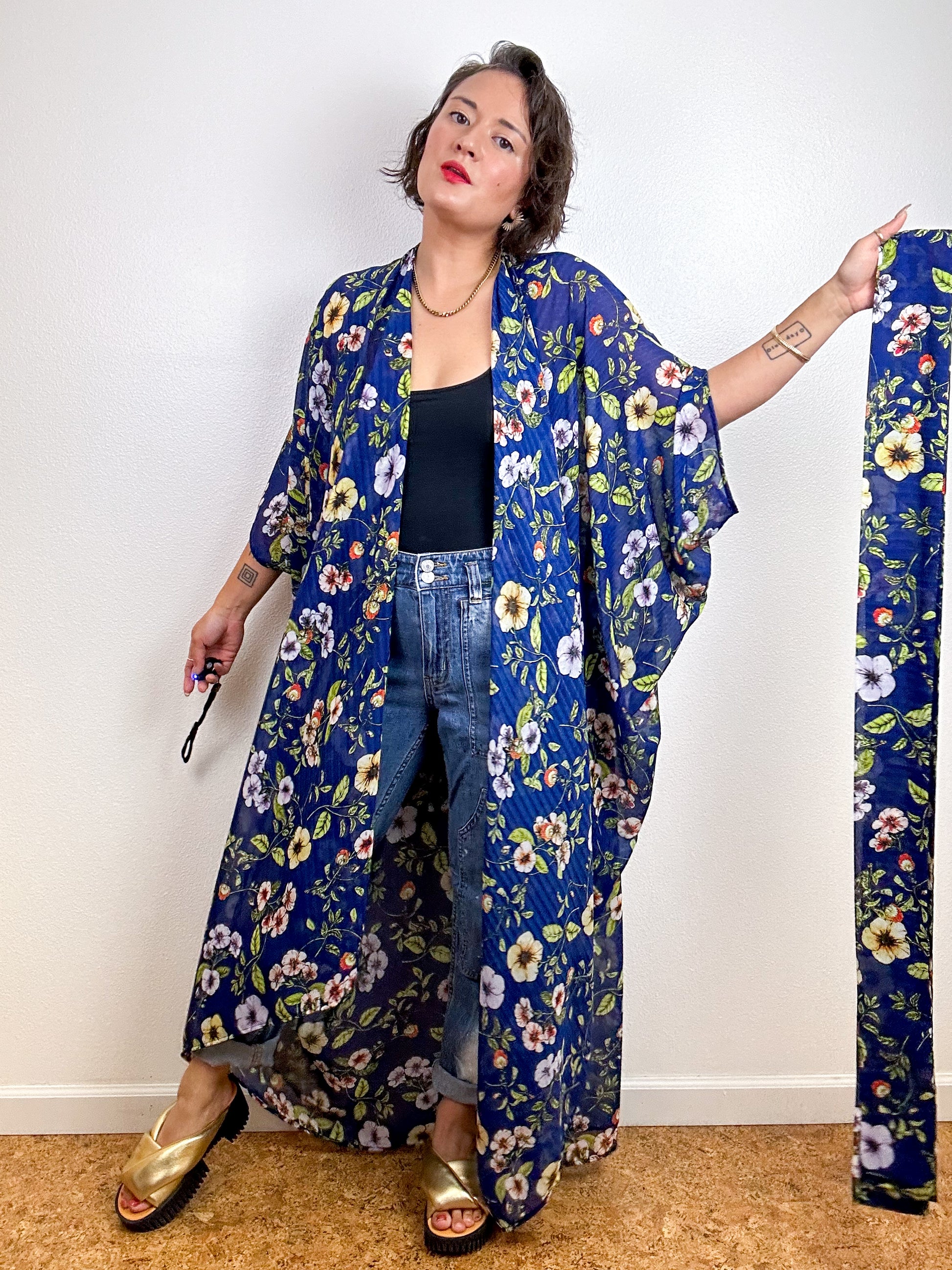 Light and airy kimono with a flowing silhouette, selvage sleeve detail, curved high low hem and optional waist tie. Versatile shape can be styled as a wrap dress, lightweight open layer, swimsuit coverup, or an elegant robe over lingerie. The minimalist design created from a full rectangle of fabric drapes beautifully over the shoulders and produces little to no material waste by utilizing one whole piece of fabric without scraps from corners and irregular cuts. Navy wildflower print chiffon fabric with a gorgeous sheer drape and subtle patterned surface texture.