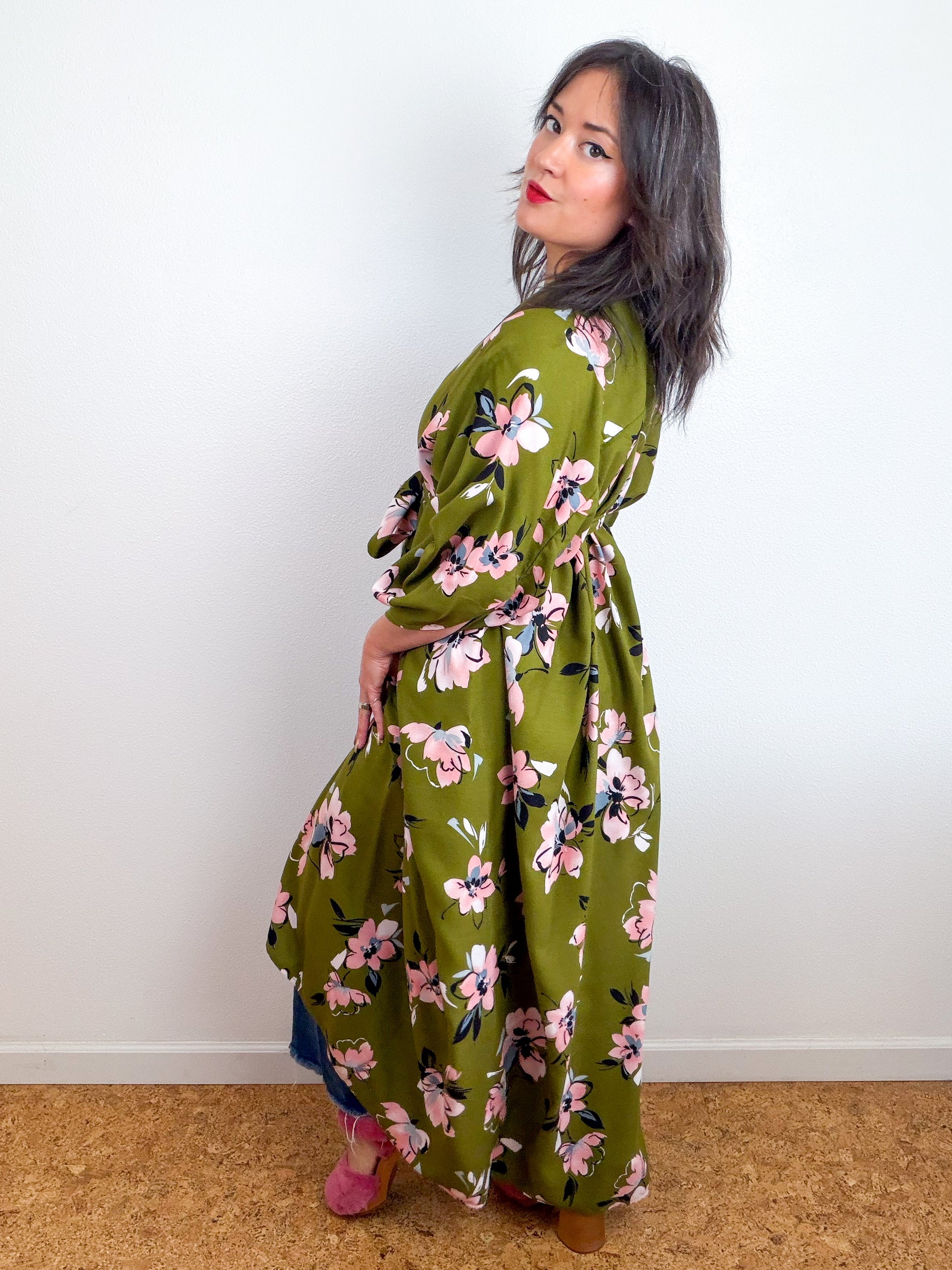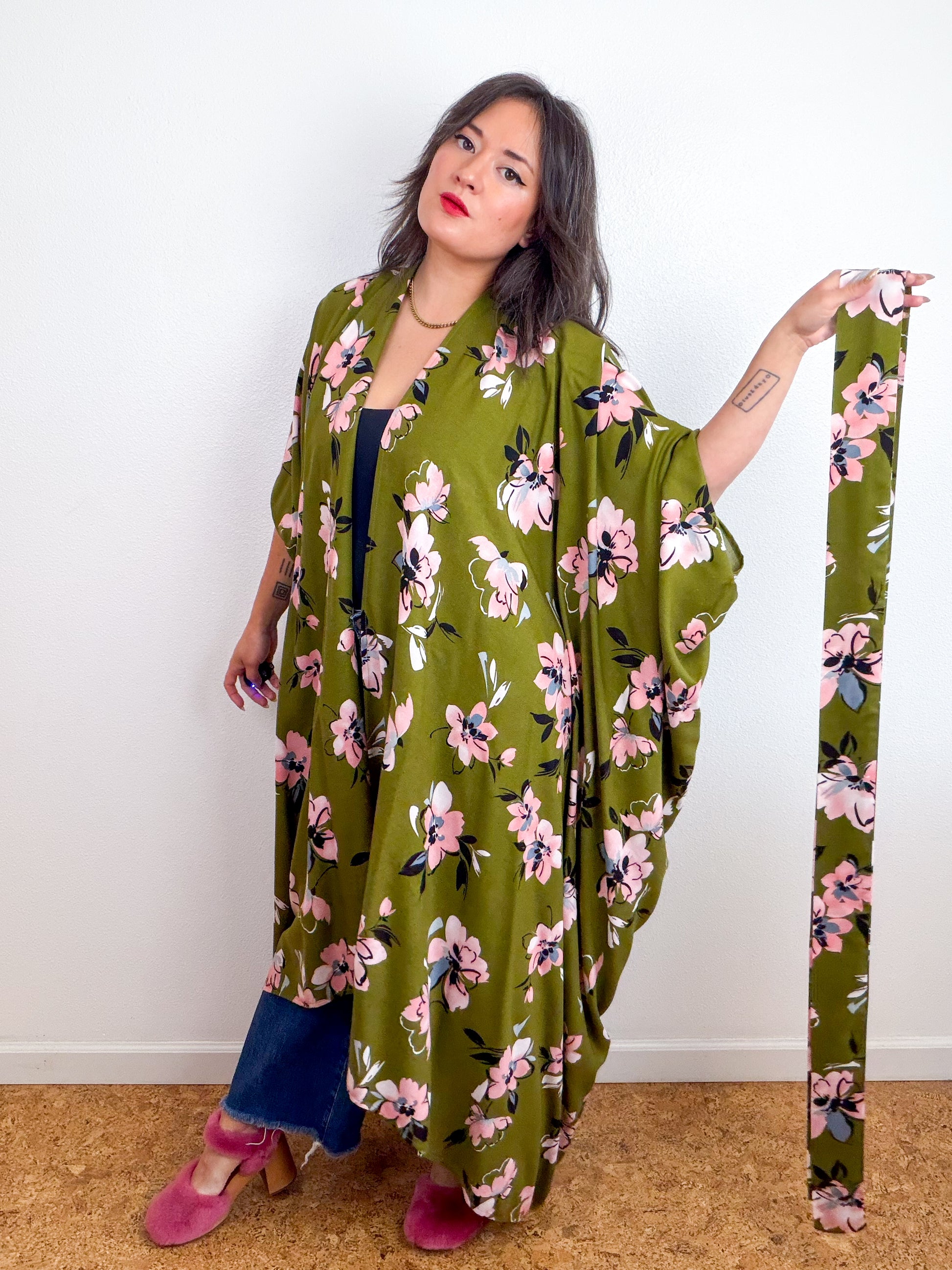 Light and airy kimono with a flowing silhouette, selvage sleeve detail, curved high low hem and optional waist tie. Versatile shape can be styled as a wrap dress, lightweight jacket over jeans, swimsuit coverup, or an elegant robe over lingerie. The minimalist design created from a full rectangle of fabric drapes beautifully over the shoulders and produces little to no material waste by utilizing one whole piece of fabric without scraps from corners and irregular cuts. Olive green floral print rayon challis fabric with a silky smooth surface.