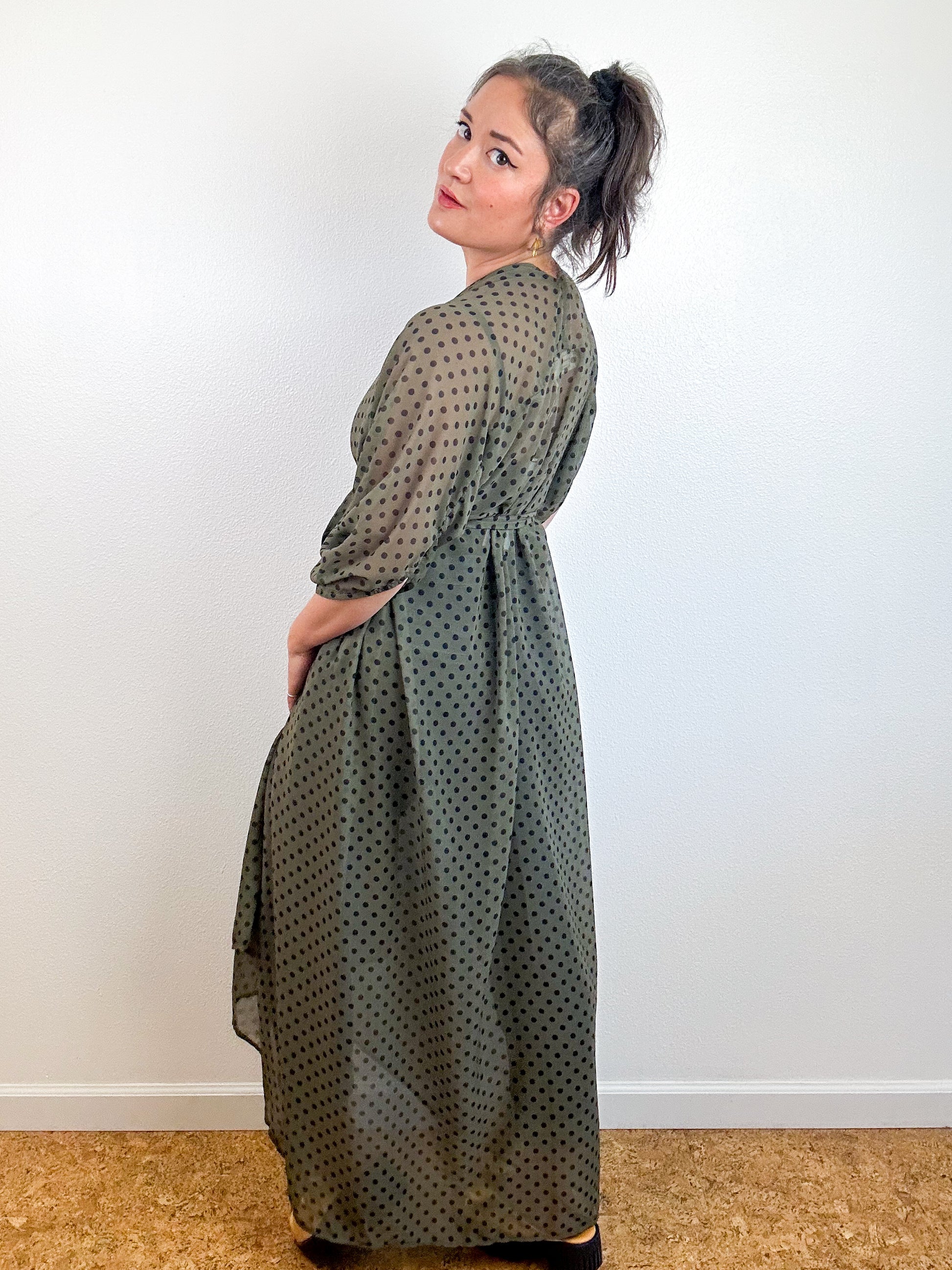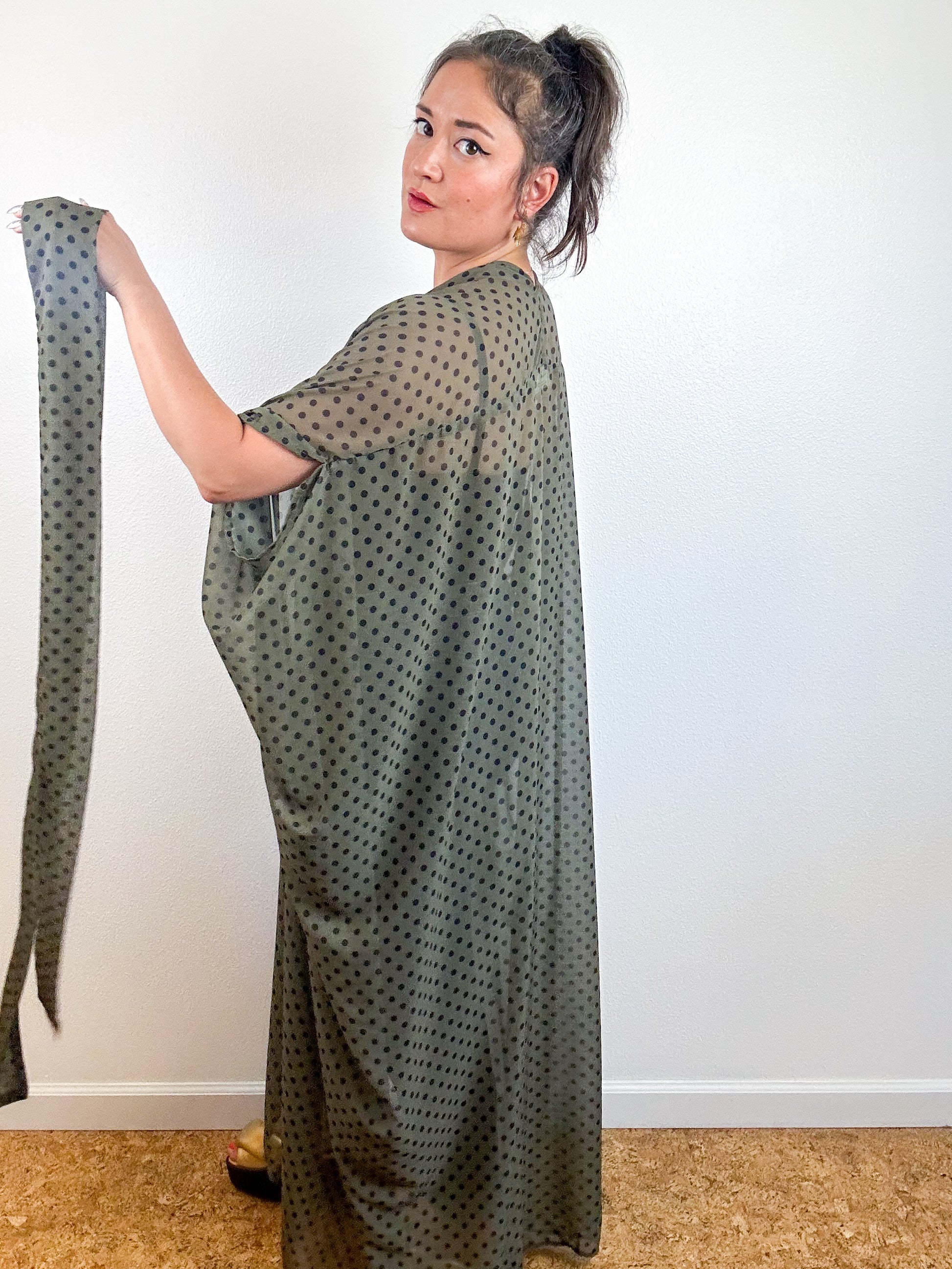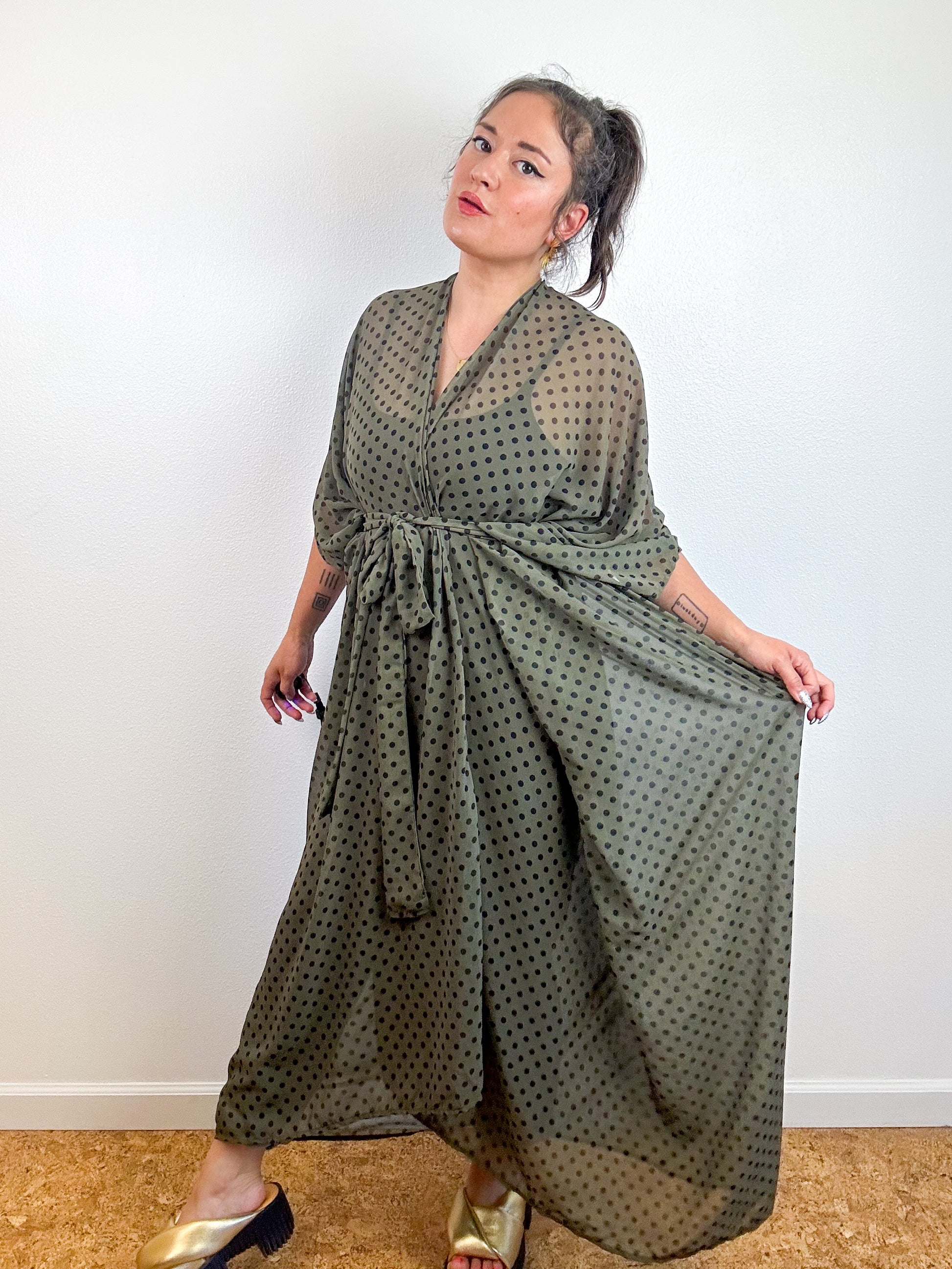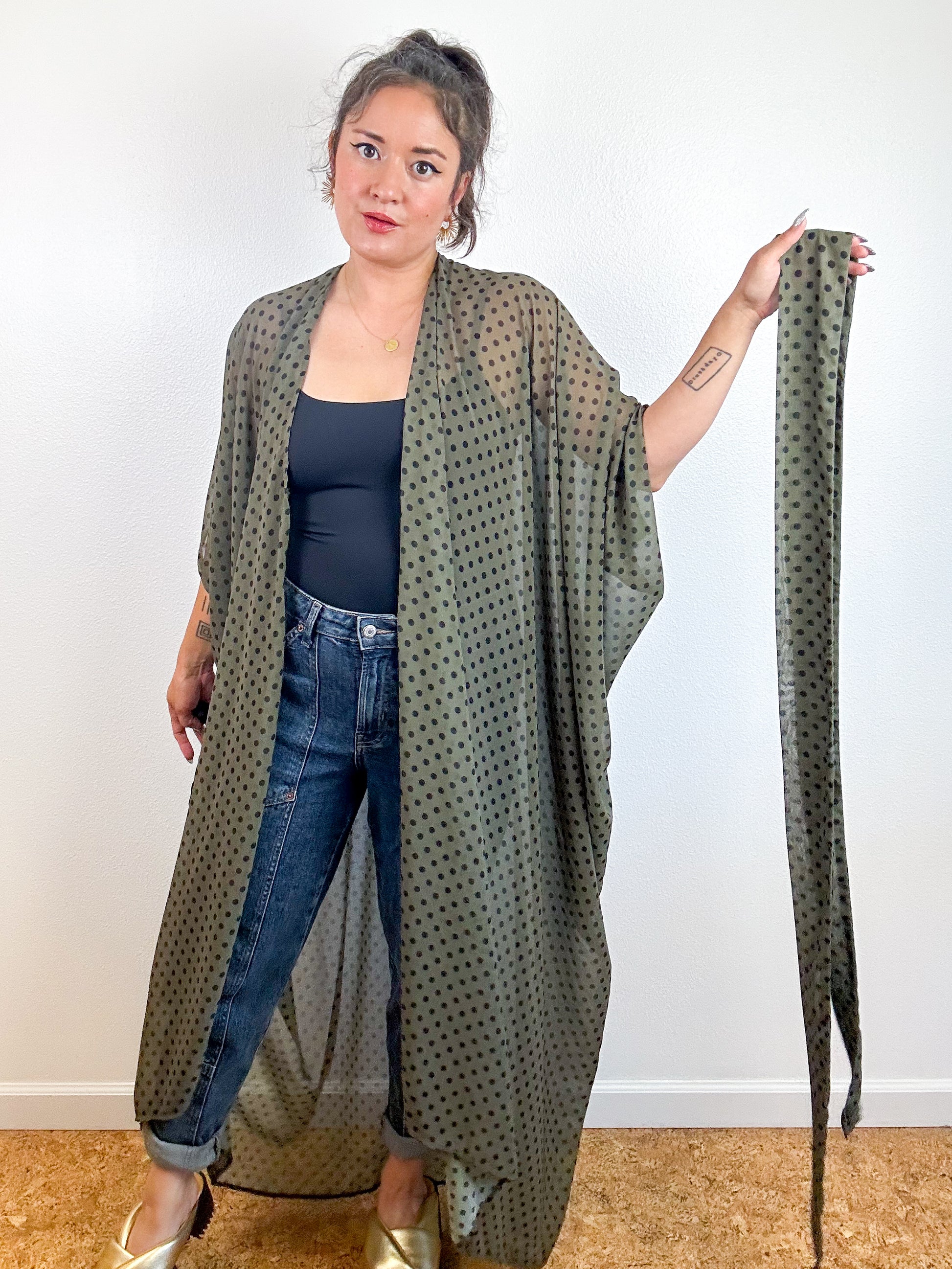 Light and airy kimono with a flowing silhouette, tulip sleeve detail, curved high low hem and optional waist tie. Versatile shape can be styled as a wrap dress, lightweight open layer, swimsuit coverup, or an elegant robe over lingerie. The minimalist design created from a full rectangle of fabric drapes beautifully over the shoulders and produces little to no material waste by utilizing one whole piece of fabric without scraps from corners and irregular cuts. Olive green black polka dot chiffon fabric with a sheer, silky finish.