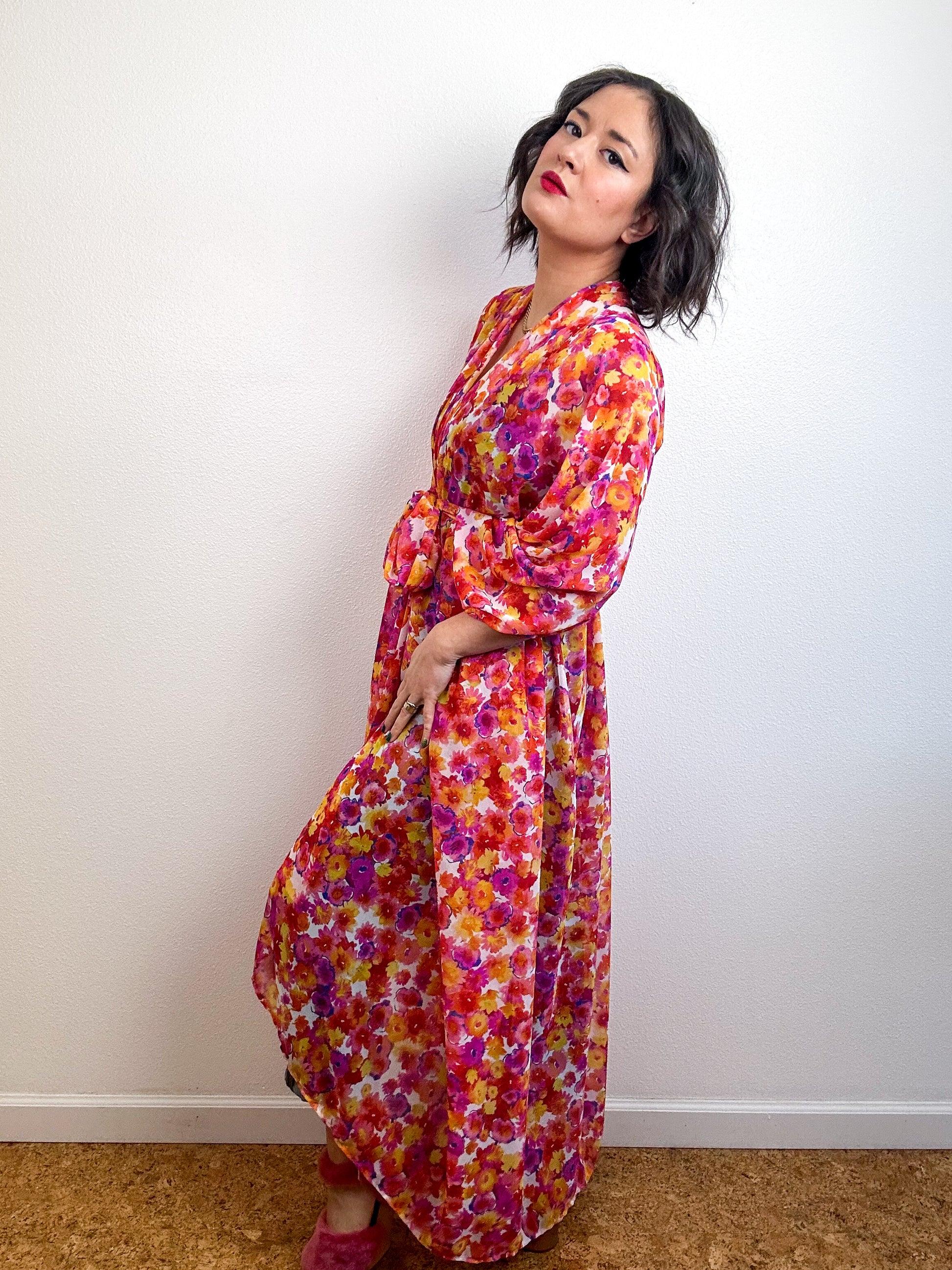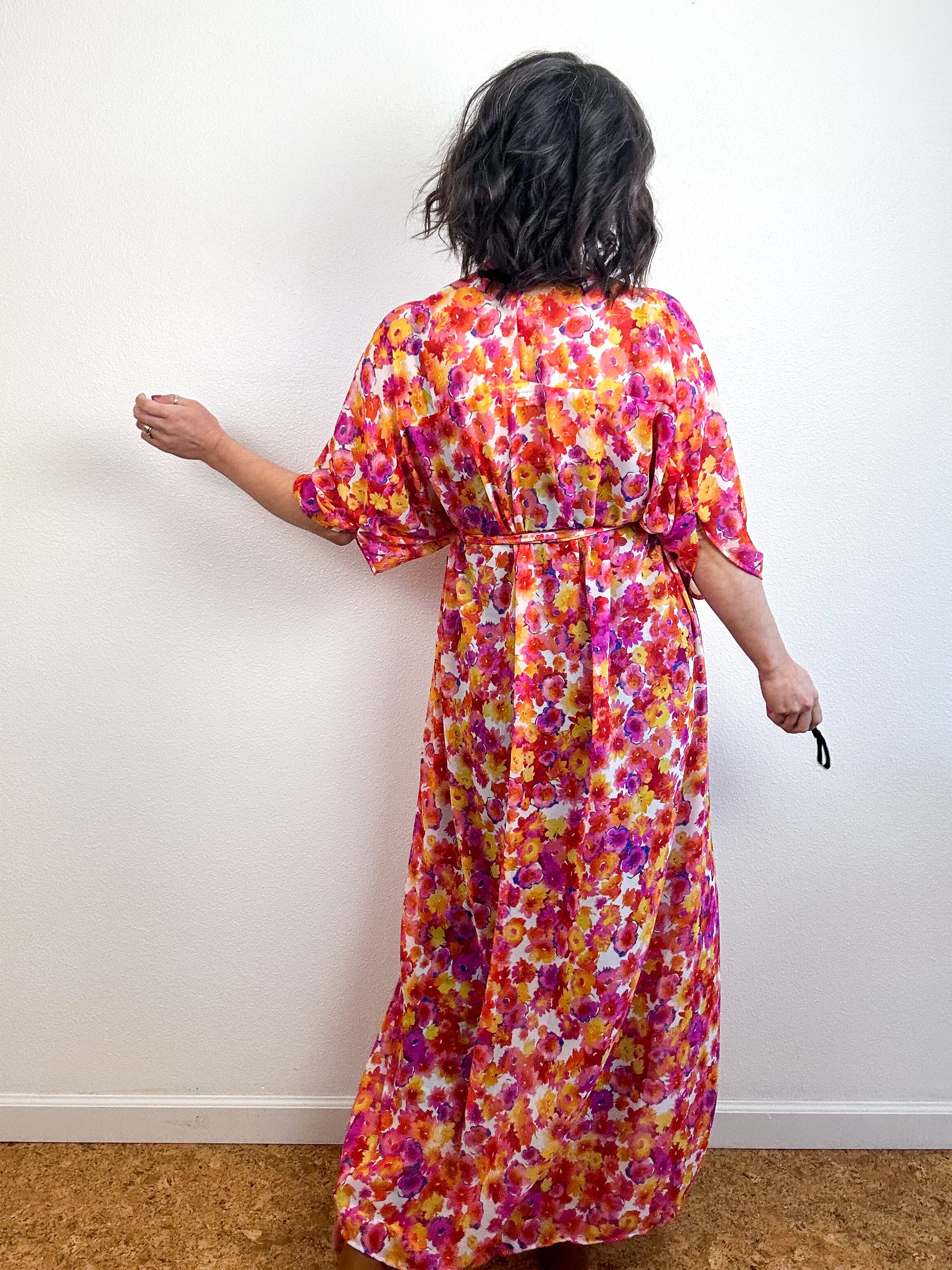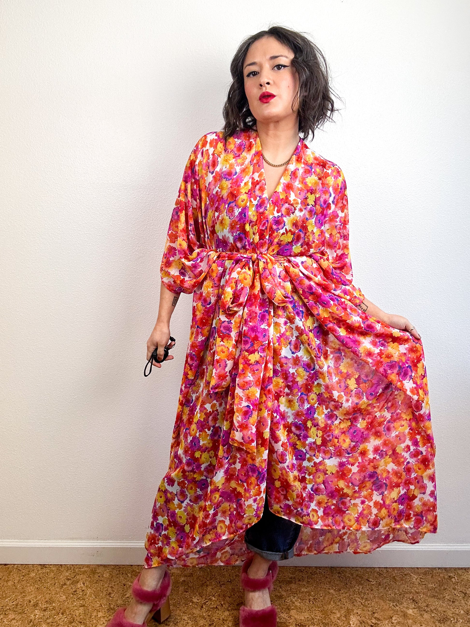 Light and airy kimono with a flowing silhouette, selvage sleeve detail, curved high low hem and optional waist tie. Versatile shape can be styled as a wrap dress, lightweight open layer, swimsuit coverup, or an elegant robe over lingerie. The minimalist design created from a full rectangle of fabric drapes beautifully over the shoulders and produces little to no material waste by utilizing one whole piece of fabric without scraps from corners and irregular cuts. Orange pink floral print chiffon fabric with a gorgeous sheer drape and light crepe texture.