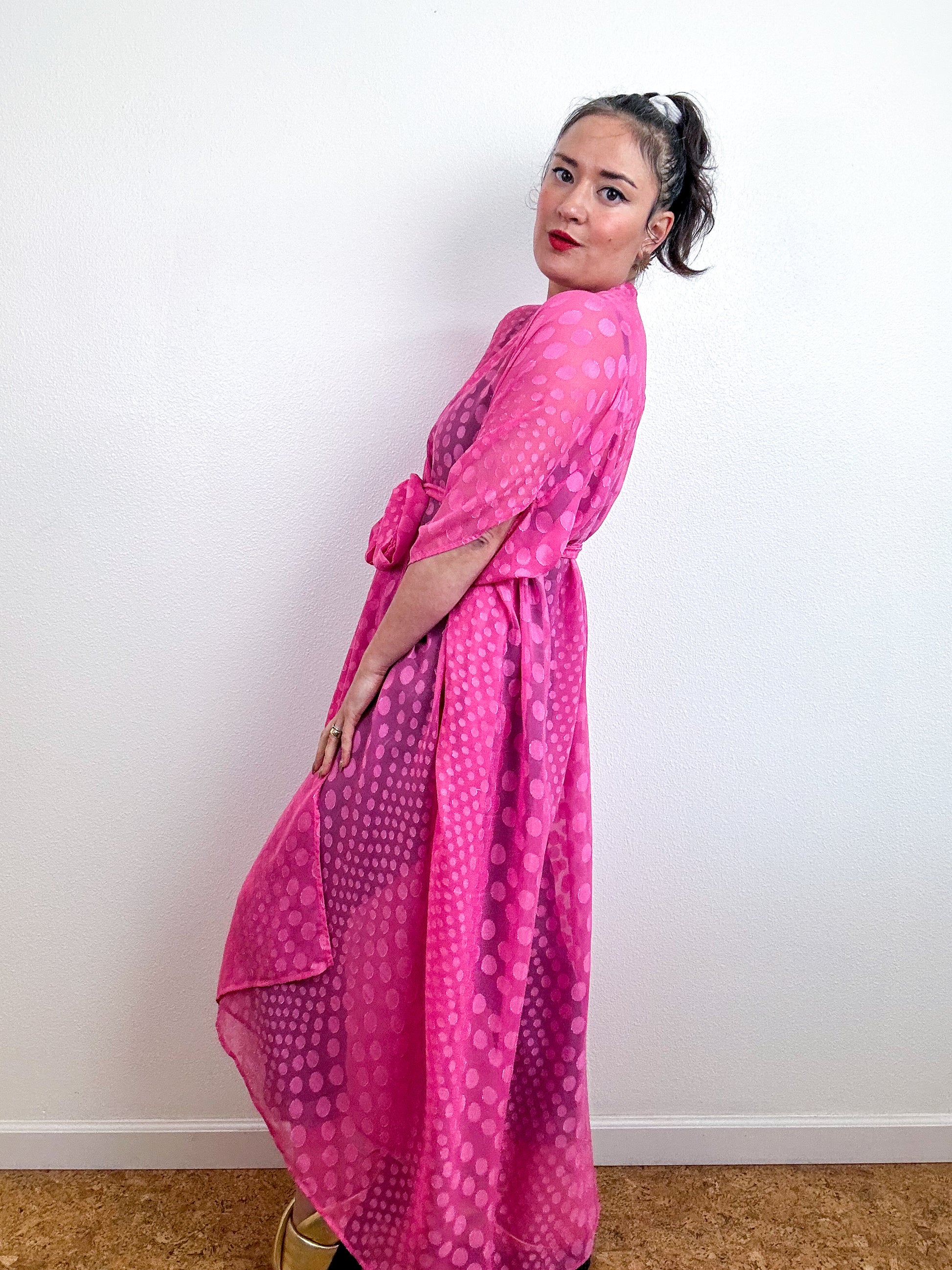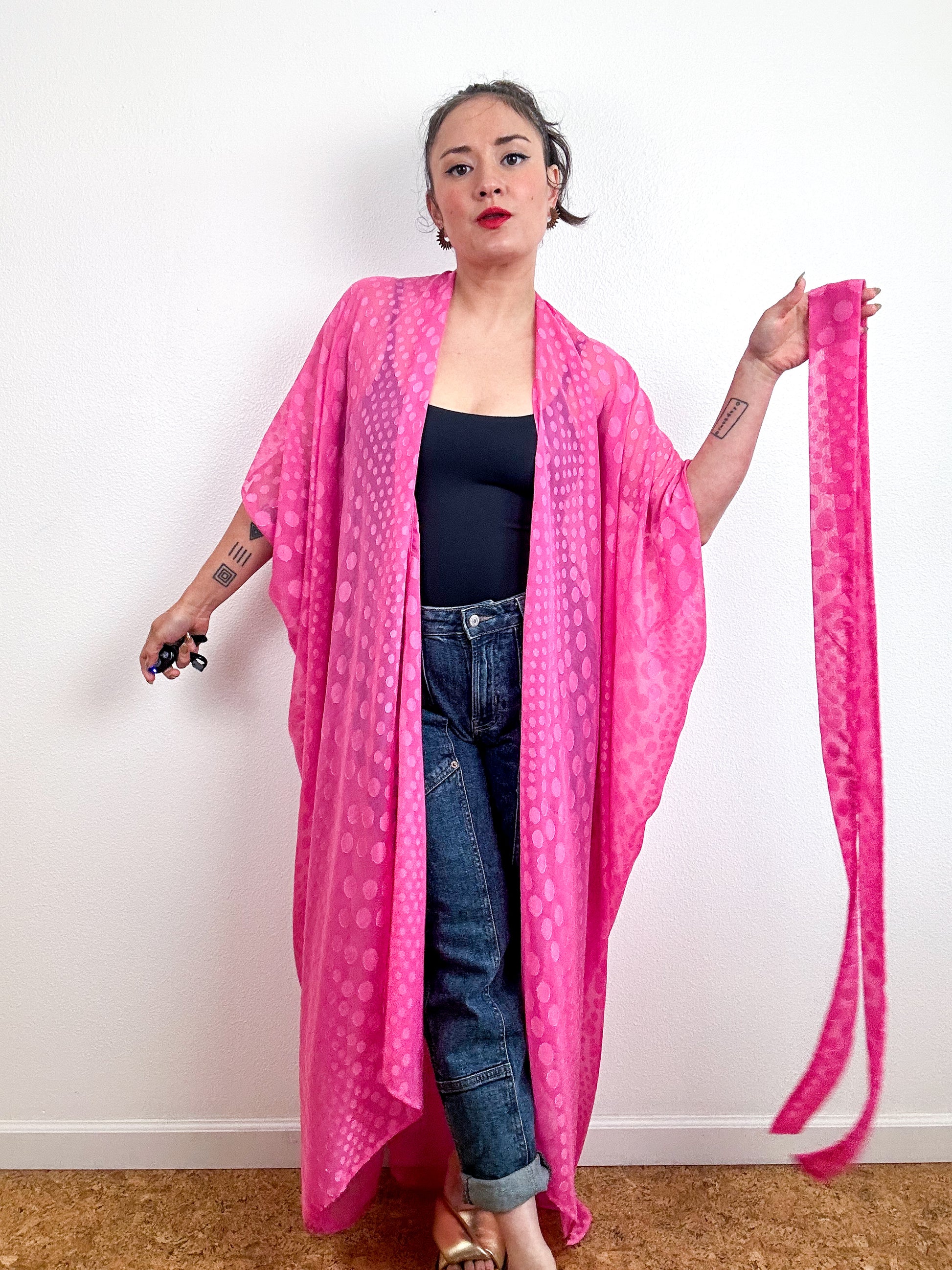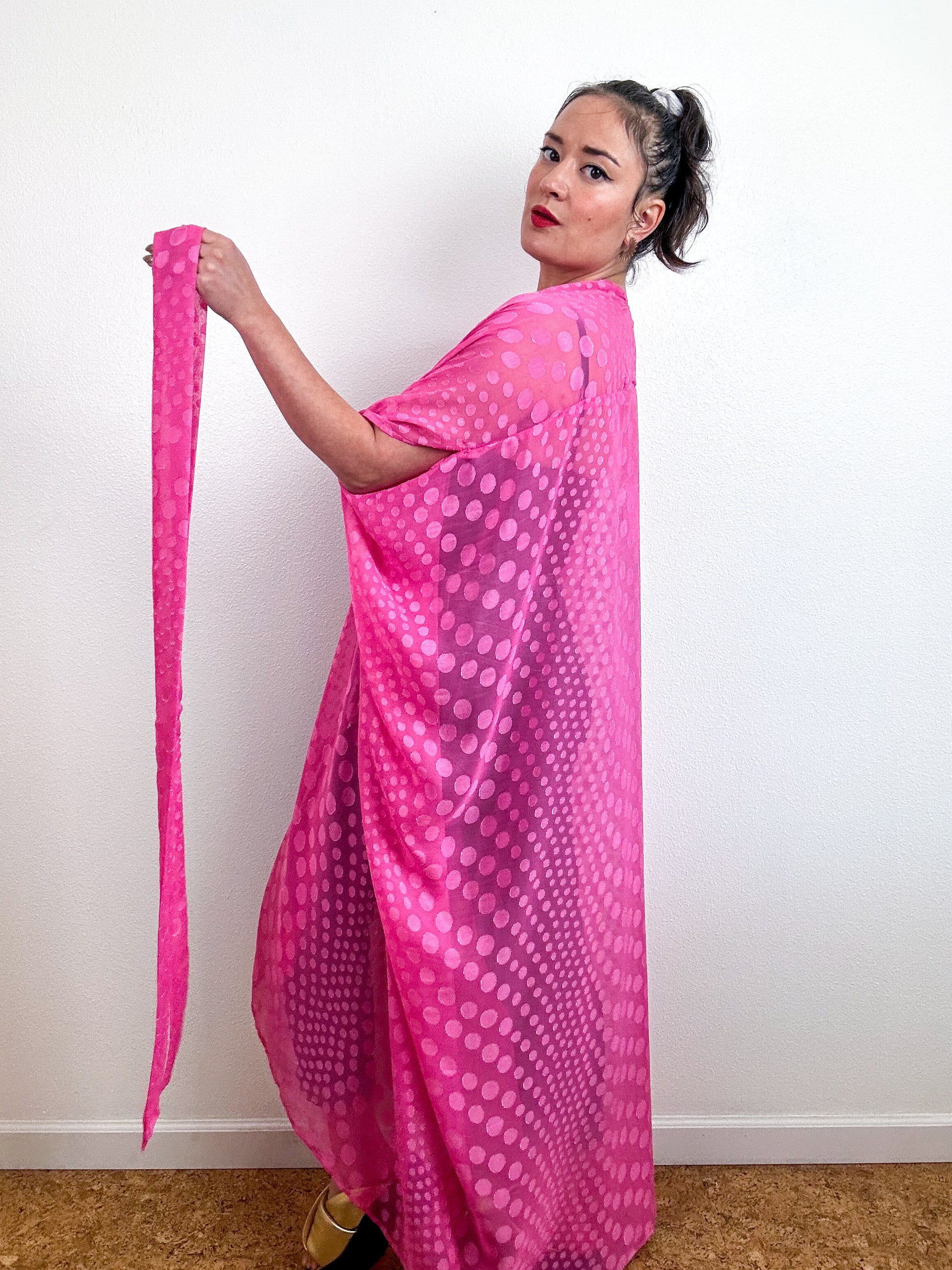 Light and airy kimono with a flowing silhouette, selvage sleeve detail, curved high low hem and optional waist tie. Versatile shape can be styled as a wrap dress, lightweight open layer, swimsuit coverup, or an elegant robe over lingerie. The minimalist design created from a full rectangle of fabric drapes beautifully over the shoulders and produces little to no material waste by utilizing one whole piece of fabric without scraps from corners and irregular cuts. Barbie pink textured dot chiffon fabric with a gorgeous sheer drape and silky smooth hand.
