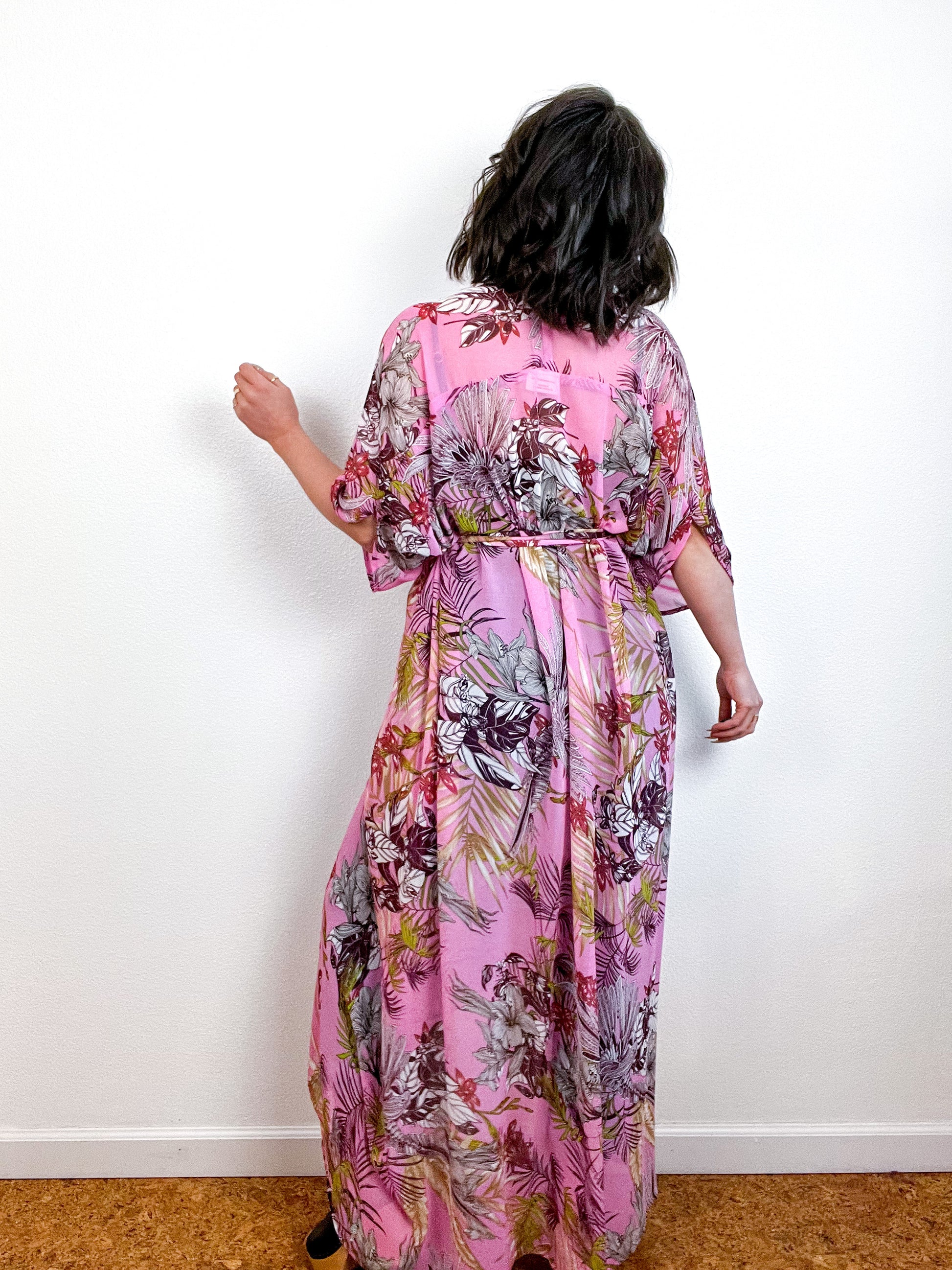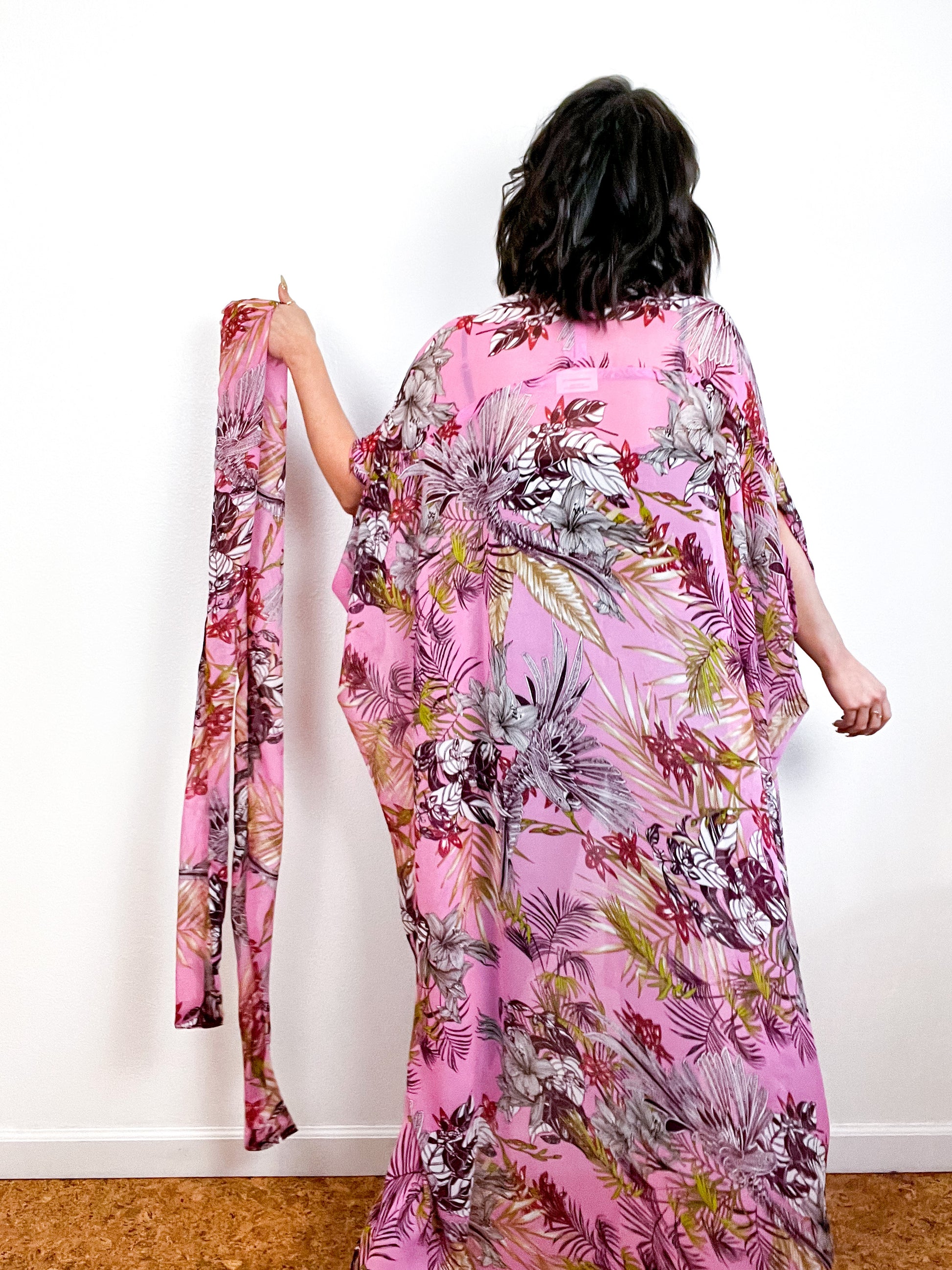 Light and airy kimono with a flowing silhouette, selvage sleeve detail, curved high low hem and optional waist tie. Versatile shape can be styled as a wrap dress, lightweight open layer, swimsuit coverup, or an elegant robe over lingerie. The minimalist design created from a full rectangle of fabric drapes beautifully over the shoulders and produces little to no material waste by utilizing one whole piece of fabric without scraps from corners and irregular cuts. Pink and green tropical floral print chiffon fabric with a gorgeous sheer drape and light crepe texture .