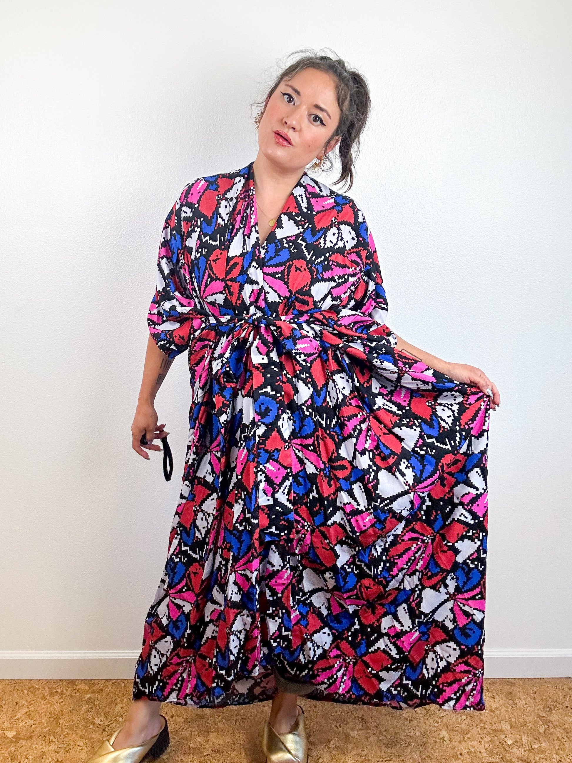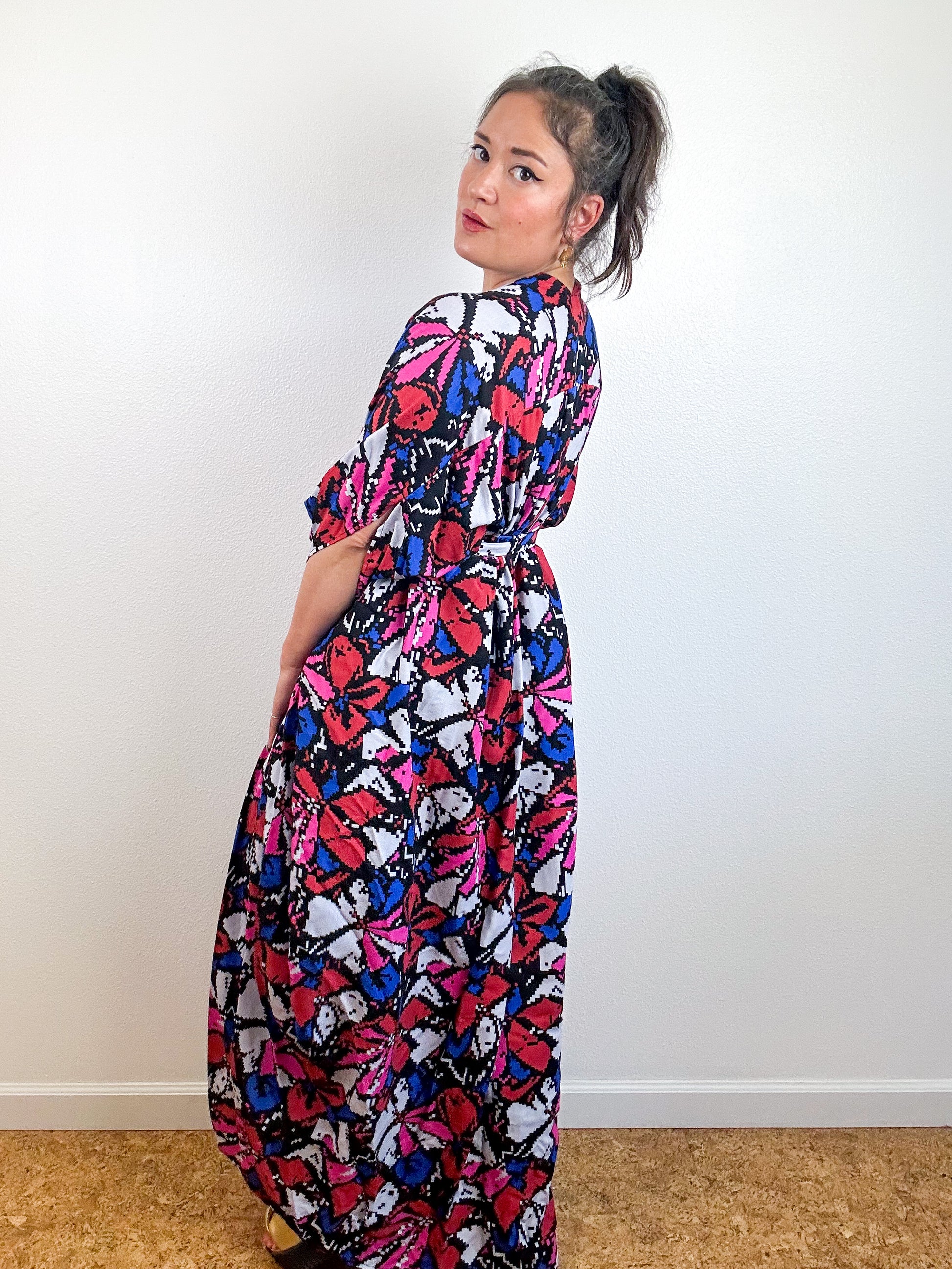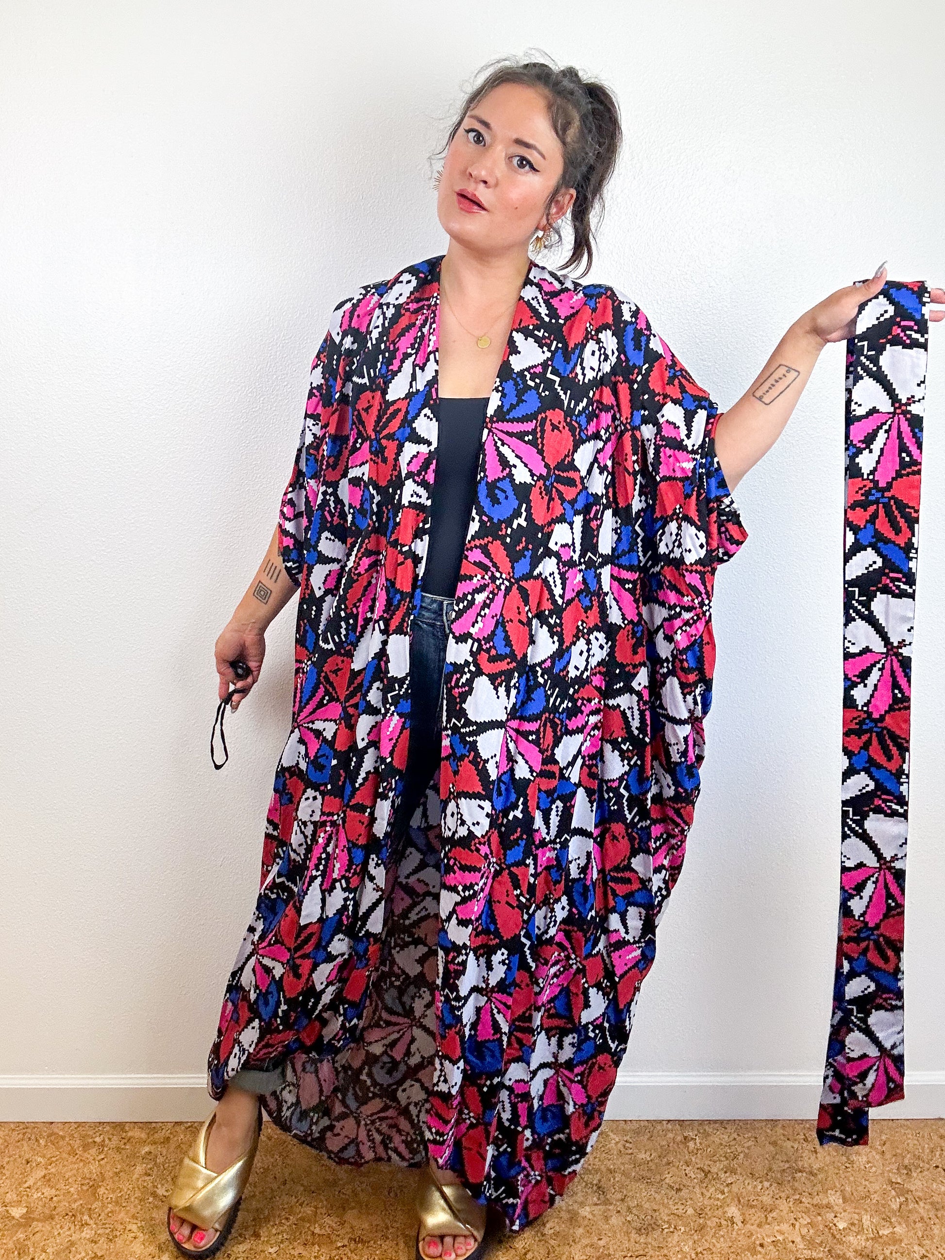 Light and airy kimono with a flowing silhouette, selvage sleeve detail, curved high low hem and optional waist tie. Versatile shape can be styled as a wrap dress, lightweight jacket over jeans, swimsuit coverup, or an elegant robe over lingerie. The minimalist design created from a full rectangle of fabric drapes beautifully over the shoulders and produces little to no material waste by utilizing one whole piece of fabric without scraps from corners and irregular cuts. Blue magenta pixels print rayon challis fabric with a silky smooth surface.