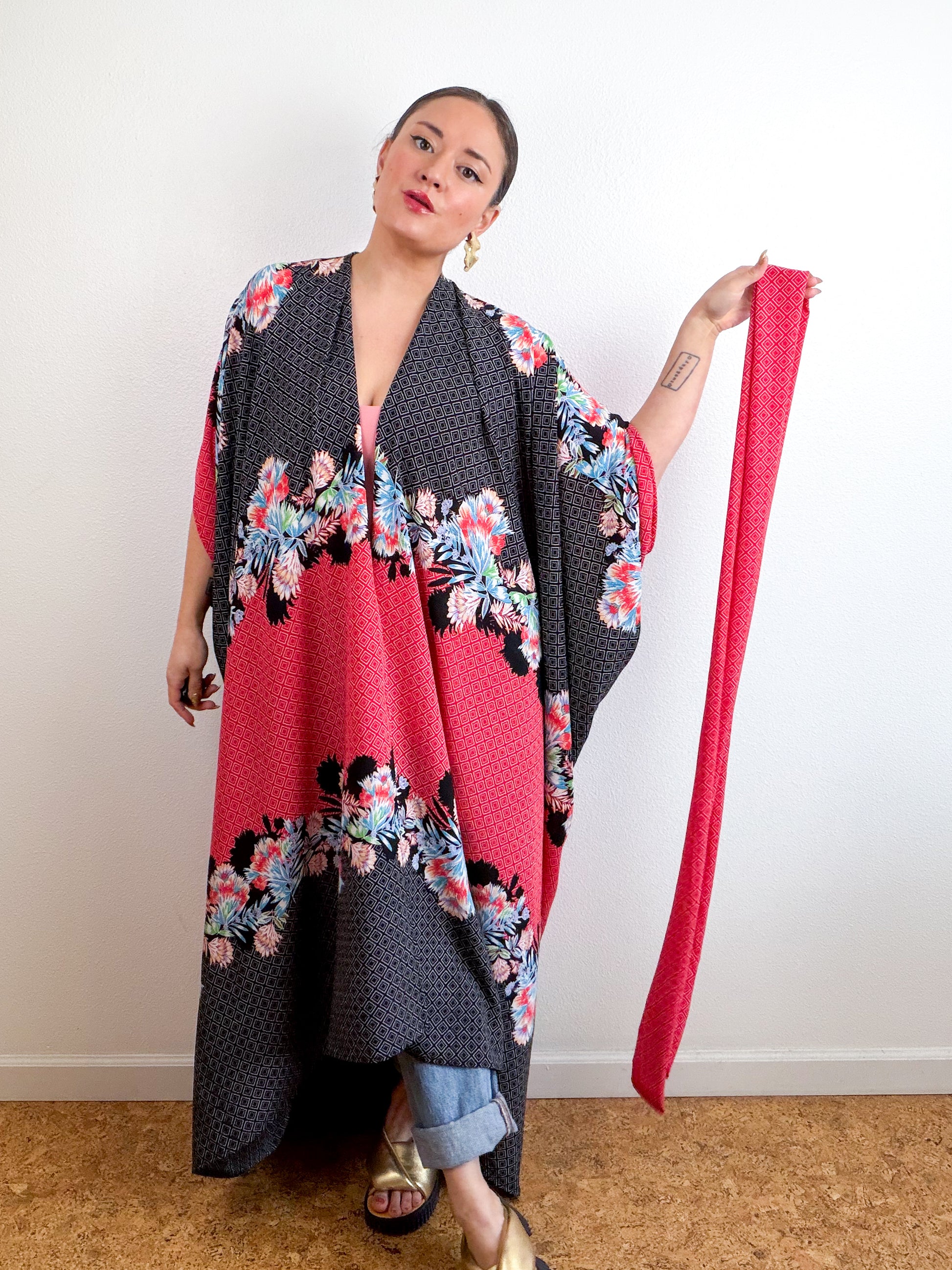 Light and airy kimono with a flowing silhouette, selvage sleeve detail, curved high low hem and optional waist tie. Versatile shape can be styled as a wrap dress, lightweight open layer, swimsuit coverup, or an elegant robe over lingerie. The minimalist design created from a full rectangle of fabric drapes beautifully over the shoulders and produces little to no material waste by utilizing one whole piece of fabric without scraps from corners and irregular cuts. Red and black tropical print fabric with a gorgeous flowy drape and textured hand.
