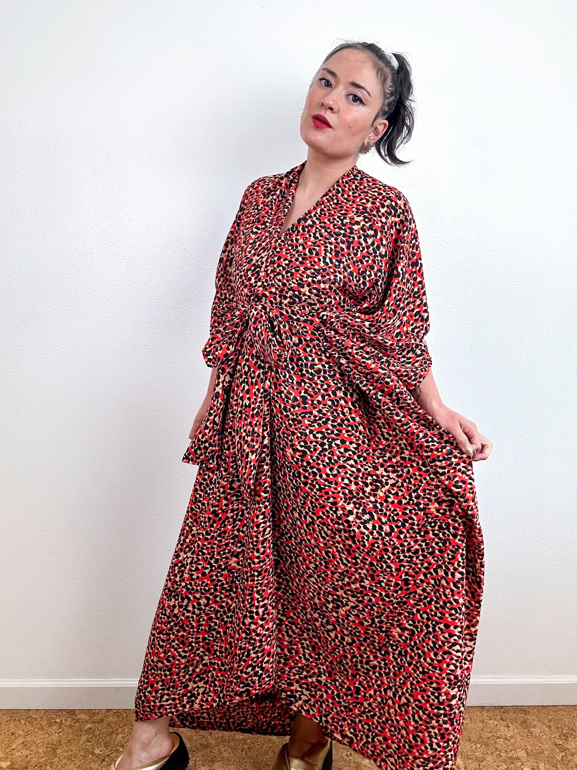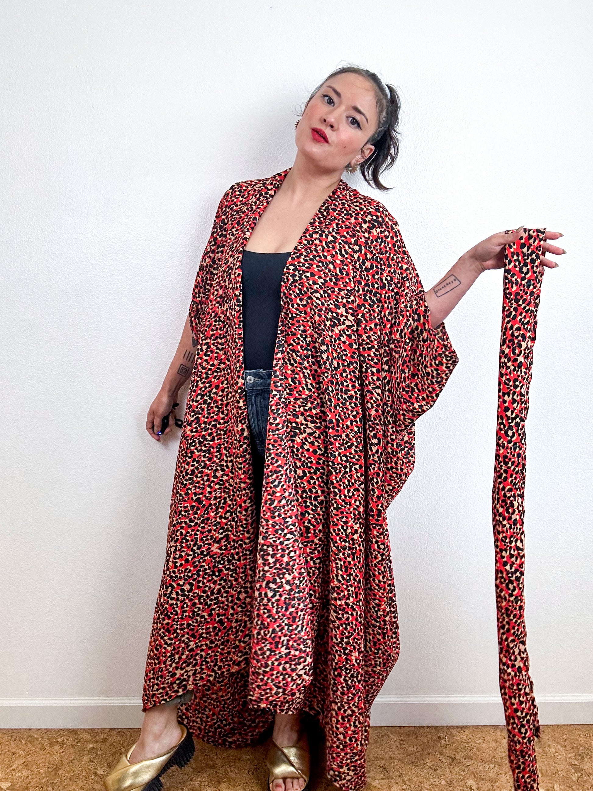 Light and airy kimono with a flowing silhouette, selvage sleeve detail, curved high low hem and optional waist tie. Versatile shape can be styled as a wrap dress, lightweight jacket over jeans, swimsuit coverup, or an elegant robe over lingerie. The minimalist design created from a full rectangle of fabric drapes beautifully over the shoulders and produces little to no material waste by utilizing one whole piece of fabric without scraps from corners and irregular cuts. Red leopard print crepe georgette fabric with a matte textured surface.