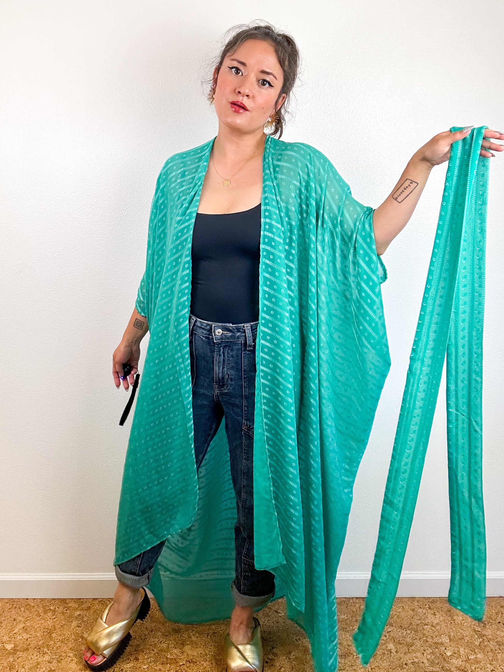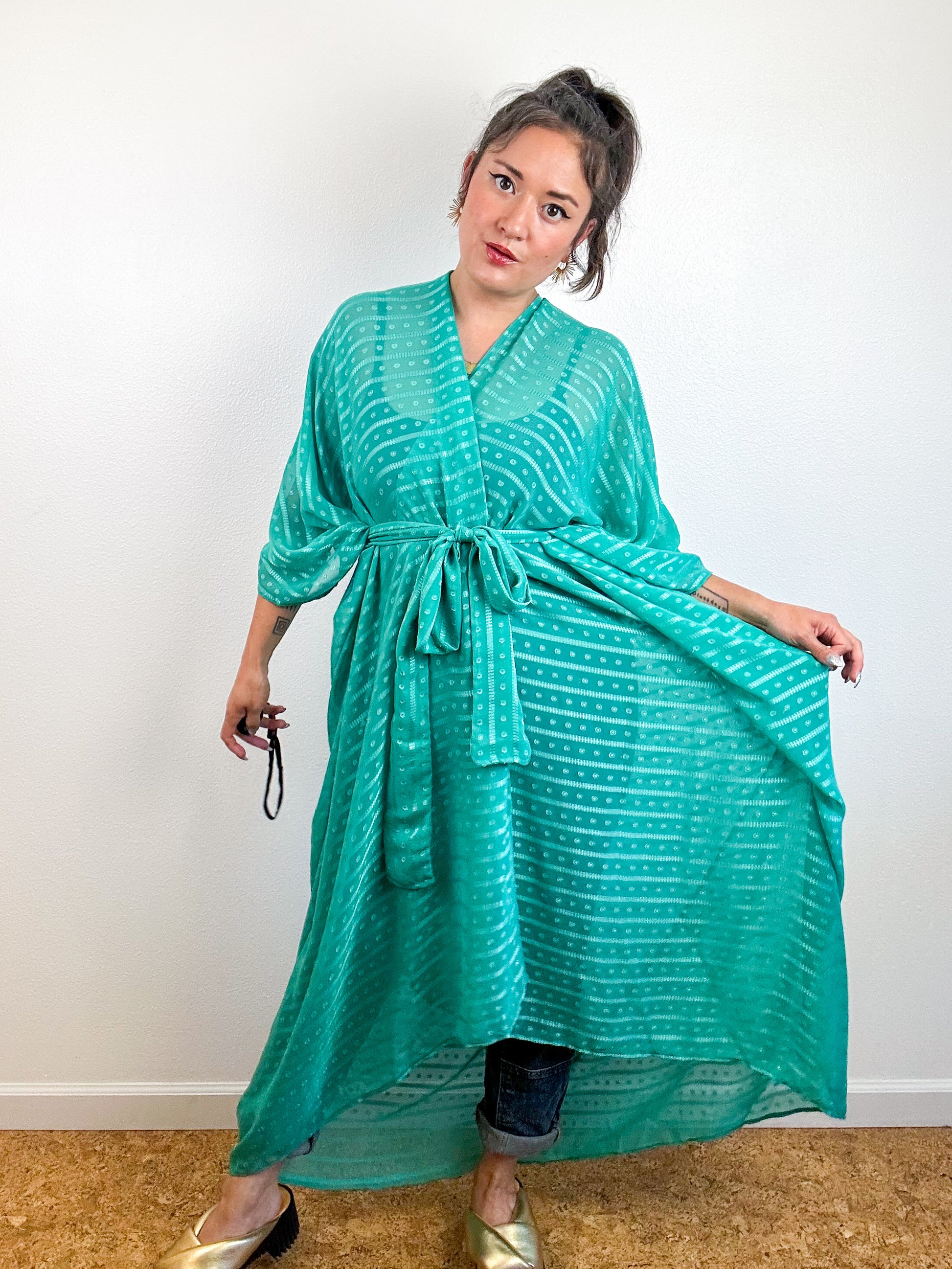Print High Low Kimono Seafoam Dots Stripes Chiffon