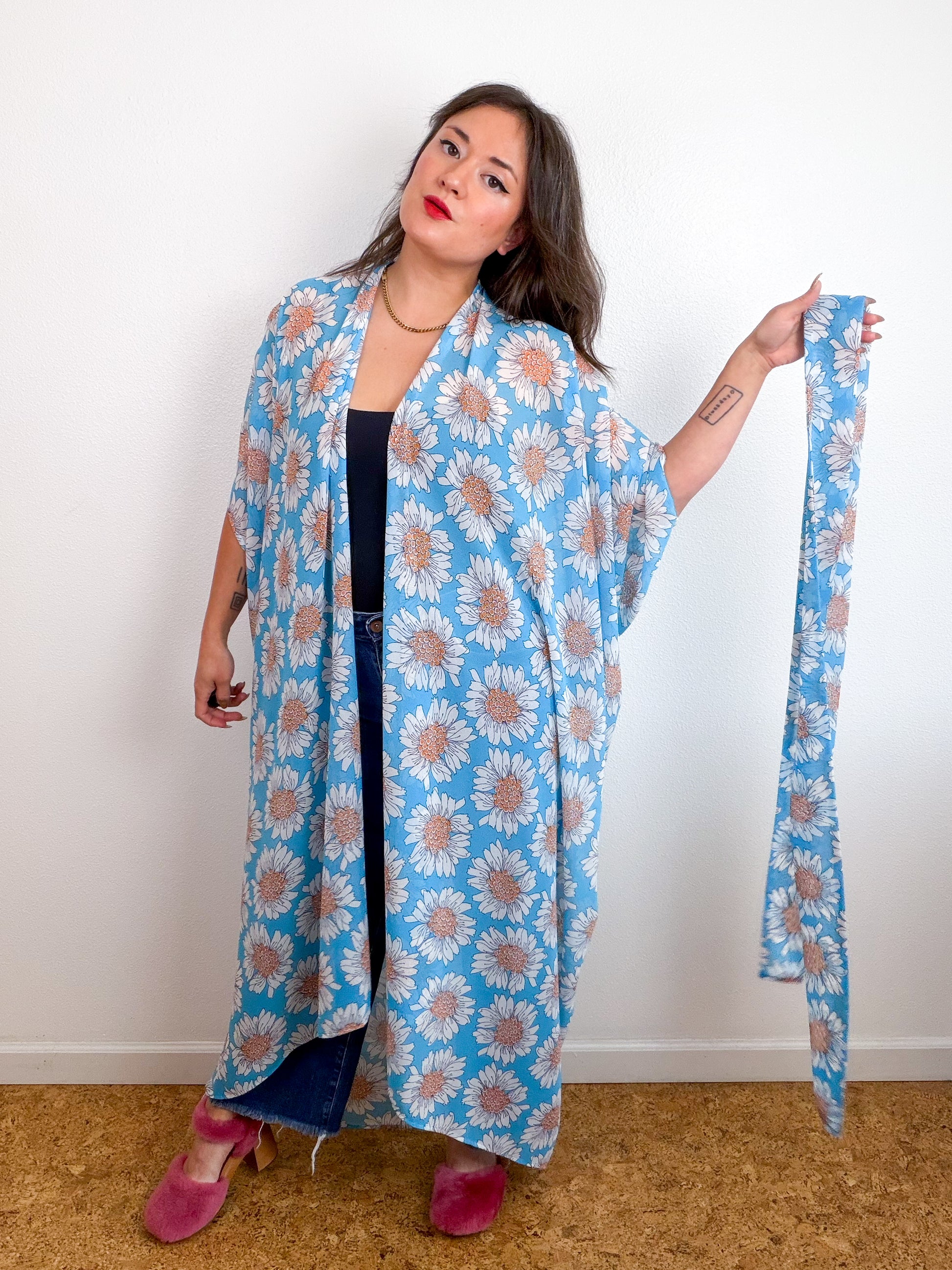 Light and airy kimono with a flowing silhouette, selvage sleeve detail, curved high low hem and optional waist tie. Versatile shape can be styled as a wrap dress, lightweight open layer, swimsuit coverup, or an elegant robe over lingerie. The minimalist design created from a full rectangle of fabric drapes beautifully over the shoulders and produces little to no material waste by utilizing one whole piece of fabric without scraps from corners and irregular cuts. Turquoise orange floral print chiffon fabric with a gorgeous sheer drape and textured hand.