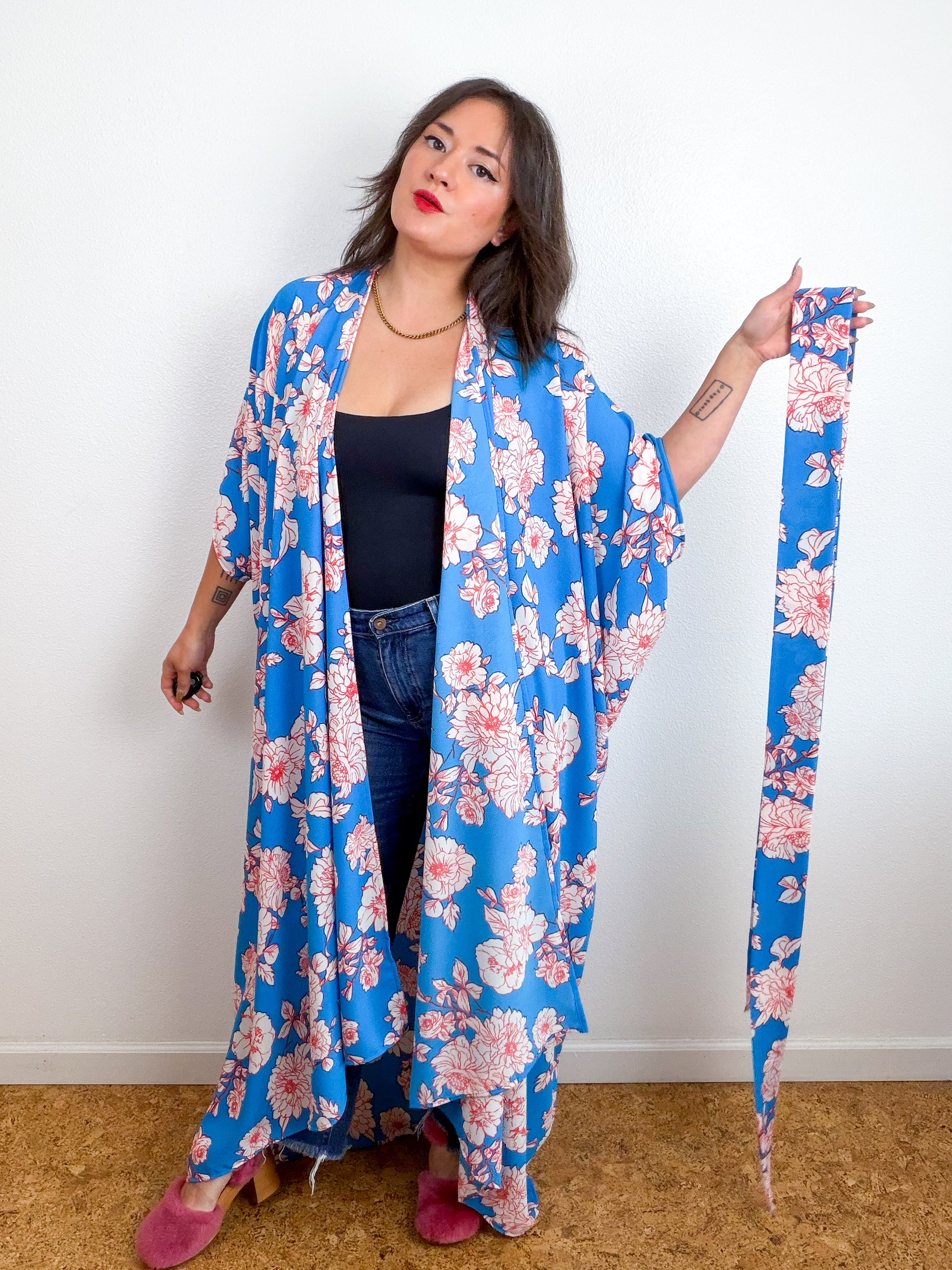 Light and airy kimono with a flowing silhouette, selvage sleeve detail, curved high low hem and optional waist tie. Versatile shape can be styled as a wrap dress, lightweight open layer, swimsuit coverup, or an elegant robe over lingerie. The minimalist design created from a full rectangle of fabric drapes beautifully over the shoulders and produces little to no material waste by utilizing one whole piece of fabric without scraps from corners and irregular cuts. Orange and turquoise floral print fabric with a gorgeous flowy drape and textured hand.